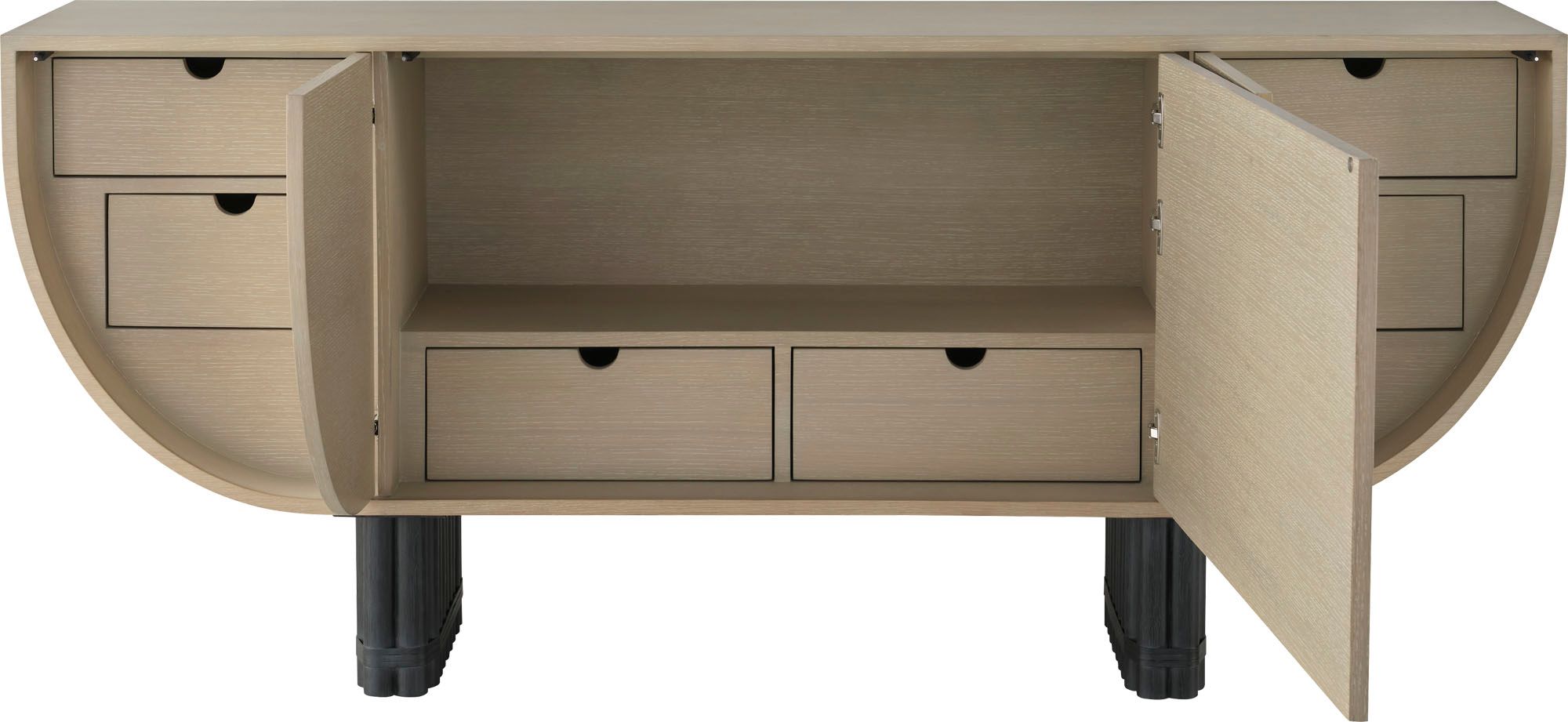 The Aruba Credenza is a stunning piece with multiple design influences, including neo-Classicism, Art Deco and postmodernism. The credenza resembles a boat gently rocking and swaying on the waters of the Caribbean.