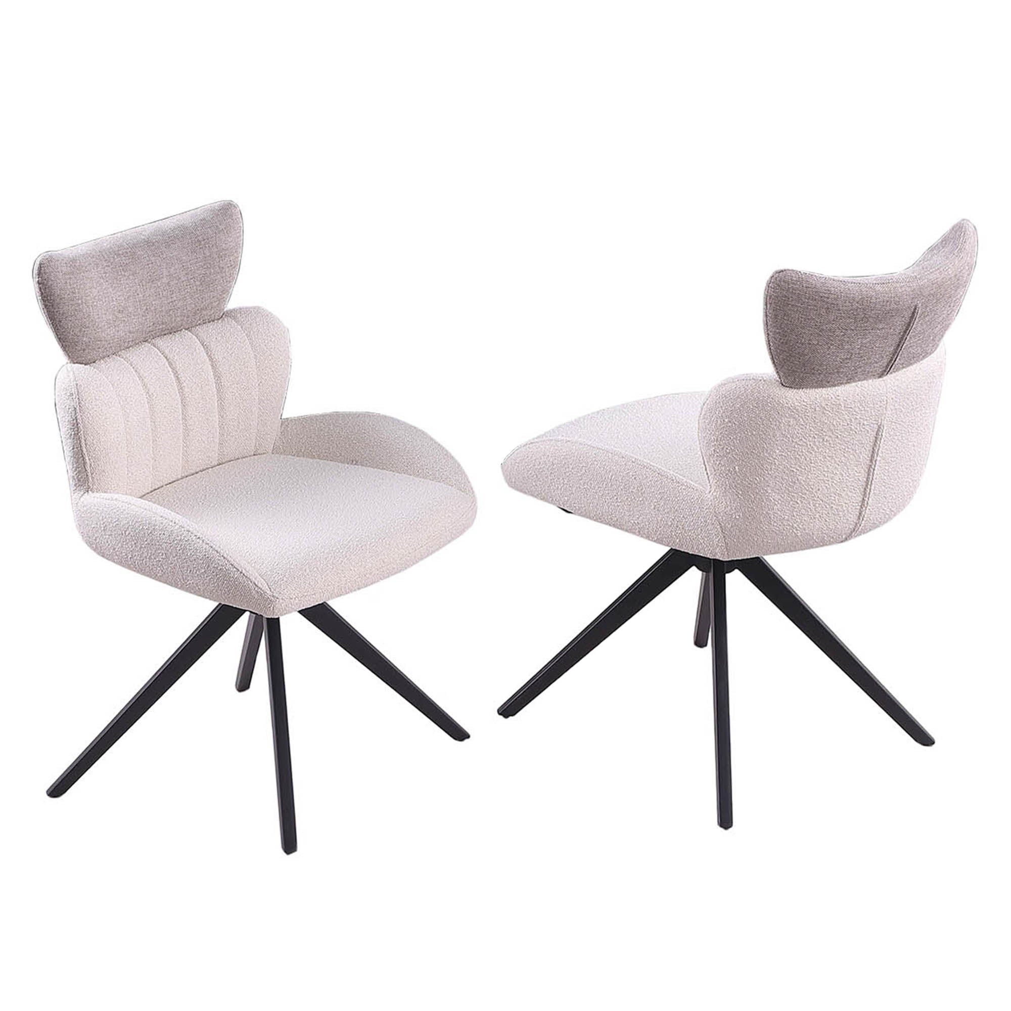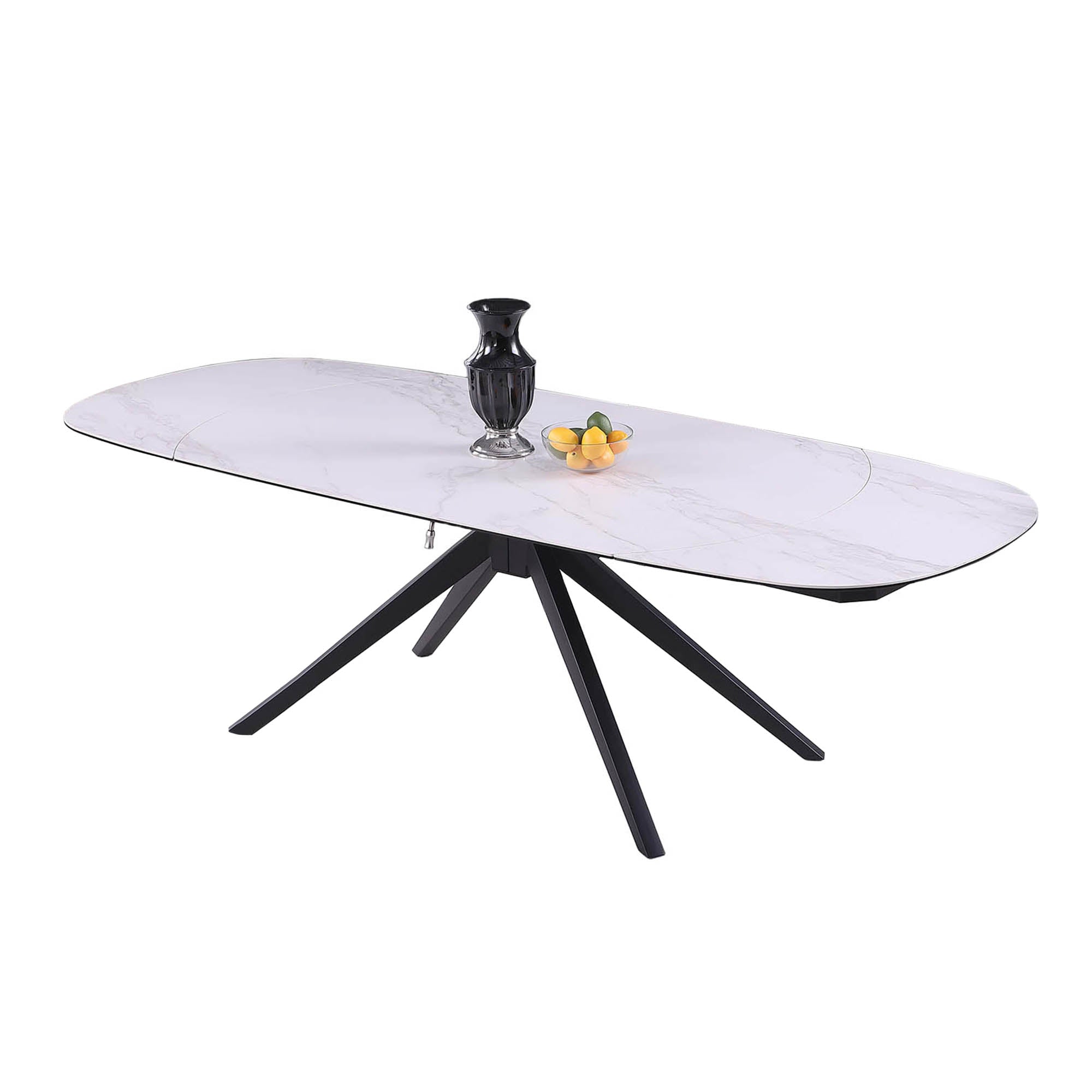 Embrace contemporary design with this artful and functional expanding ceramic dining table and matching dining chairs. A unique marbleized ceramic top opens to approximately 95”, enough to comfortably welcome the whole party around. Resting atop a pronged steel base in a matte black finish, this dining table matches the corresponding dining chairs in form and function. The chairs feature plush cushion enveloping seating, with lumbar support and a plentiful headrest, all finished in white and grey fabric and matching slender matte black steel legs.