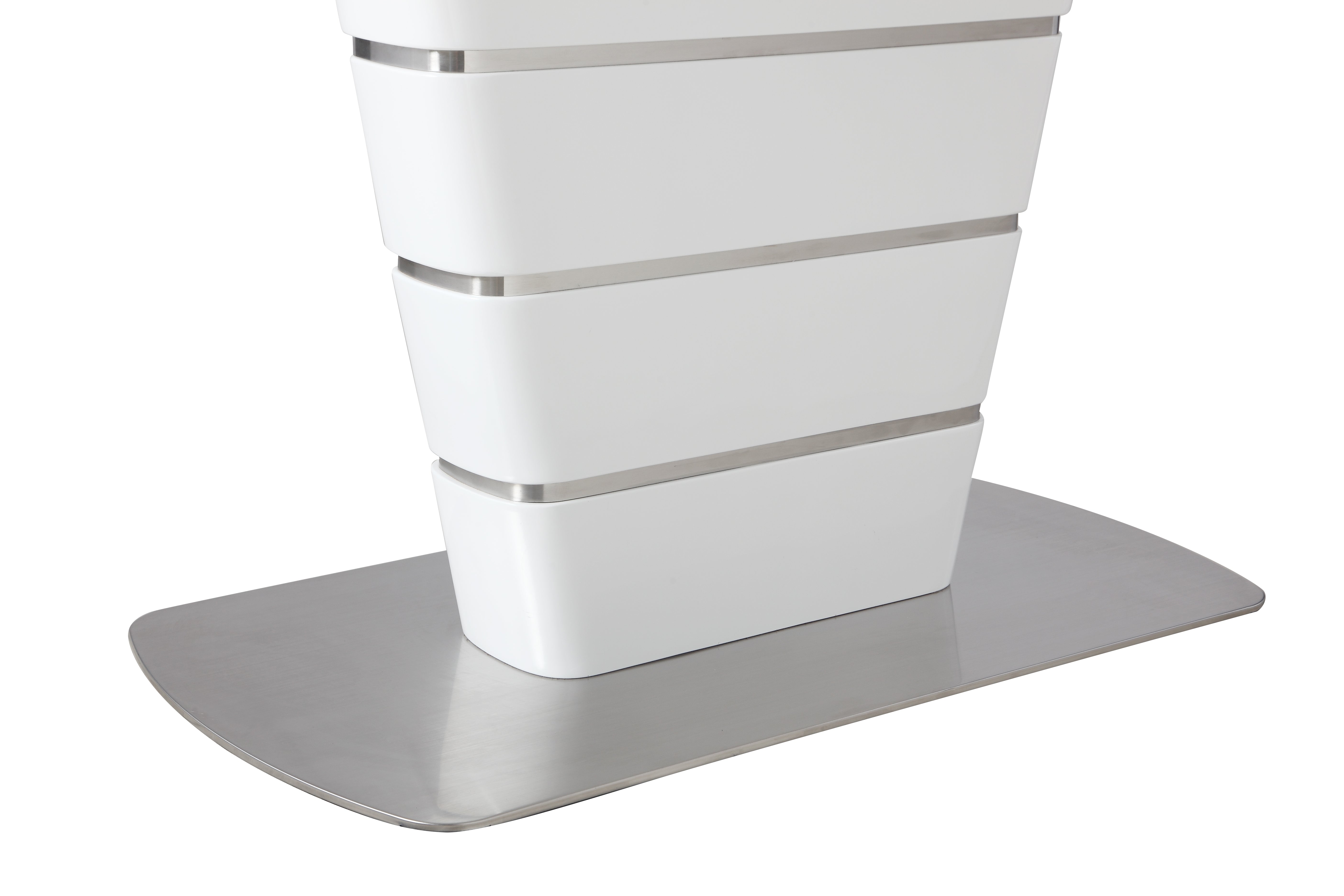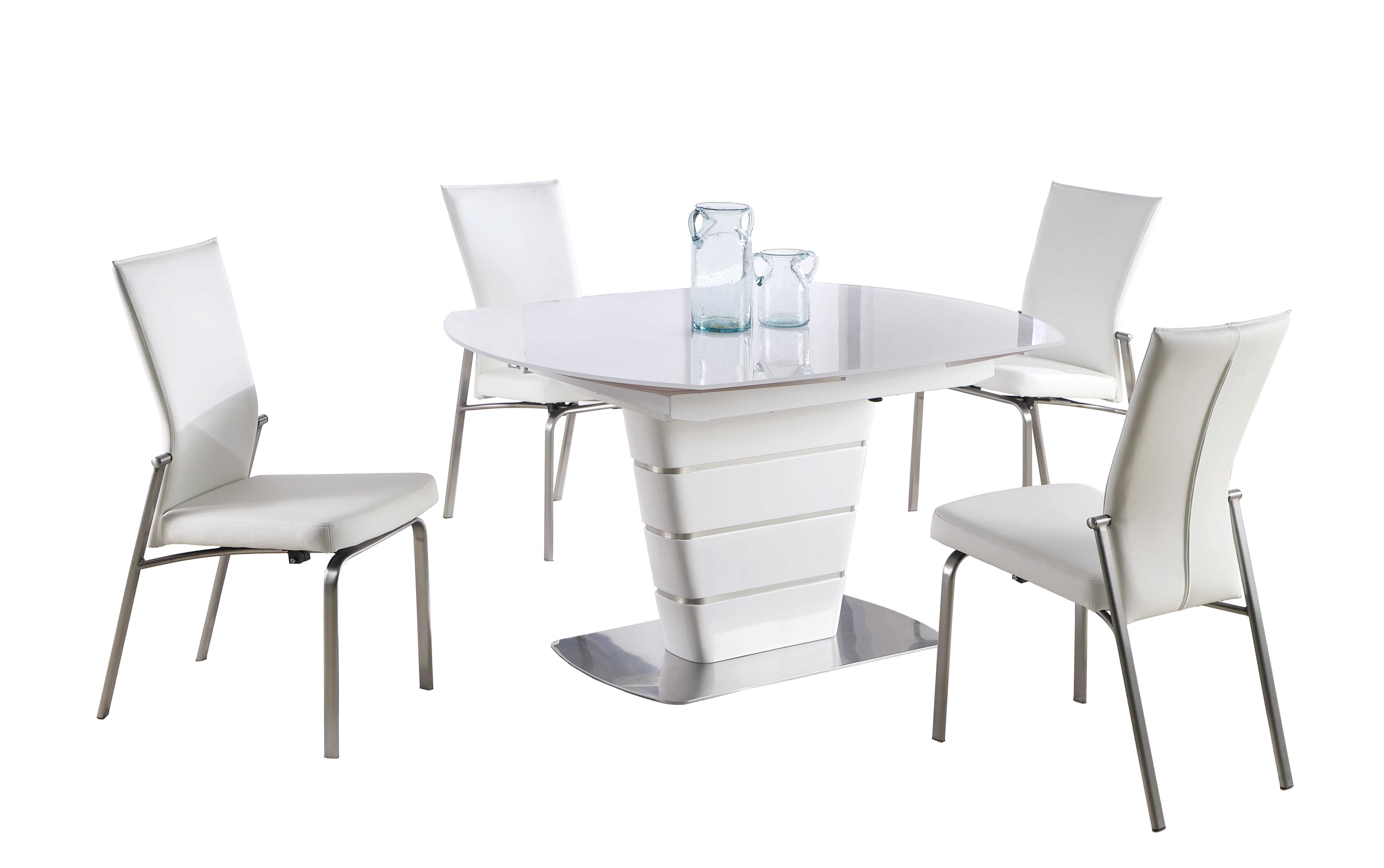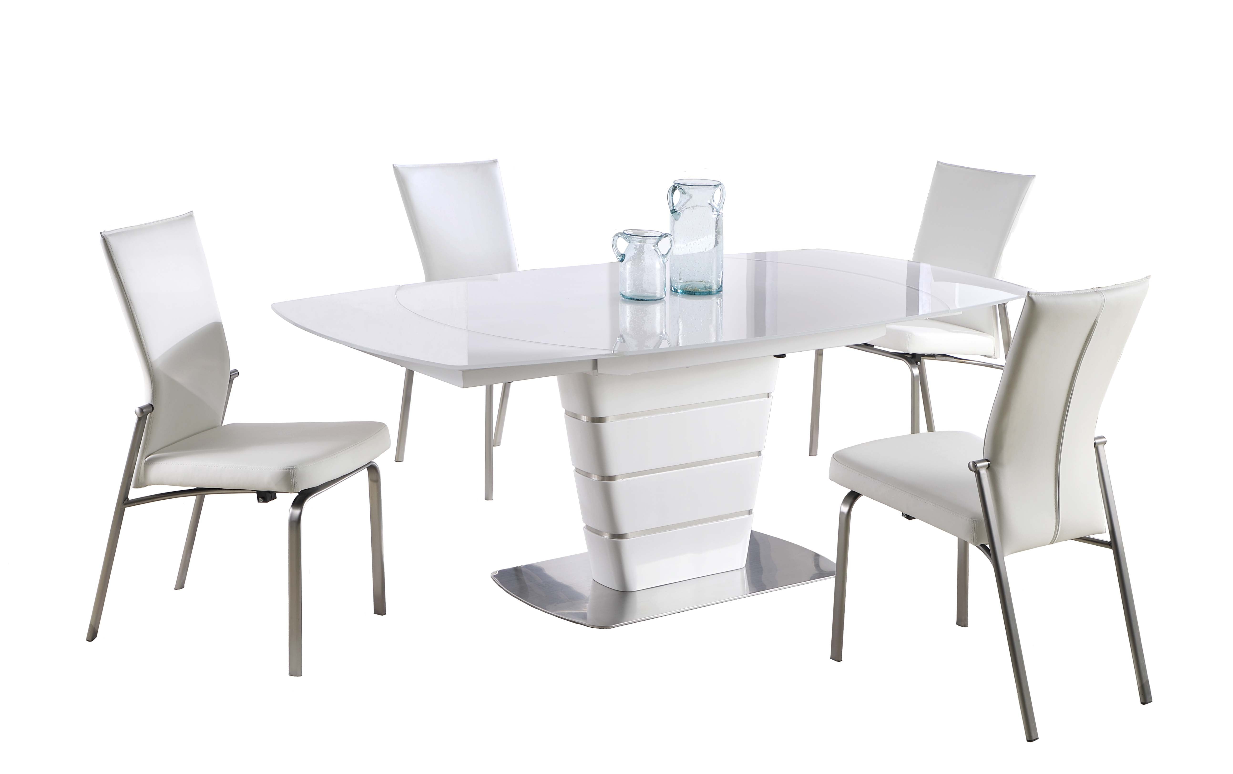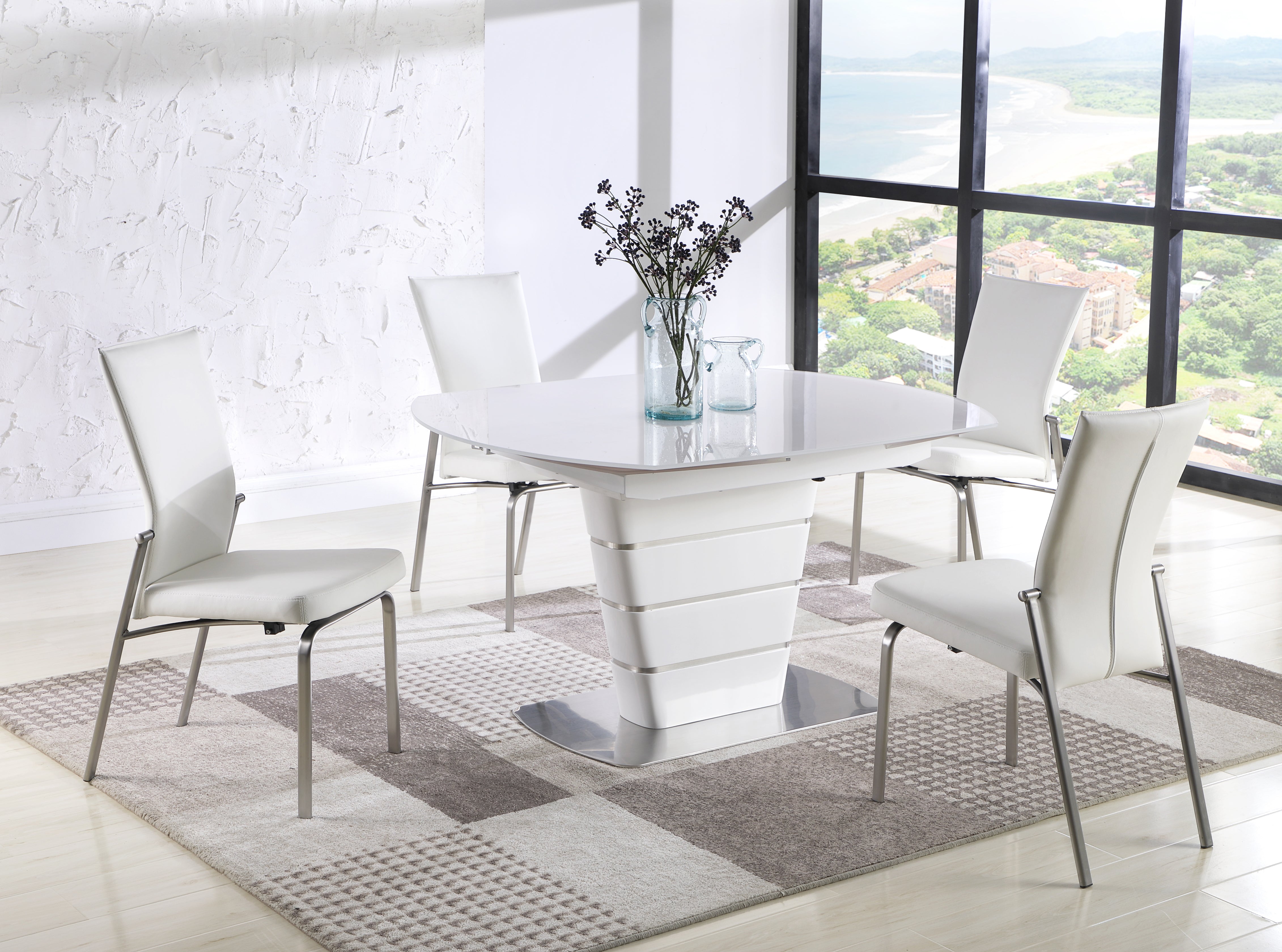 This contemporary, 5-piece dining set includes an extendable, white, tempered starphire glass top, a tapered, gloss white finished pedestal with stainless steel accents & 4 motion-back chairs w/ faux leather and accent zipper on the backrest.