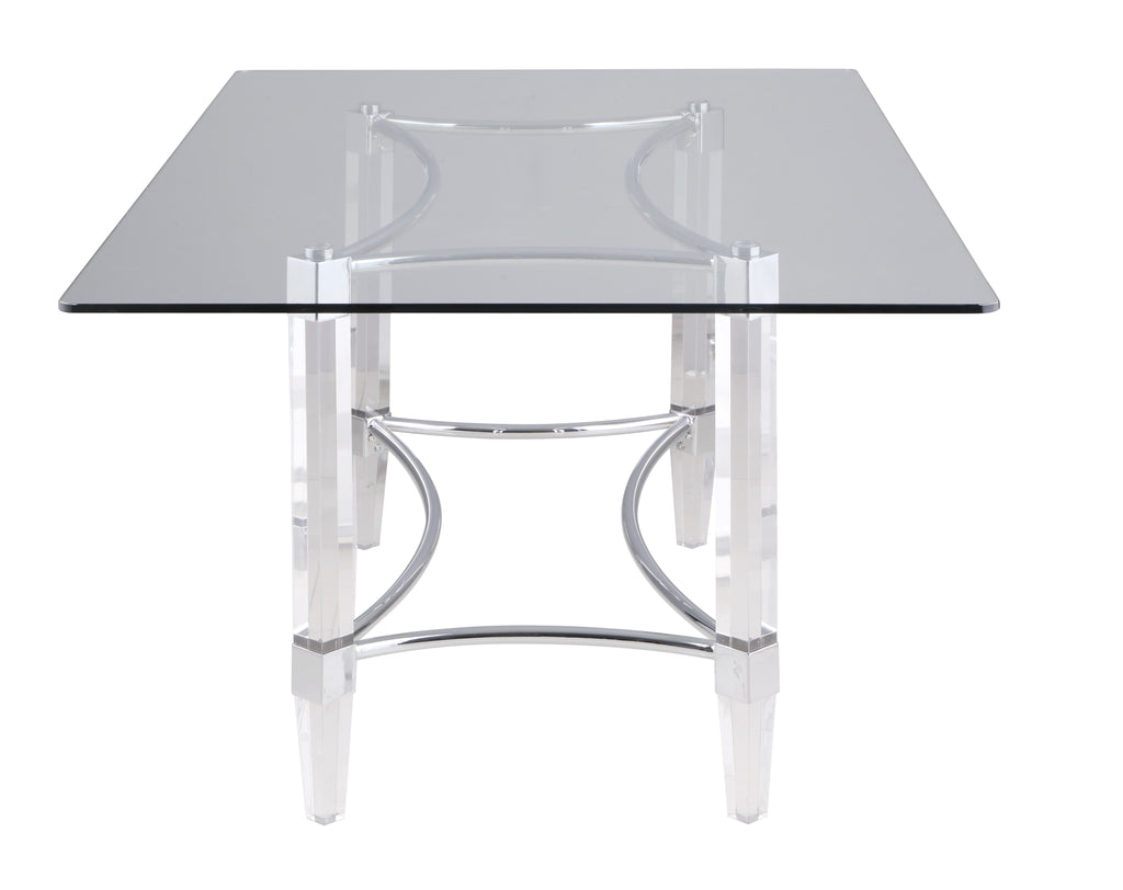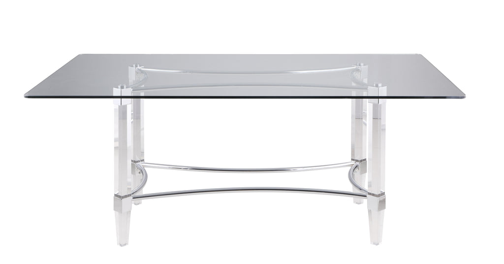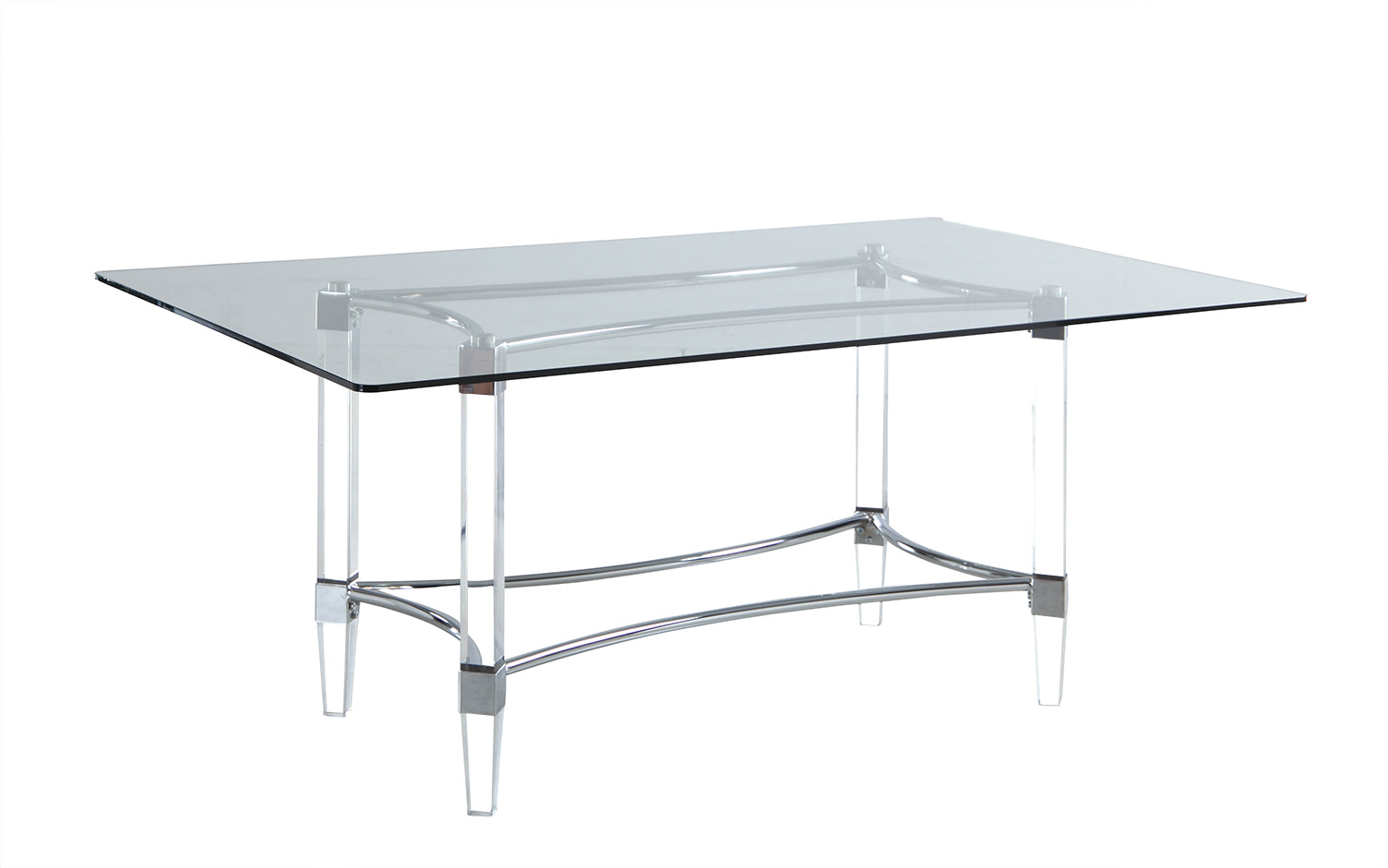 This contemporary rectangular dining room table features a 36"x 60" rectangular tempered glass top on a chrome frame with clear, thick, solid acrylic legs.