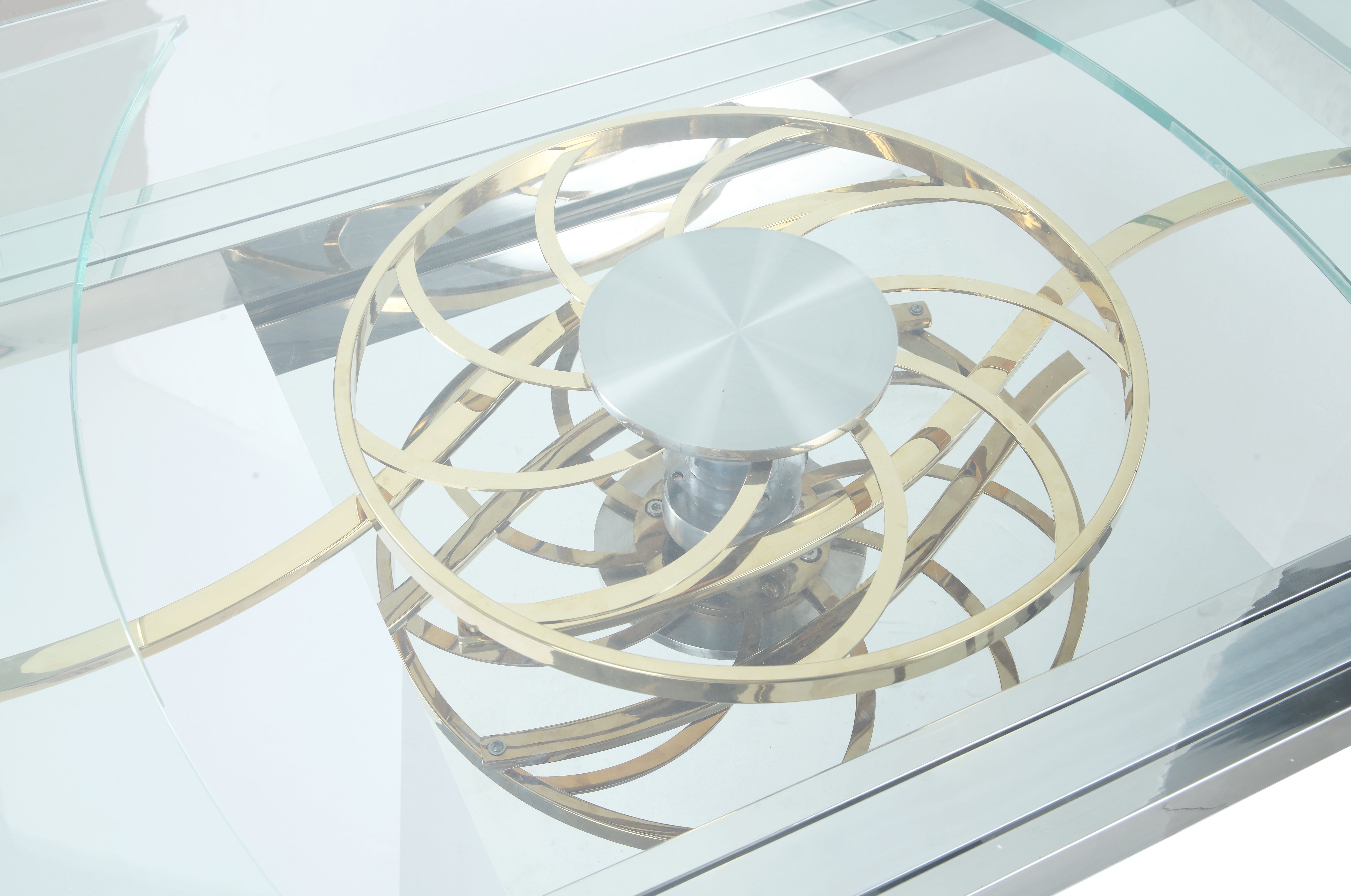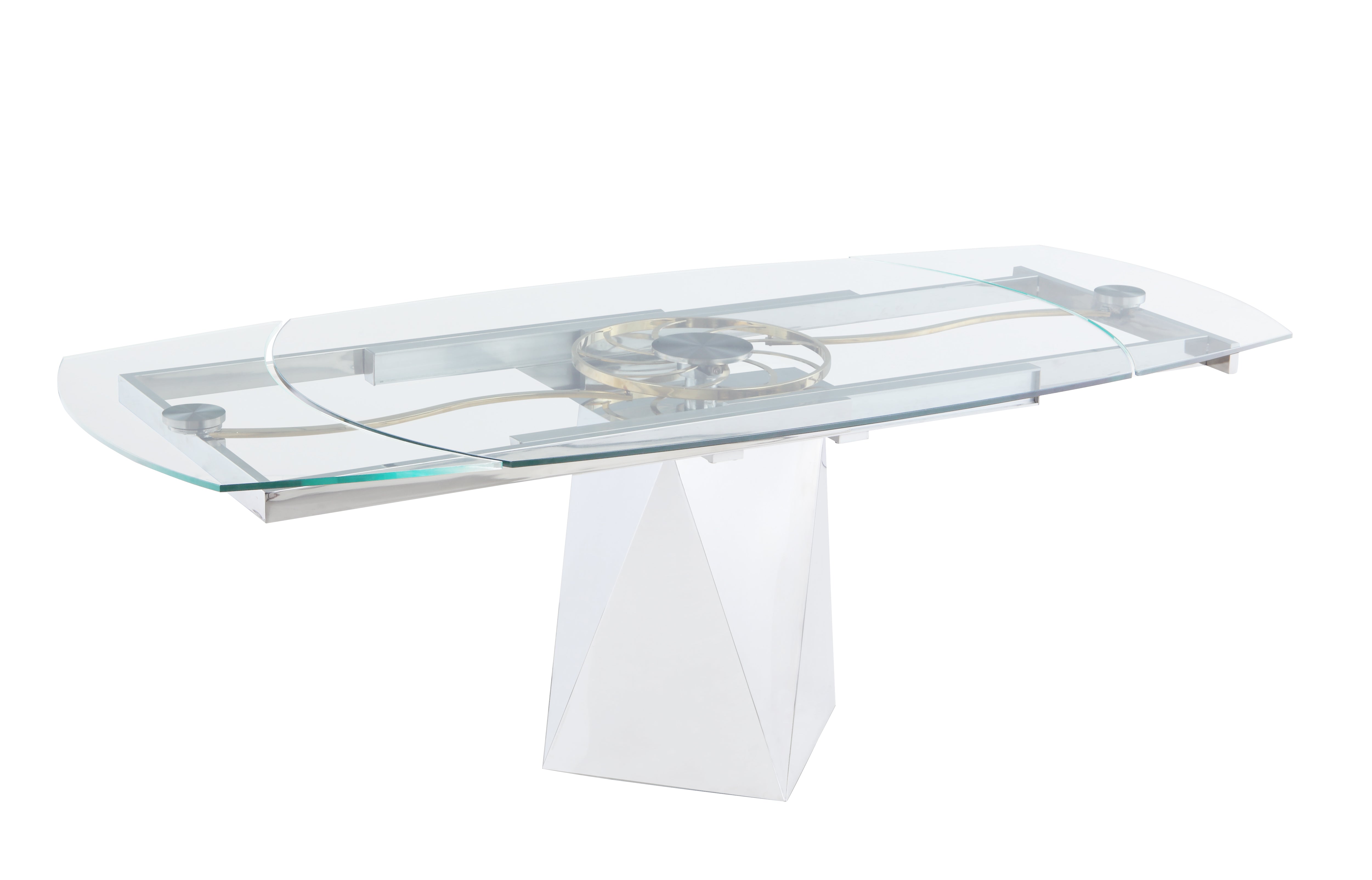 This contemporary dining set features a 39" x 59" glass table top w/ a rotatable motion extension that opens to 86", gold-accented self-guided tracks, a prism pedestal base & 4 tall back side chairs w/ double stitching & decorative piping.