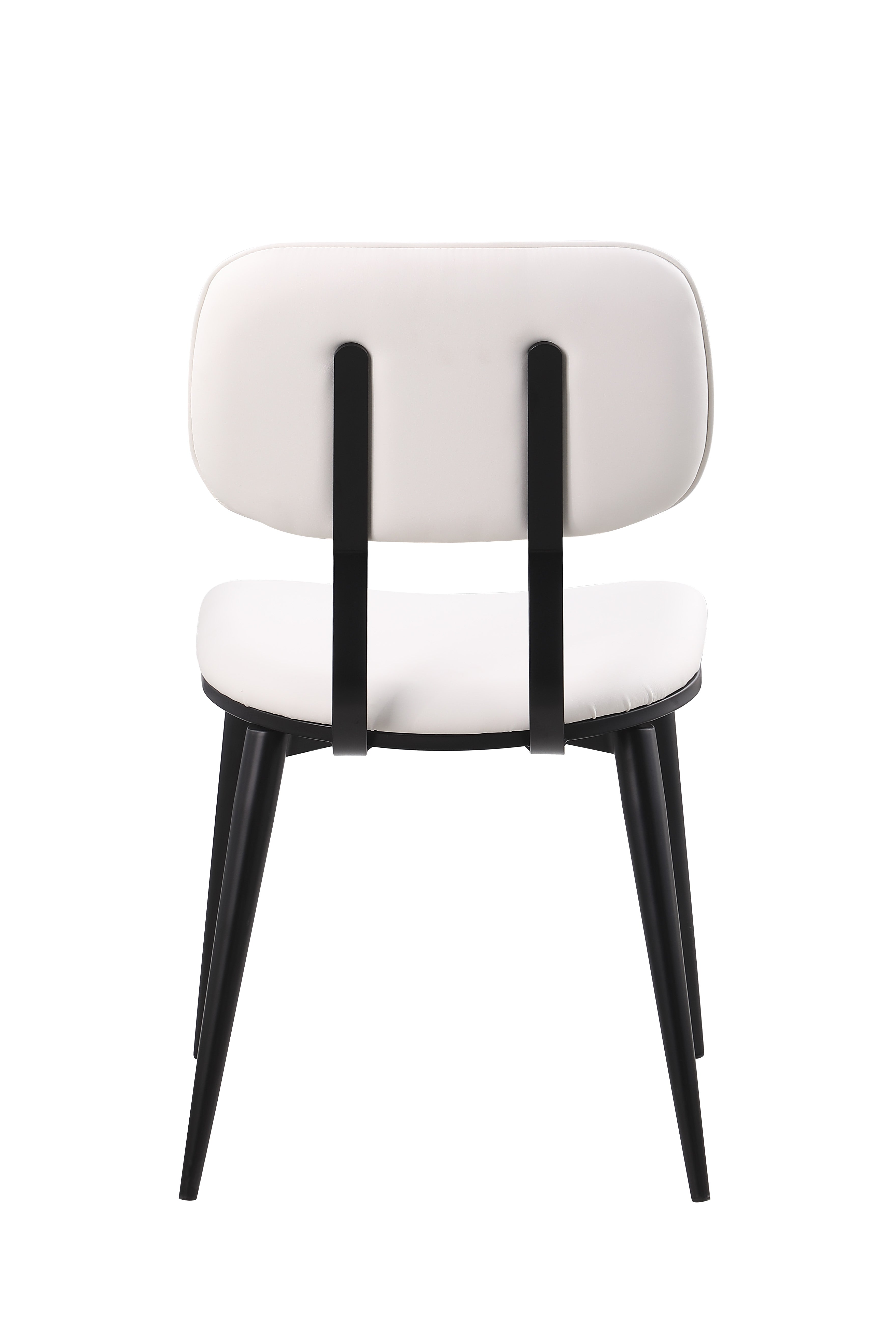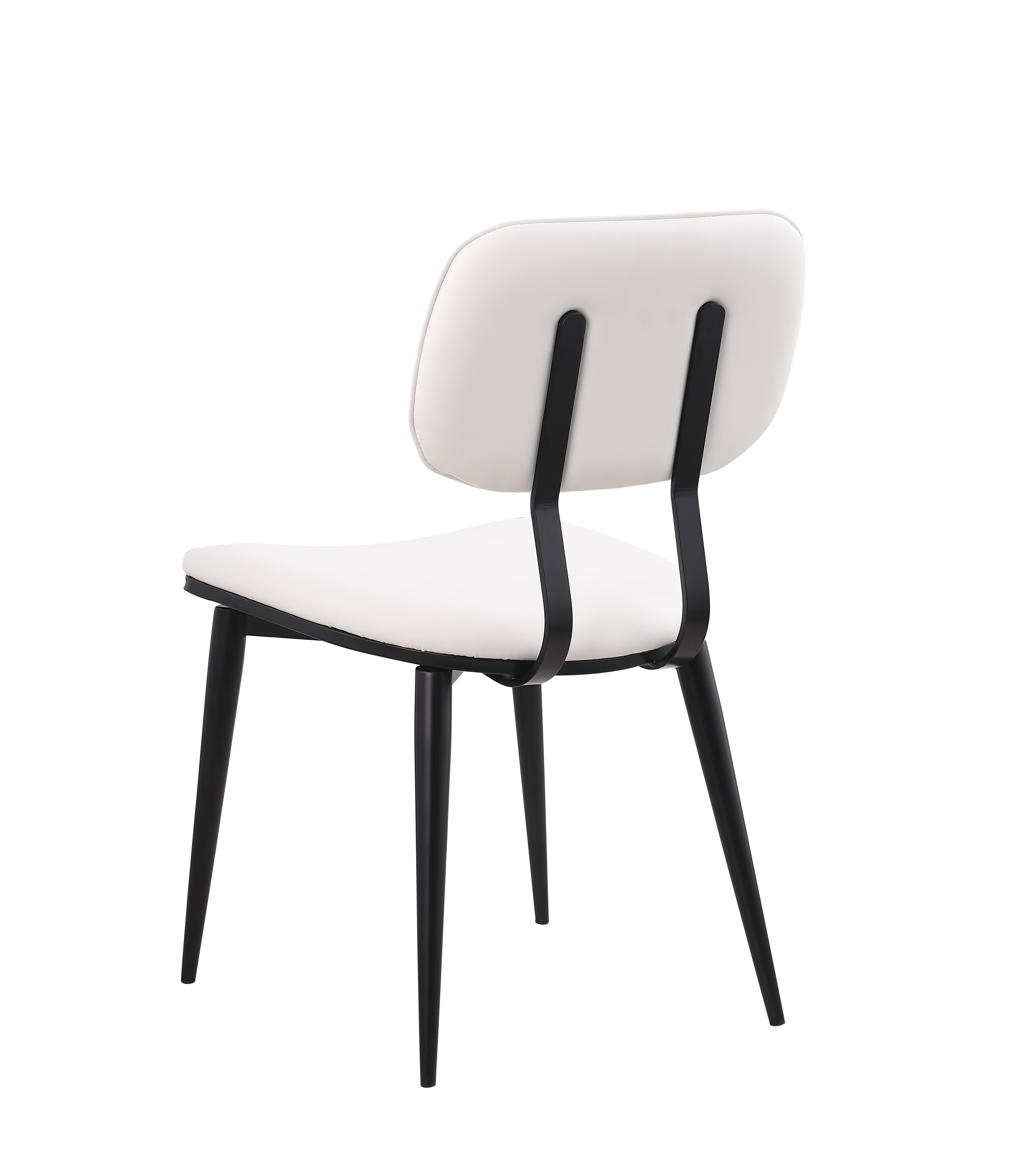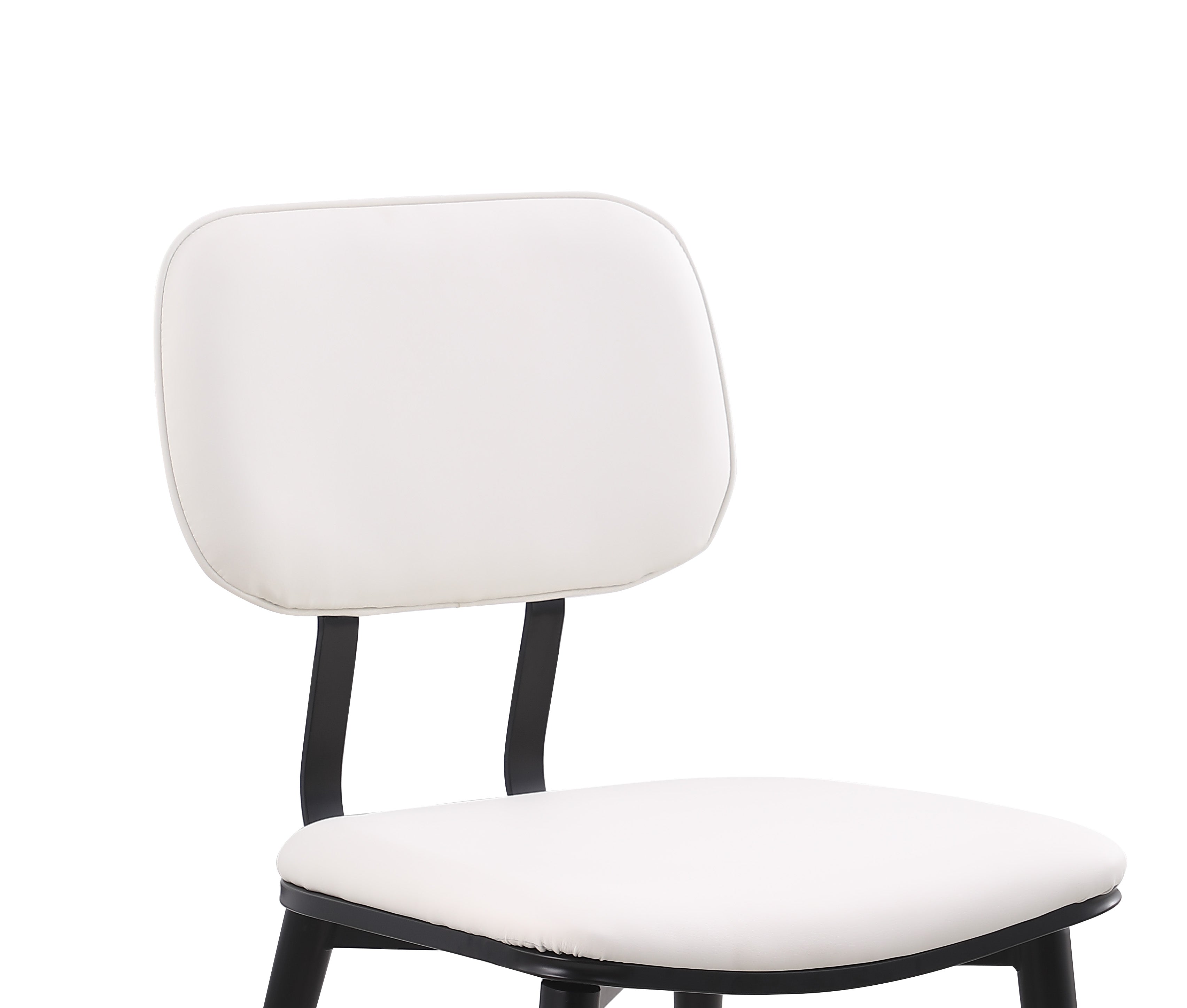 Start a conversation with this contemporary side chair with a chic open back design, upholstered in high-quality white faux leather for a sleek and updated look. The matte black steel legs provide a timeless base and add an edgy contrast to the overall design. Perfect for any interior, this chair offers comfort and style that will impress any guest.