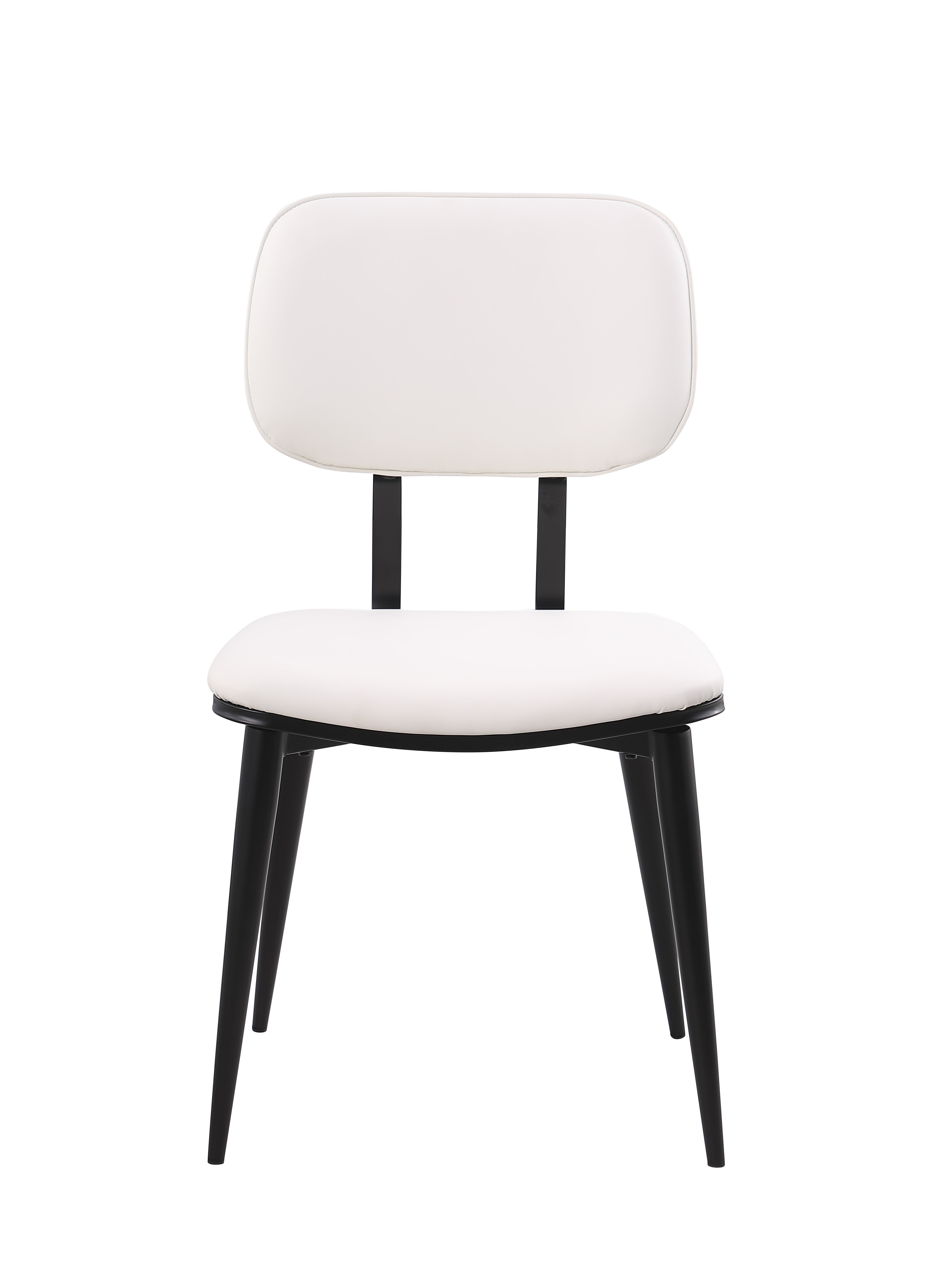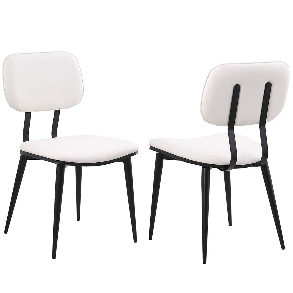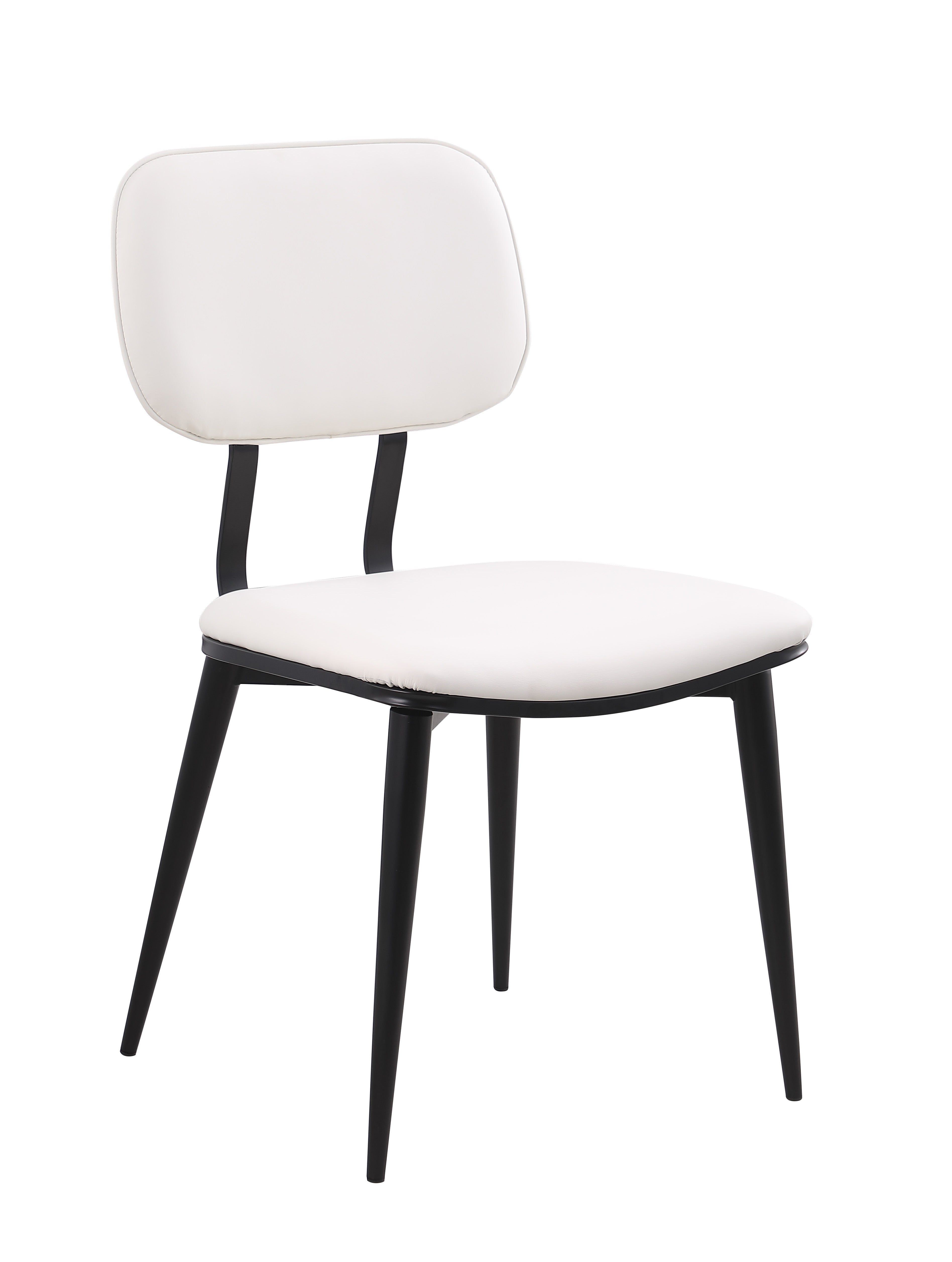 Start a conversation with this contemporary side chair with a chic open back design, upholstered in high-quality white faux leather for a sleek and updated look. The matte black steel legs provide a timeless base and add an edgy contrast to the overall design. Perfect for any interior, this chair offers comfort and style that will impress any guest.