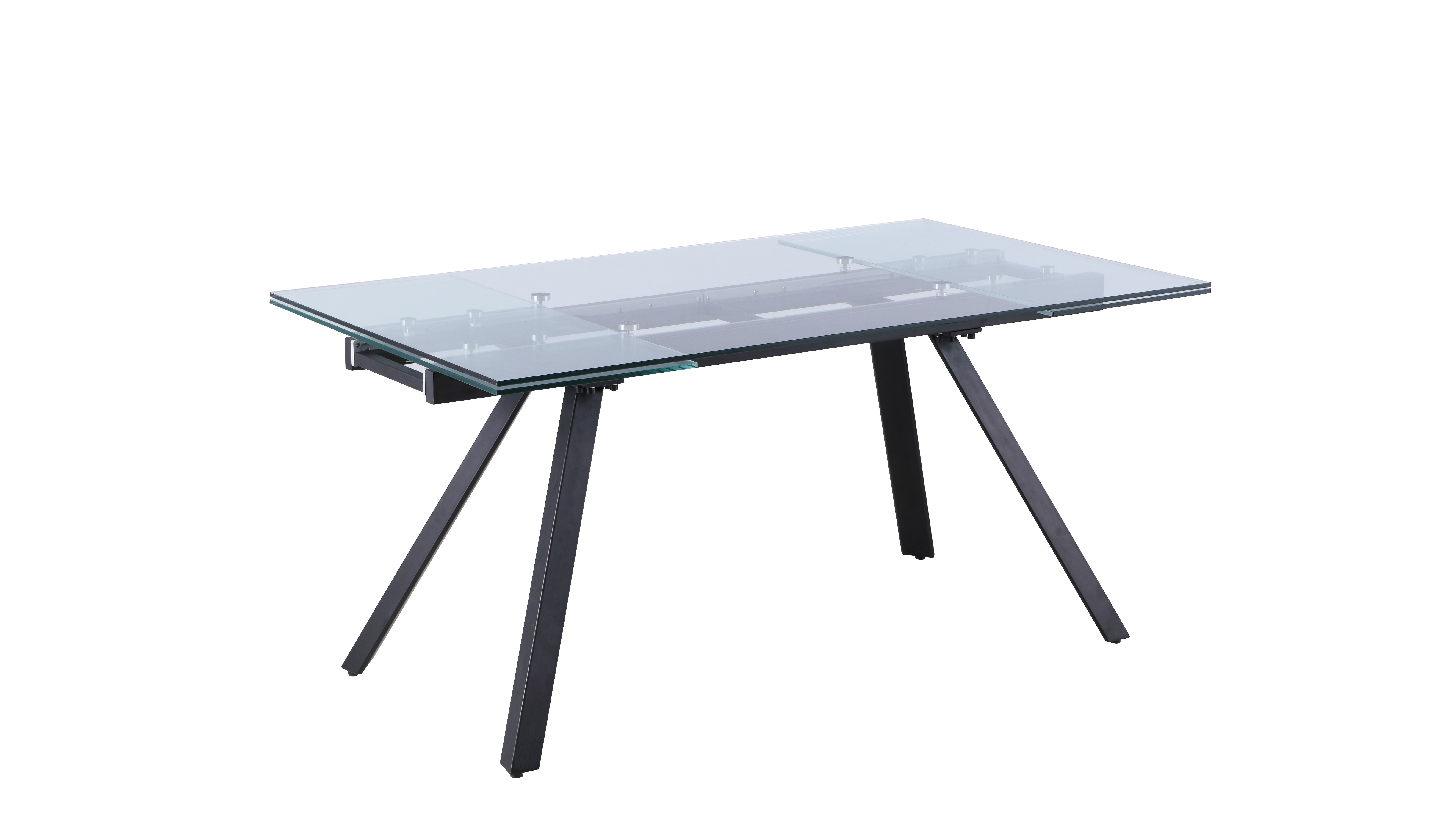 With beautiful matching finishes, this set will greatly enhance your dining room. It features a 3/8" clear tempered glass table with 2 extensions, flat polished edge and matte black finish, along with the curved ash upholstered side chair.