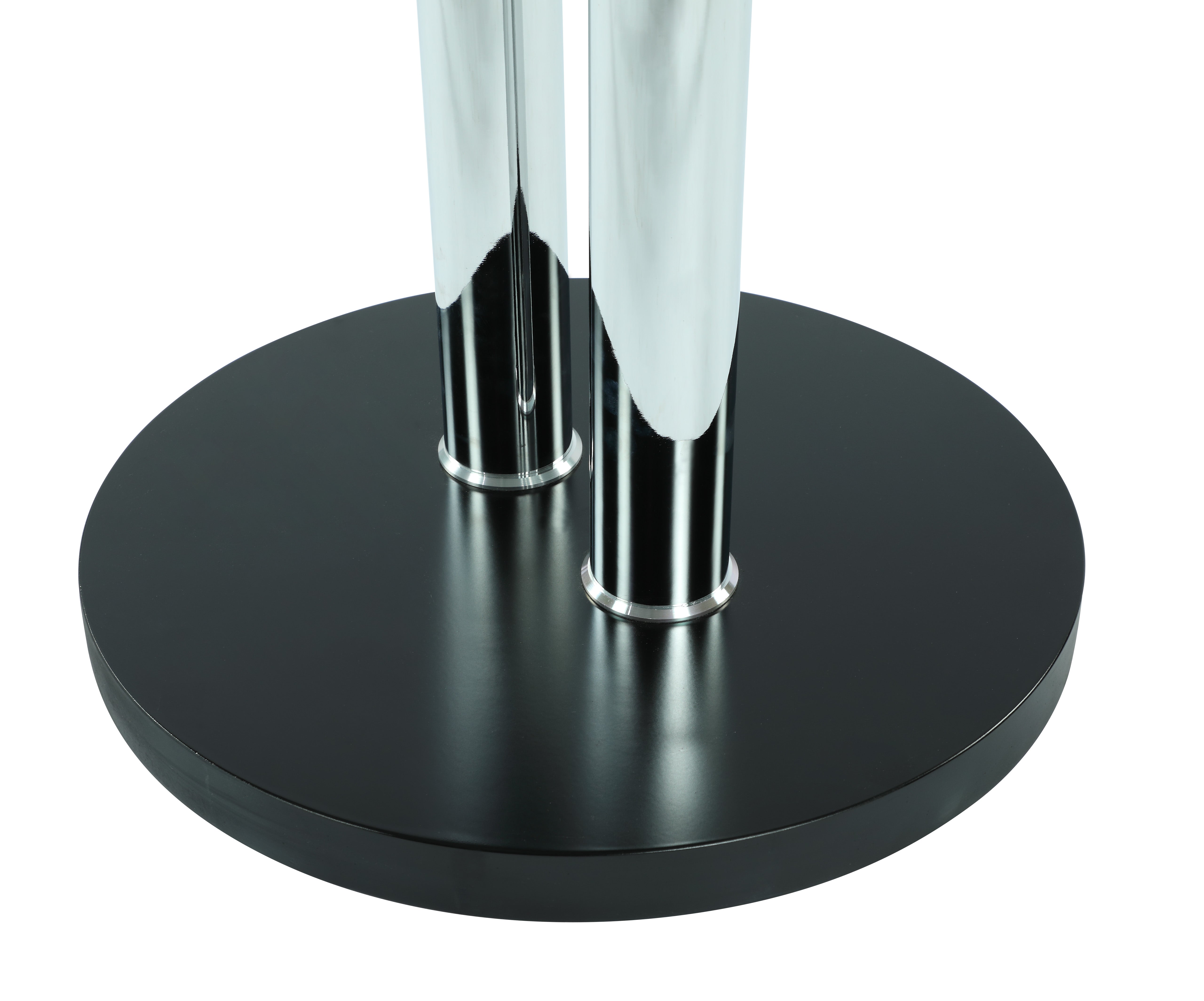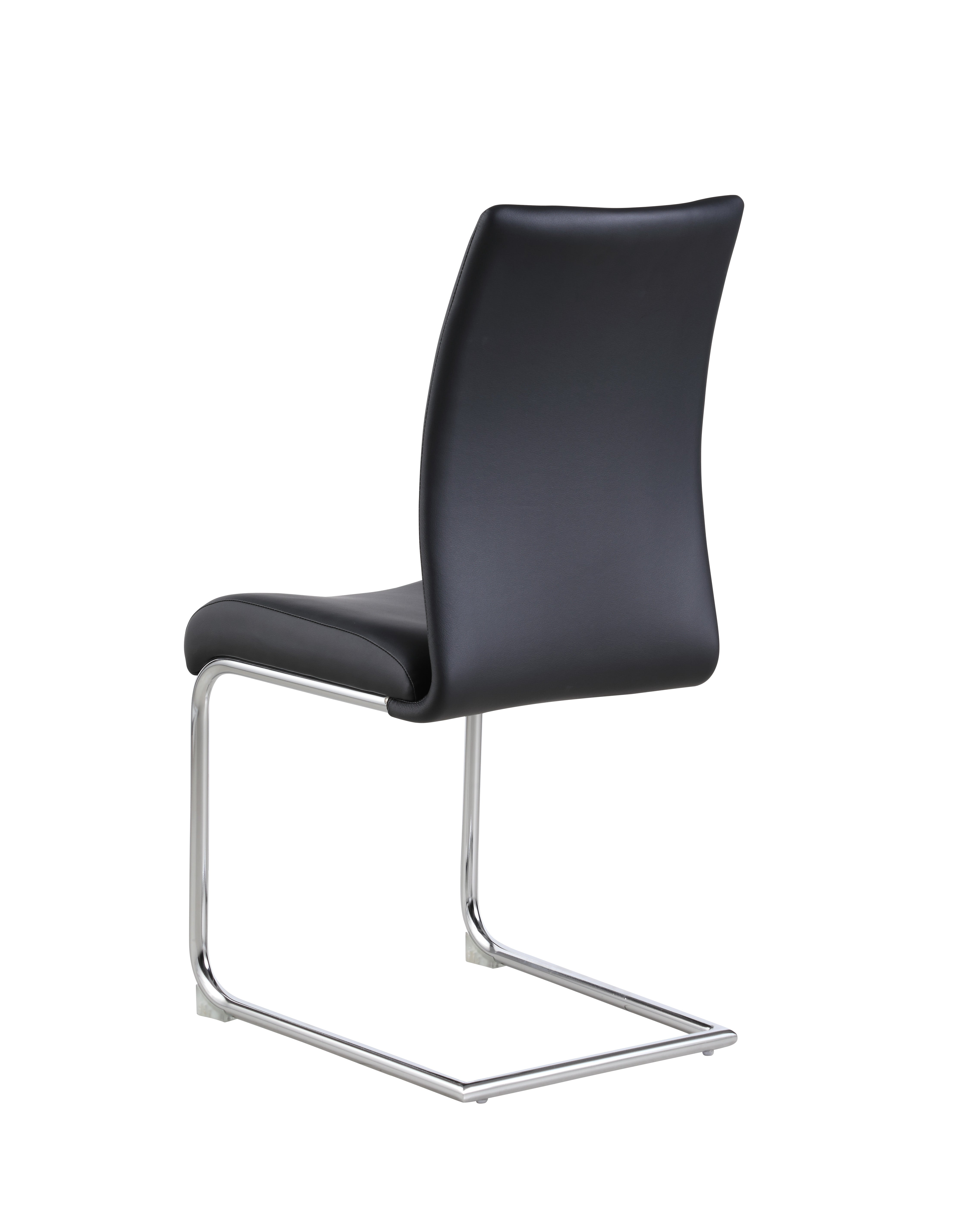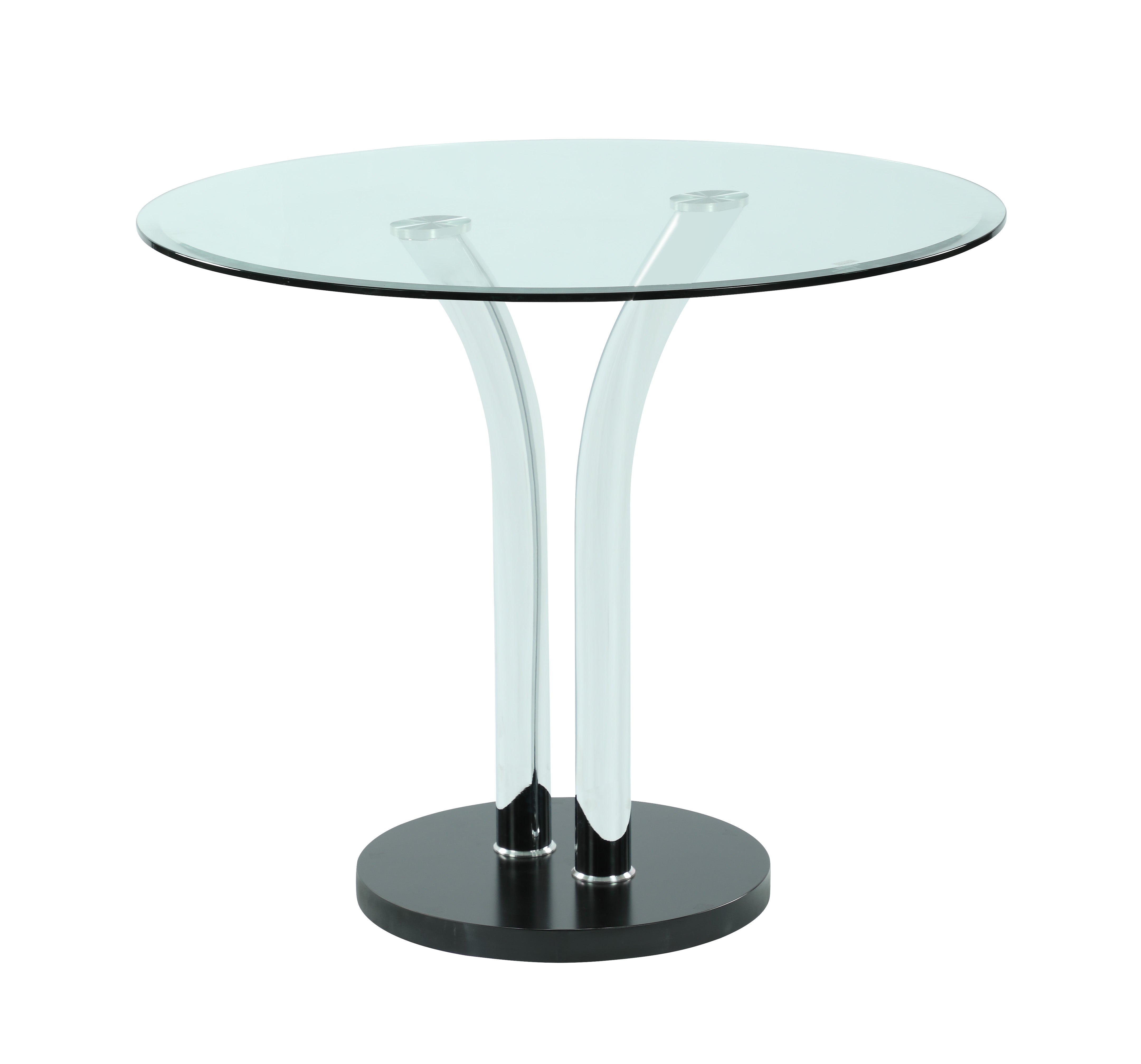This dining set includes a round contemporary bistro table mixing with modern chairs. The tempered glass top measures 36", supported by a chrome finished pedestal that matches the cantilever base of the chairs. Choose from gray, black, or 2 tone faux leather upholstery to make this set the centerpiece of your dining room setting.