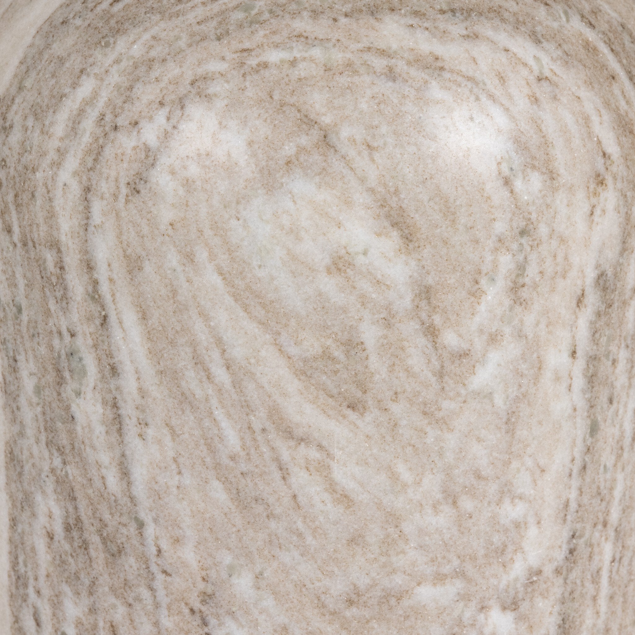 With modernized Art Deco vibes, a weighted base of white antique marble supports slim iron posting topped by a rounded, overscale countertop of natural oak.