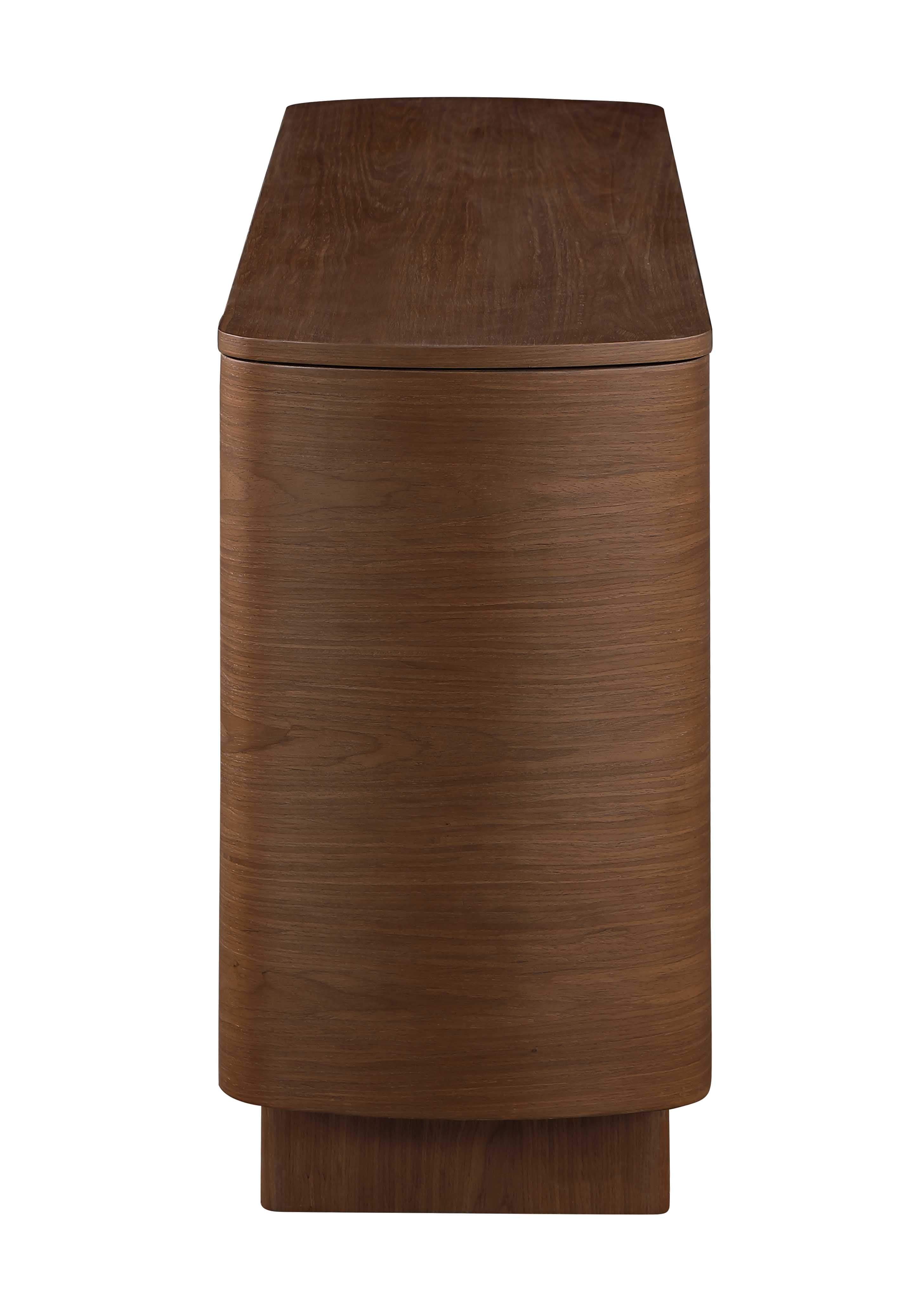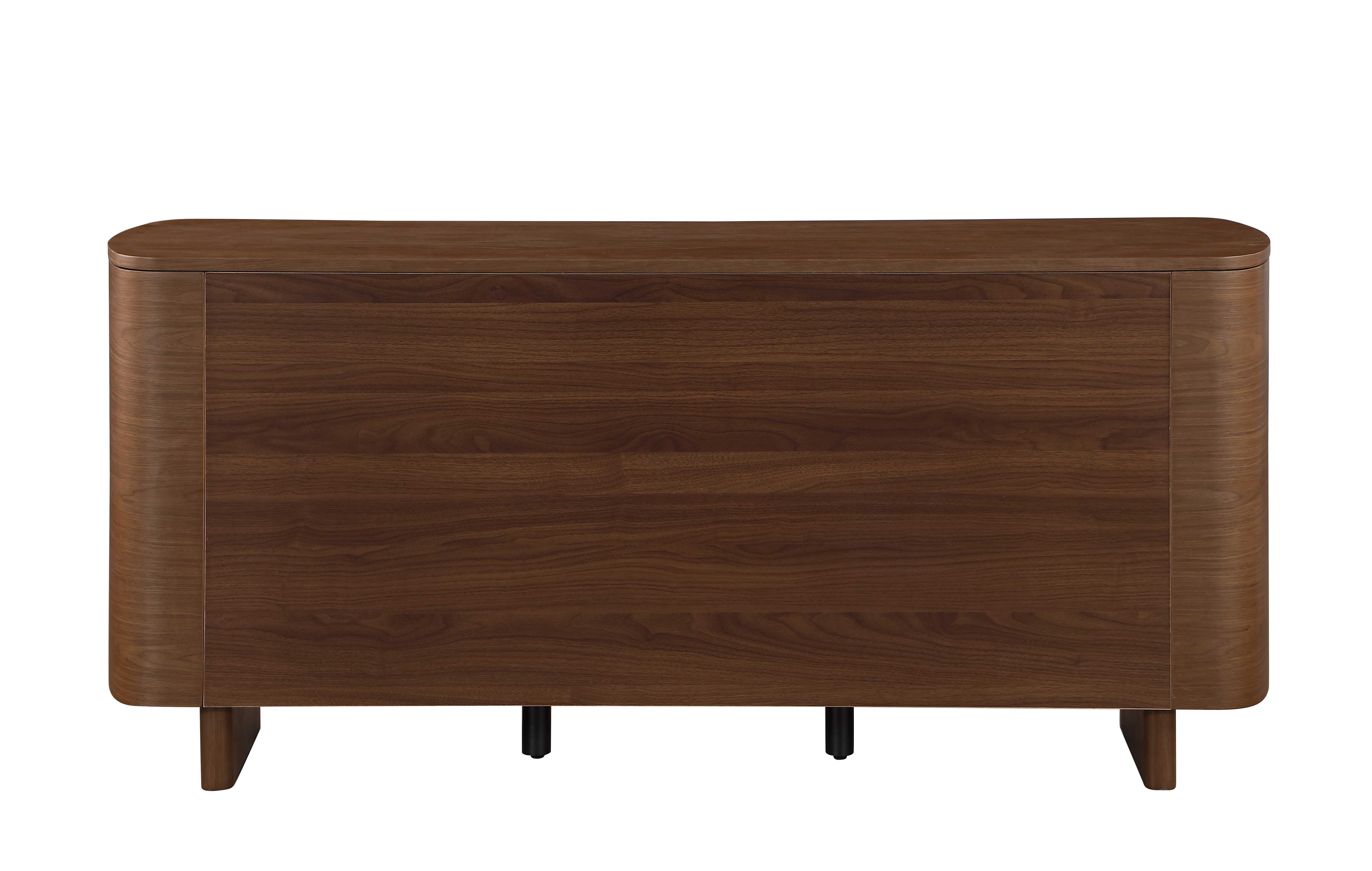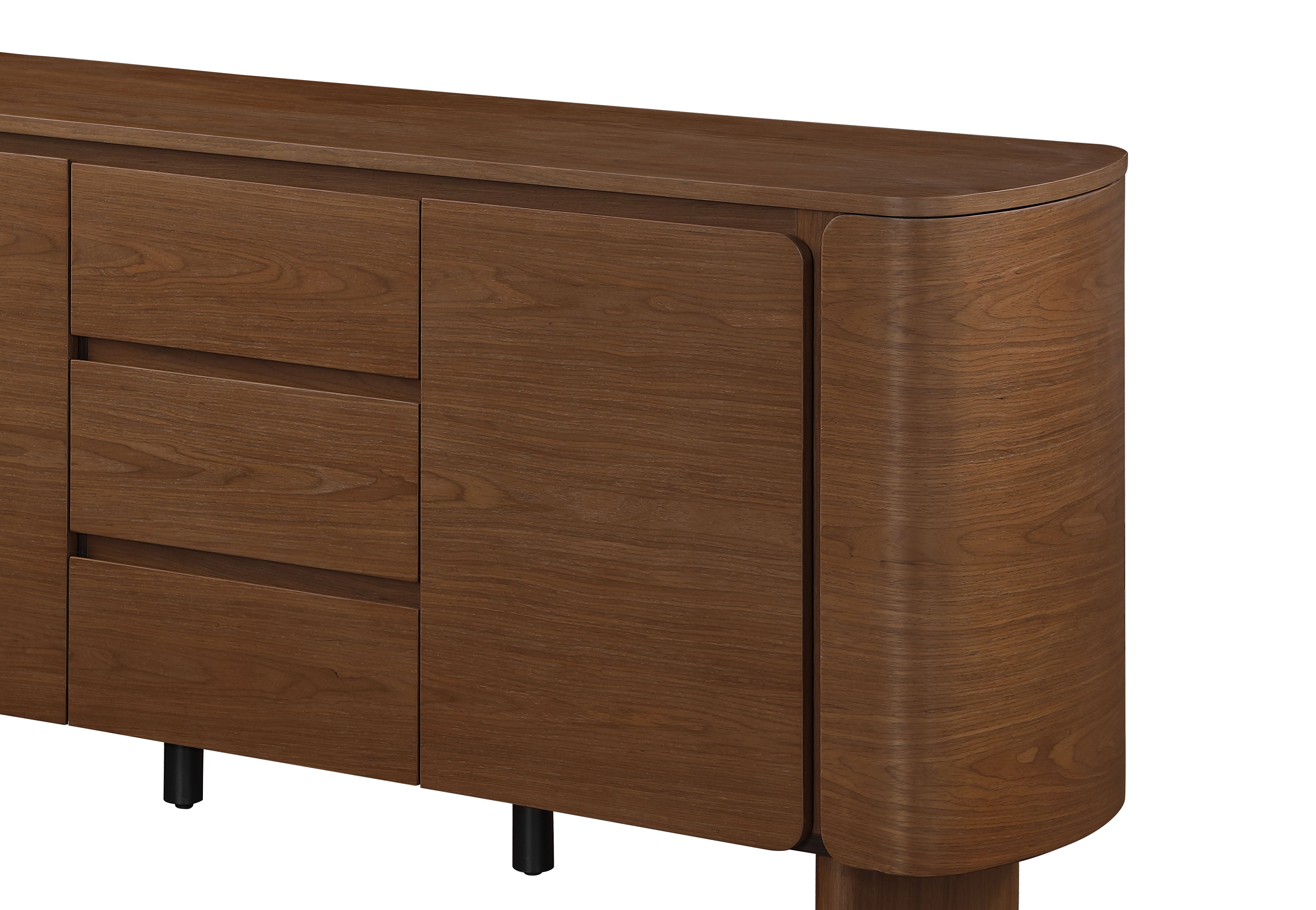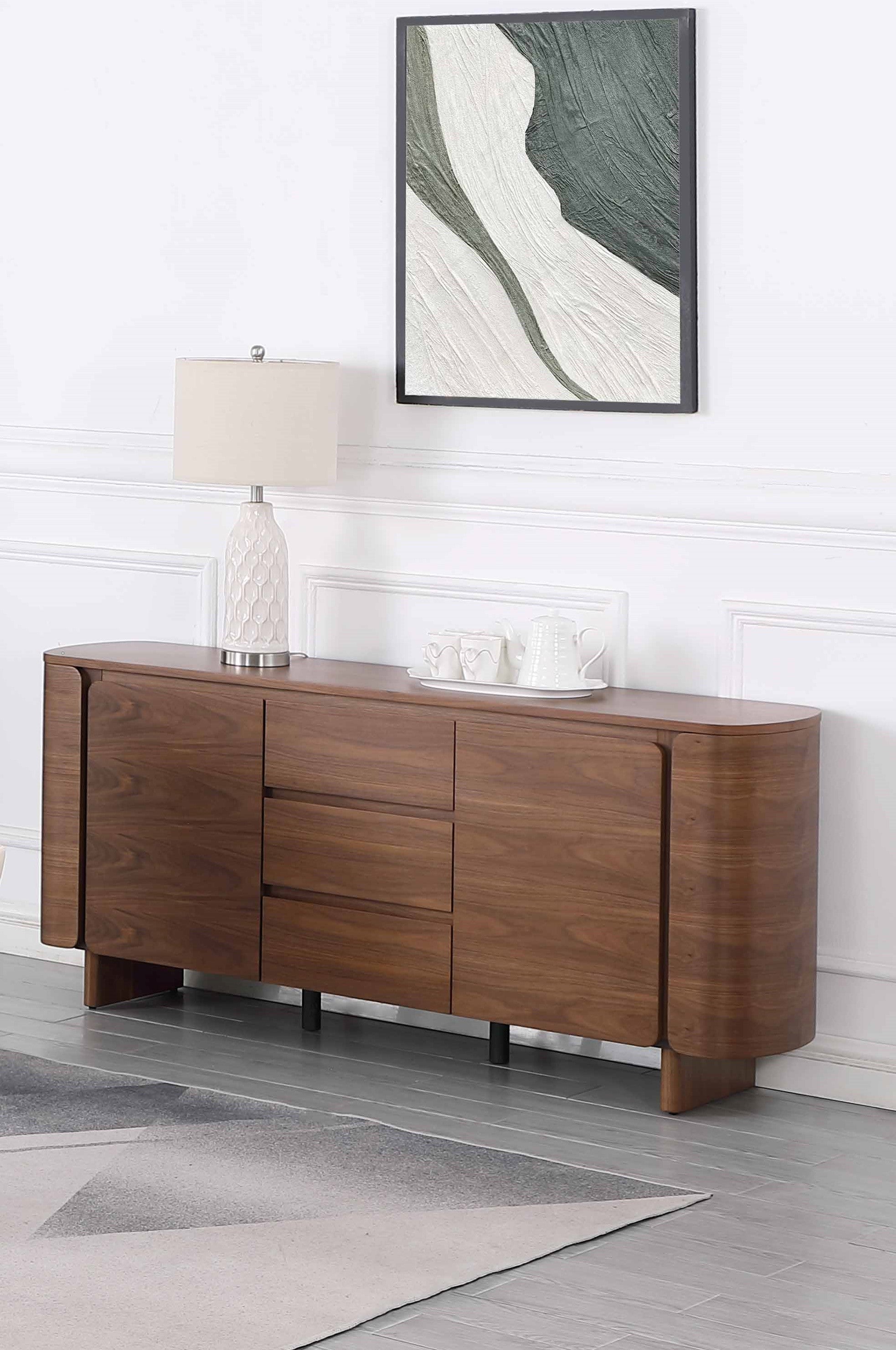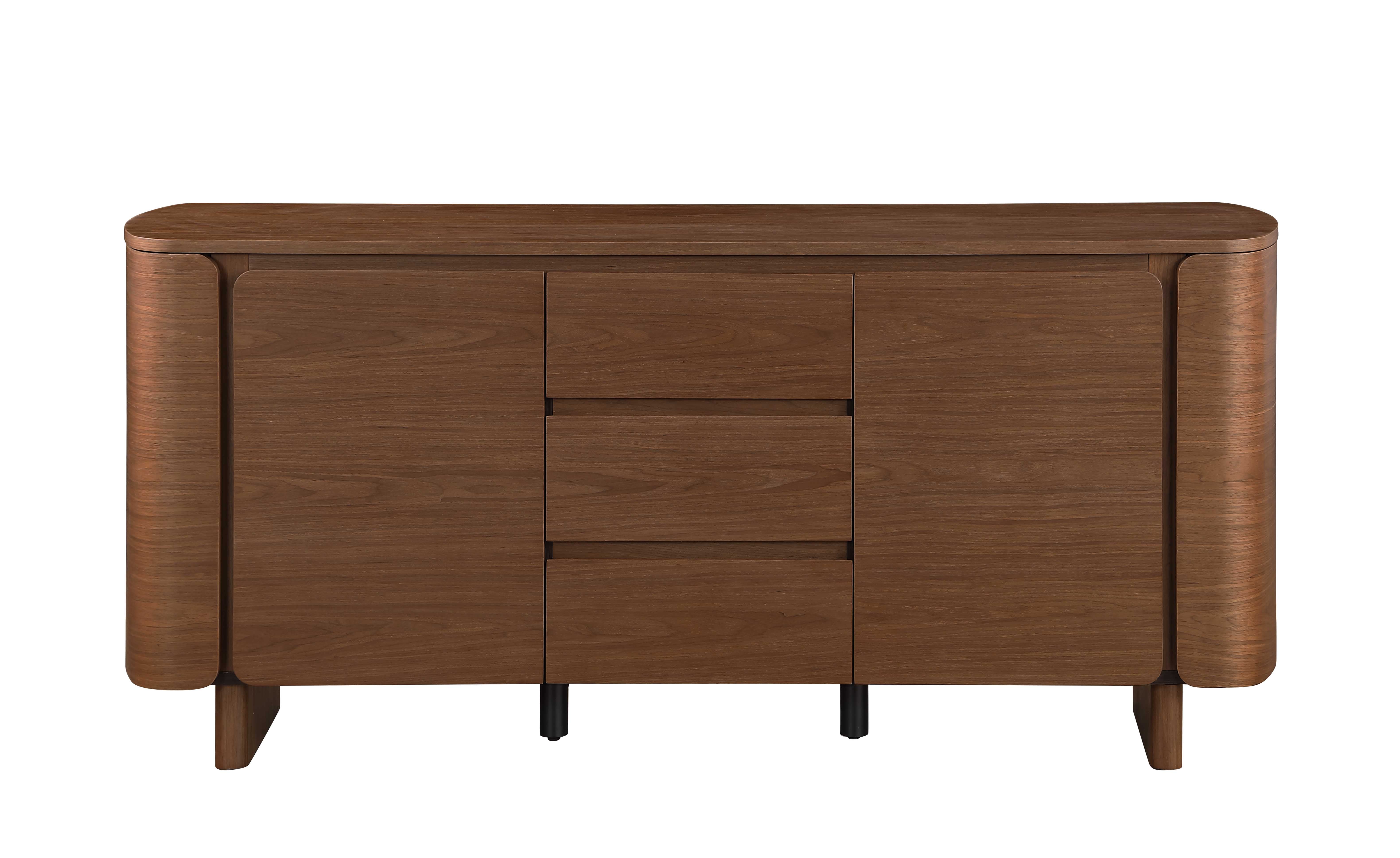 Embrace some modern styling and function in your dining area with this exciting buffet piece. A warm wooden finish embellishes the artful curved wooden accents in the overall design. Look no further for functionality with three pull-out drawers and two spacious cabinets featuring additional shelving.