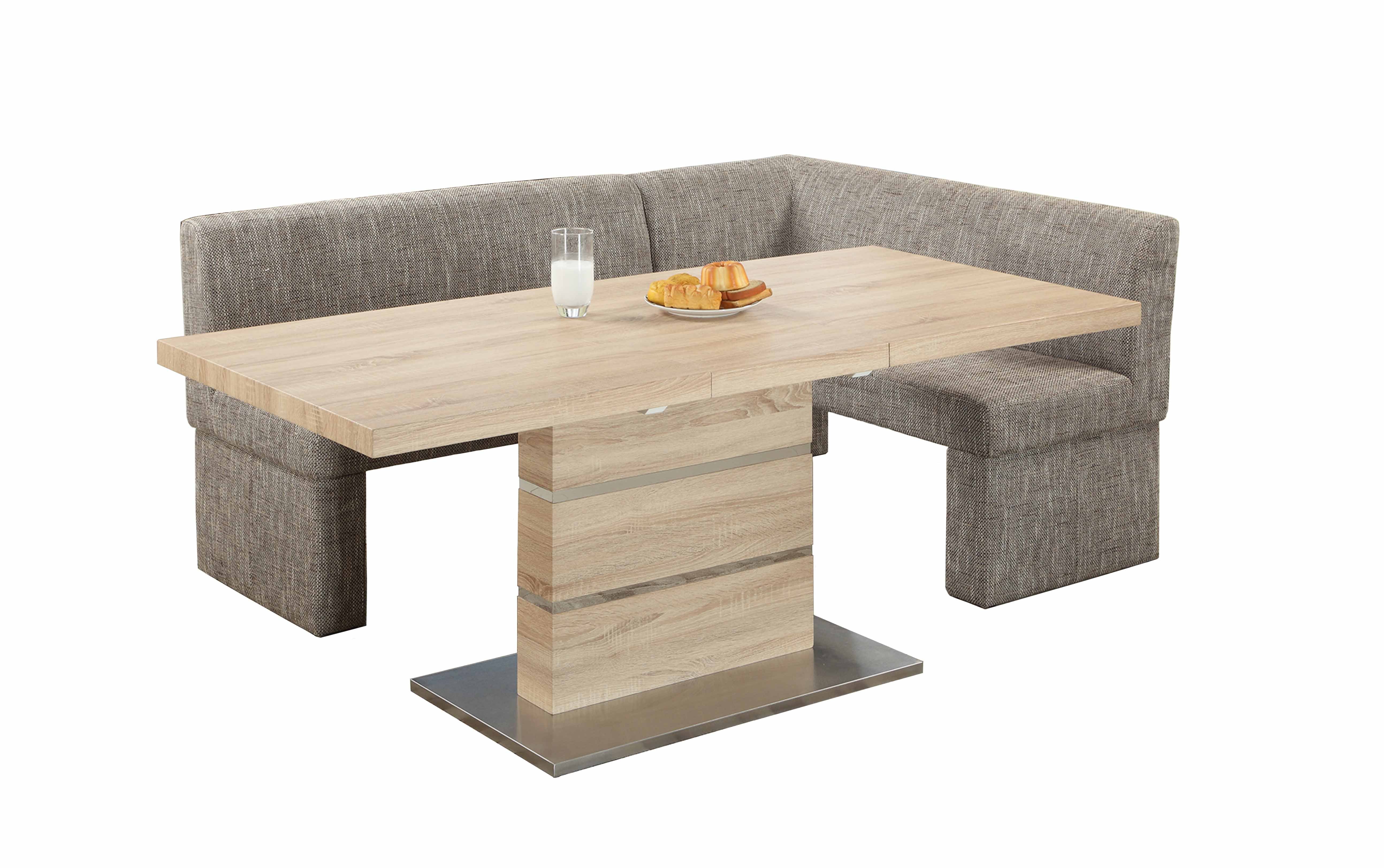 This set includes a 32"x 51" rectangular table with a light oak veneer and a self-storing that easily opens the table from 51" to 67". Unique polished stainless steel accents the pedestal base and contrasts with the brushed base plate. The nook is fully upholstered in neutral woven gray linen, with comfortable cushioning on a solid wood inner frame.