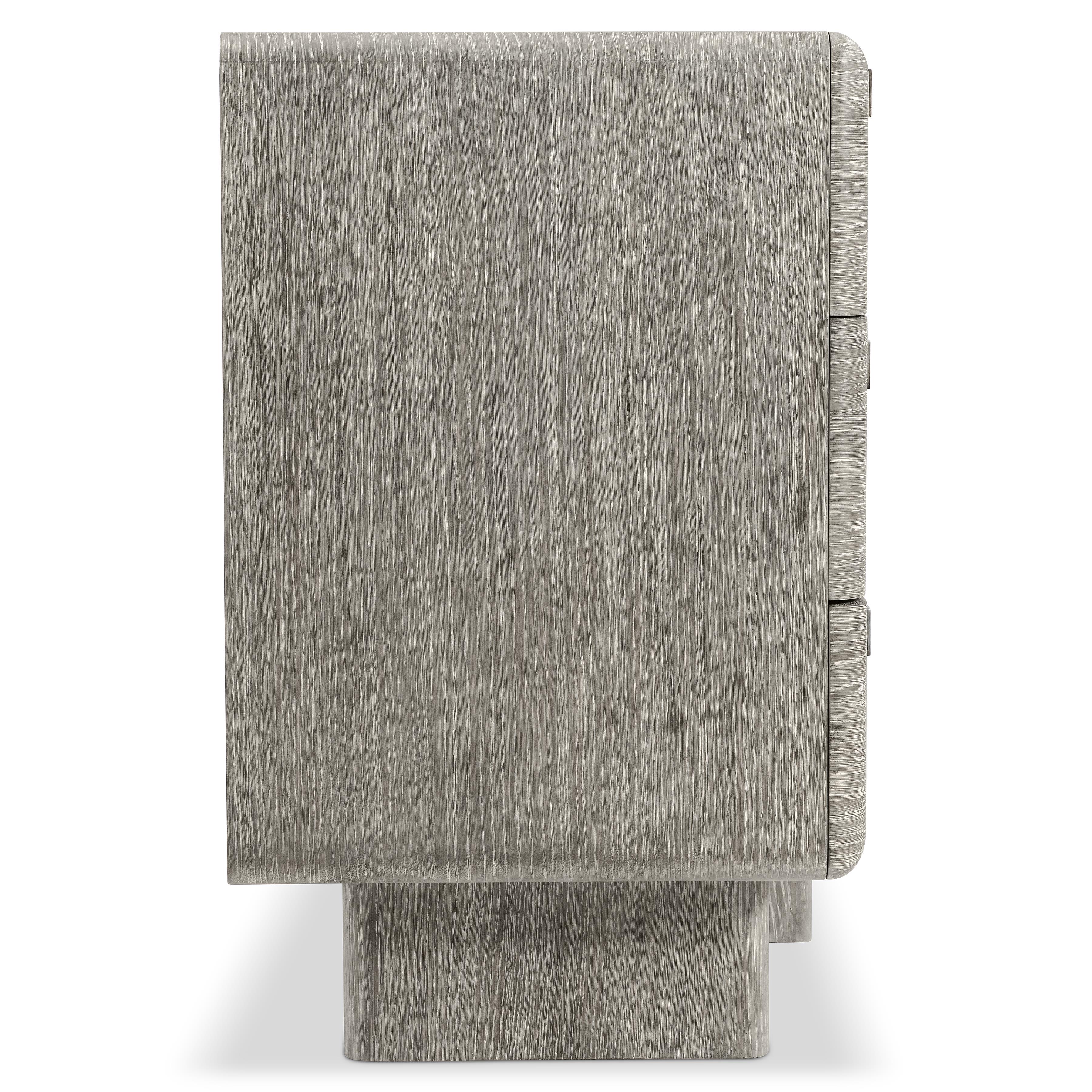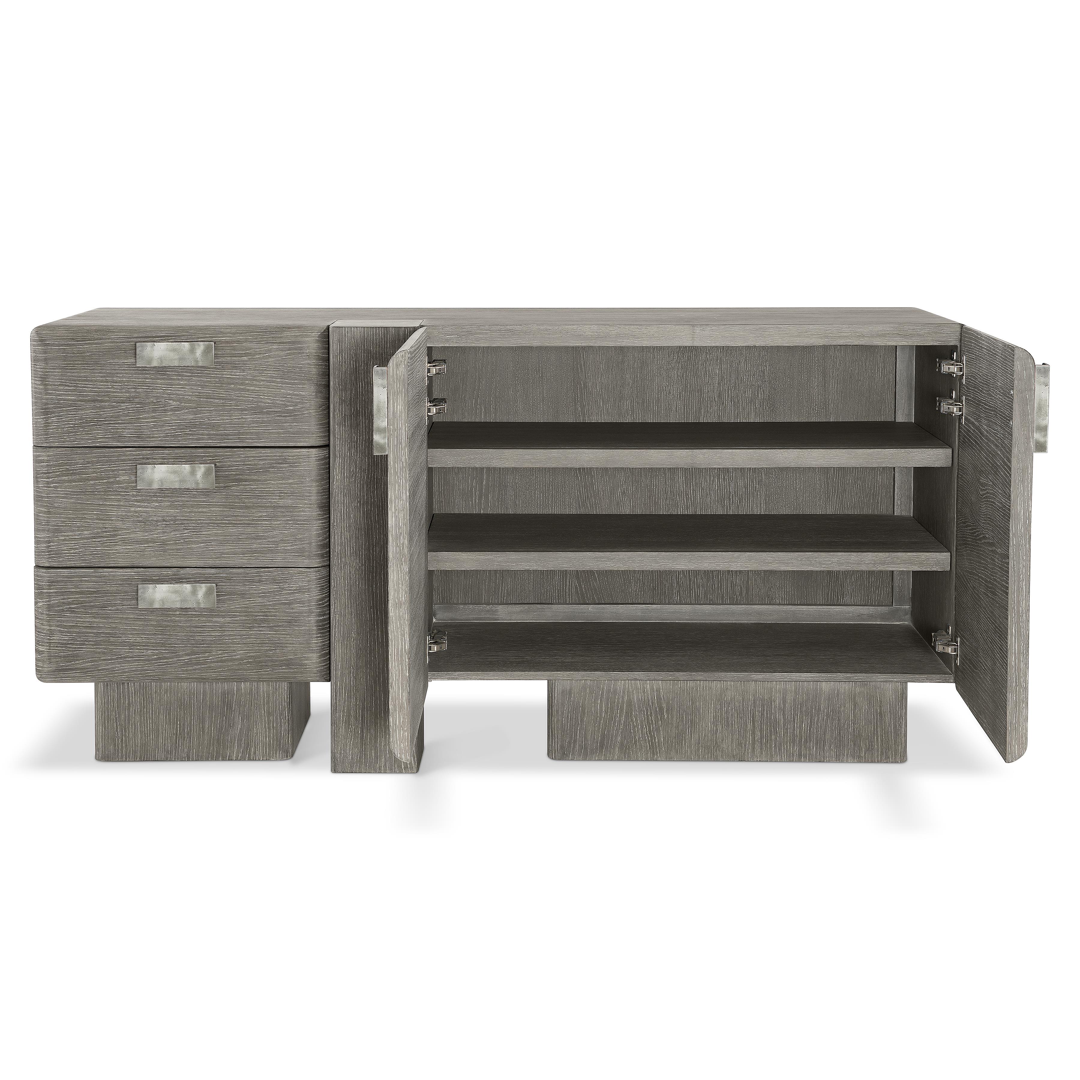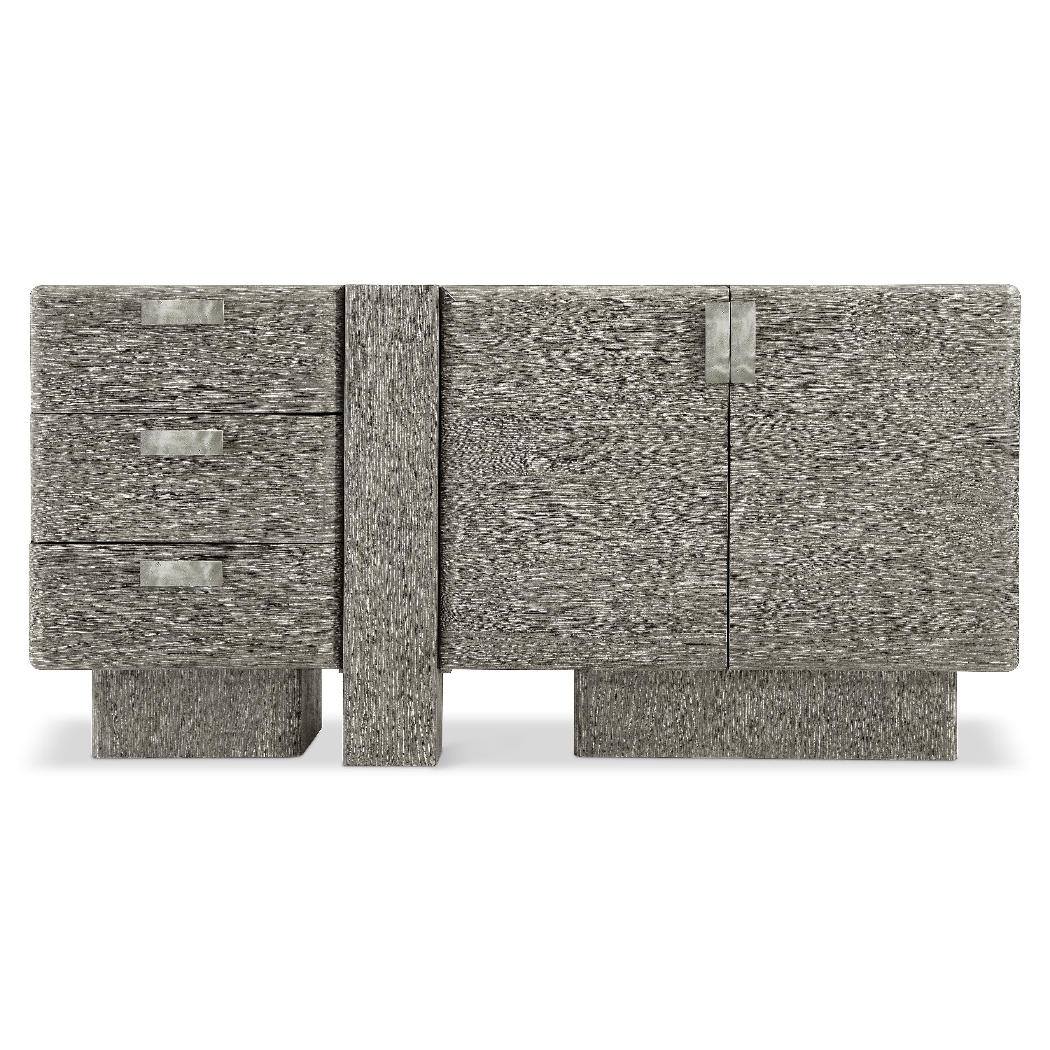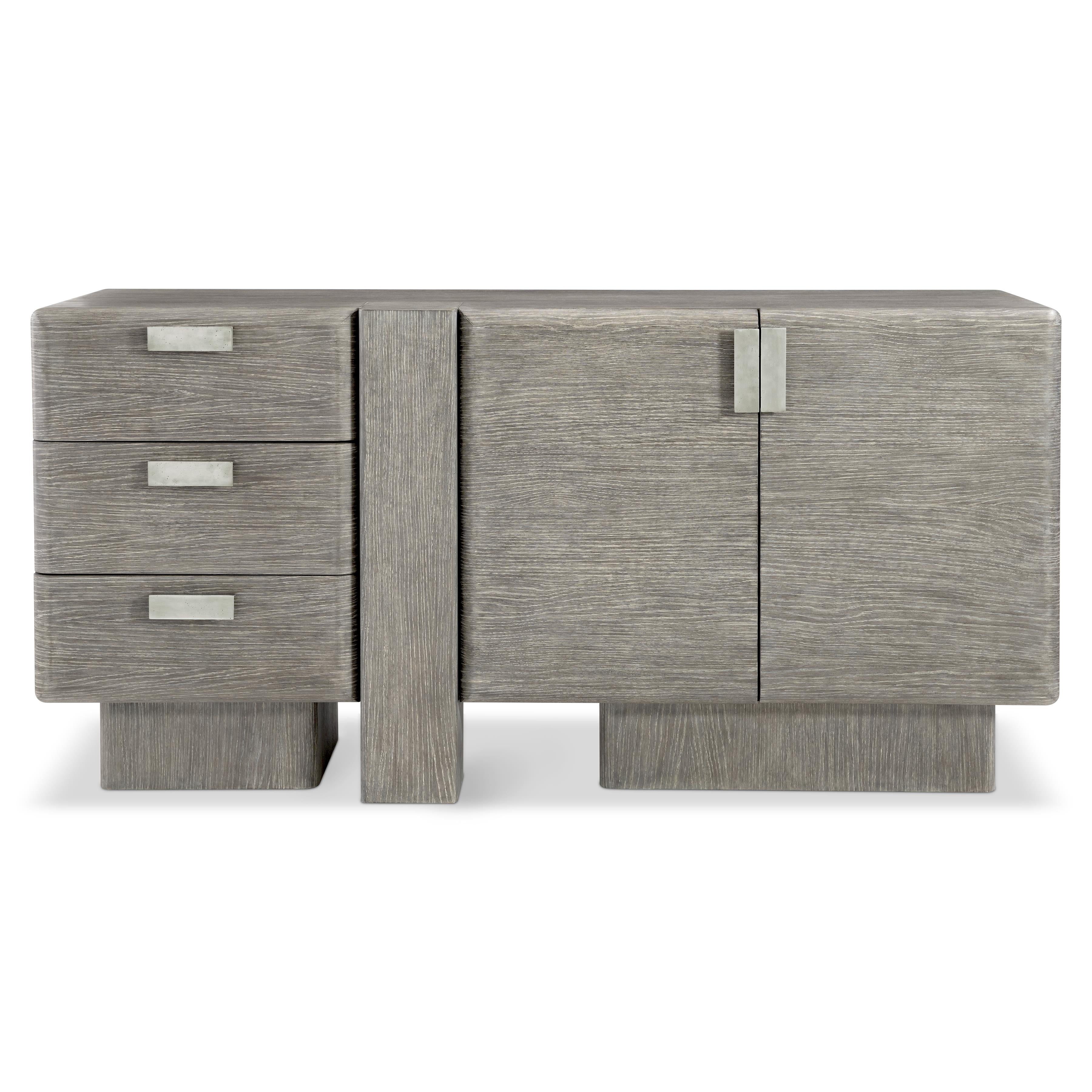 The Monolith buffet has a distinctive modern style with an offset vertical post between two sections set on plinths. On the left are three soft-close drawers with cast aluminum tab pulls in Graphite finish. On the right are two pull-to-open doors concealing adjustable shelves. The overall design is deeply textured in white oak in Puma finish.