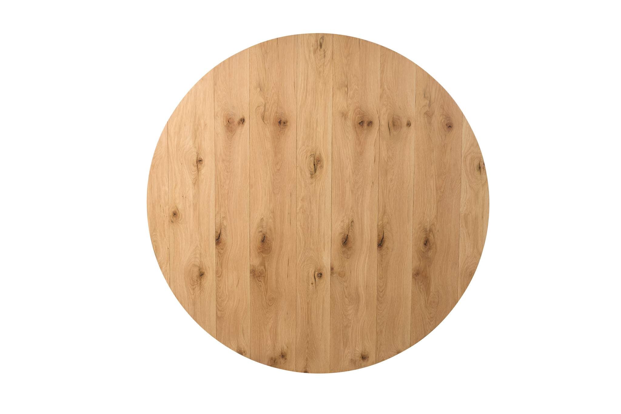 Crafted of Oak solids and veneers in a light, natural stain, the Open Sky 60 Round Dining Table features a thick Oak top with a plank style veneer pattern resting on a base of five interwoven and overlapping oak timbers. Sculptural and modern, Open Sky easily seats six for dinner or would be a stunning entry table. This table will capture the raw beauty of dried wood in its natural state, highlighting its unique knots, cracks and rich color variations.