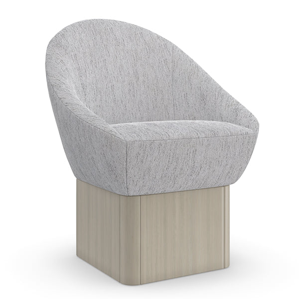 With midcentury modern notions, this swivel dining chair invites chic style and comfort. Tailored in an oatmeal woven fabric with a hint of saffron tones, its sculptured silhouette features a softly curved back and seat, balanced on a Japanese sen square base in a warm, neutral sand color. Its swivel function offers ease of movement and conversation with guests from every angle for an elevated dining experience.