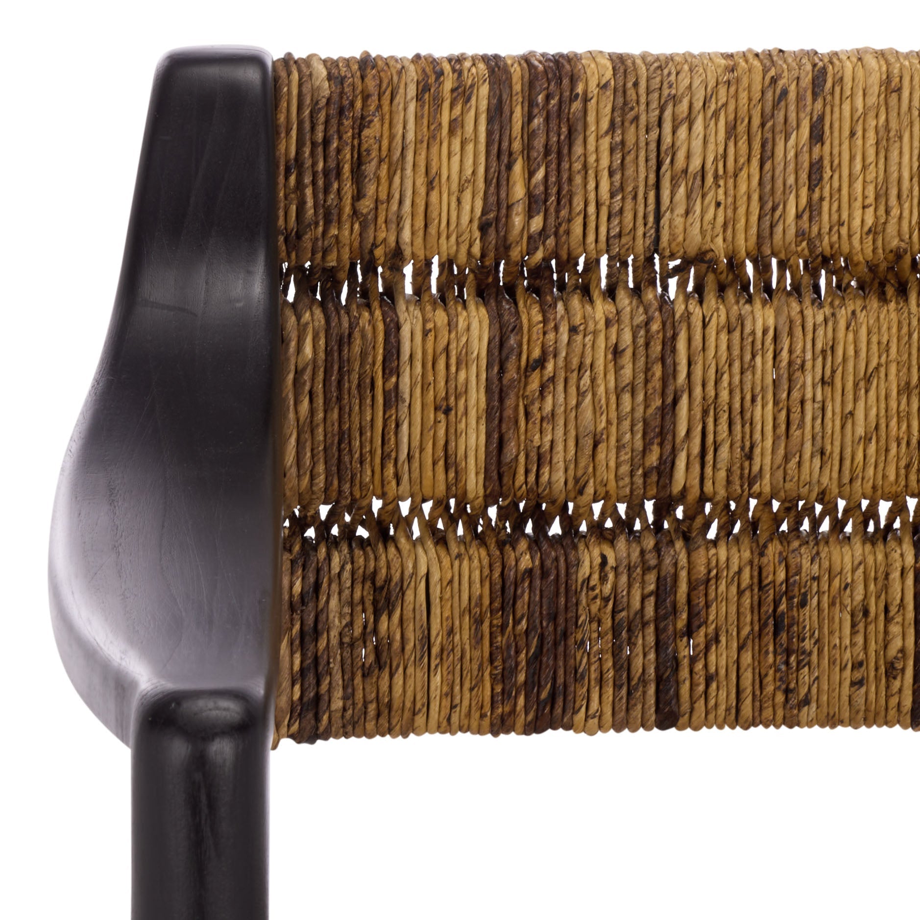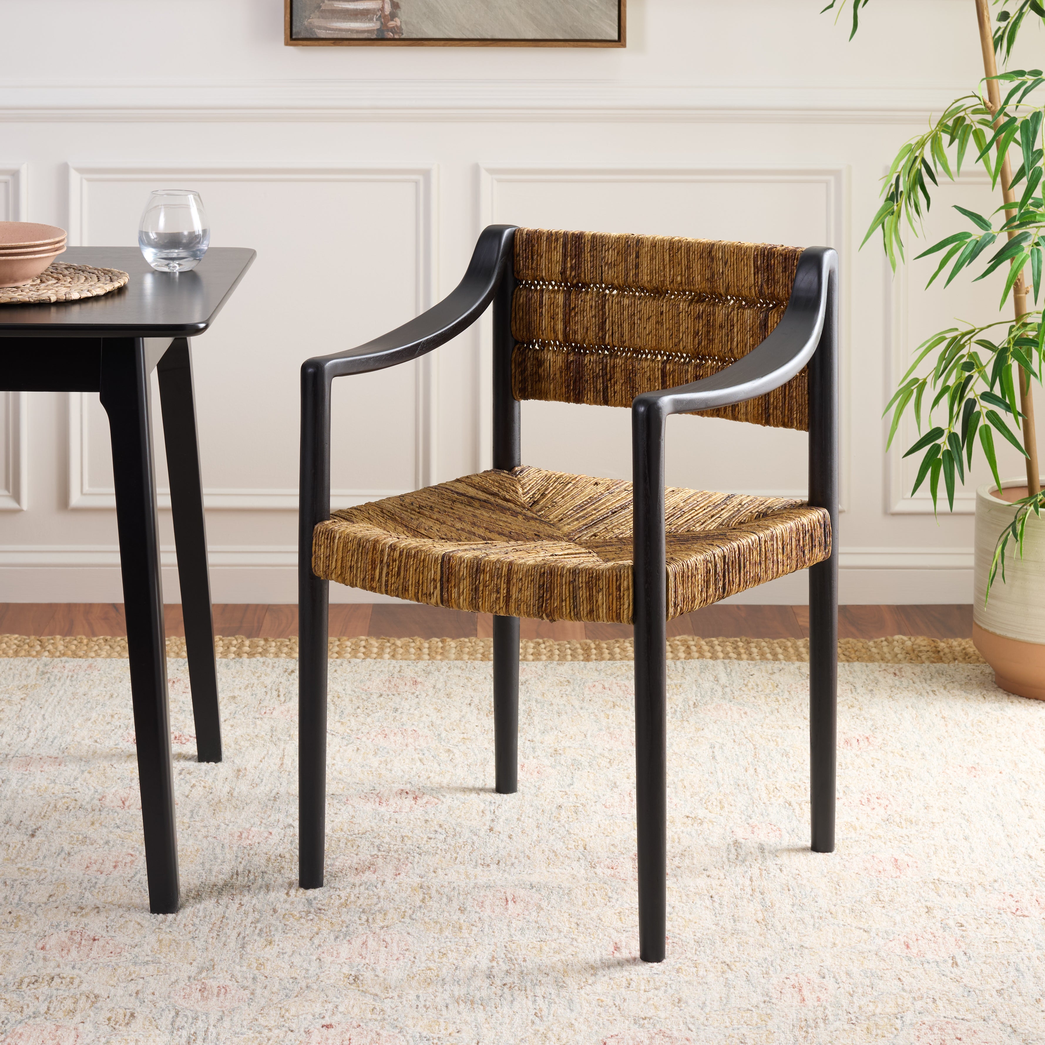 Give your dining room a touch of island charm with our Aksel Arm Dining Chair. The seat and backrest, woven from natural banana leaf in a subtle shade, contrast beautifully with the strong, black wooden arms and legs. Benefit from the tropical appearance and tactile allure as you enjoy memorable meals and conversations.
