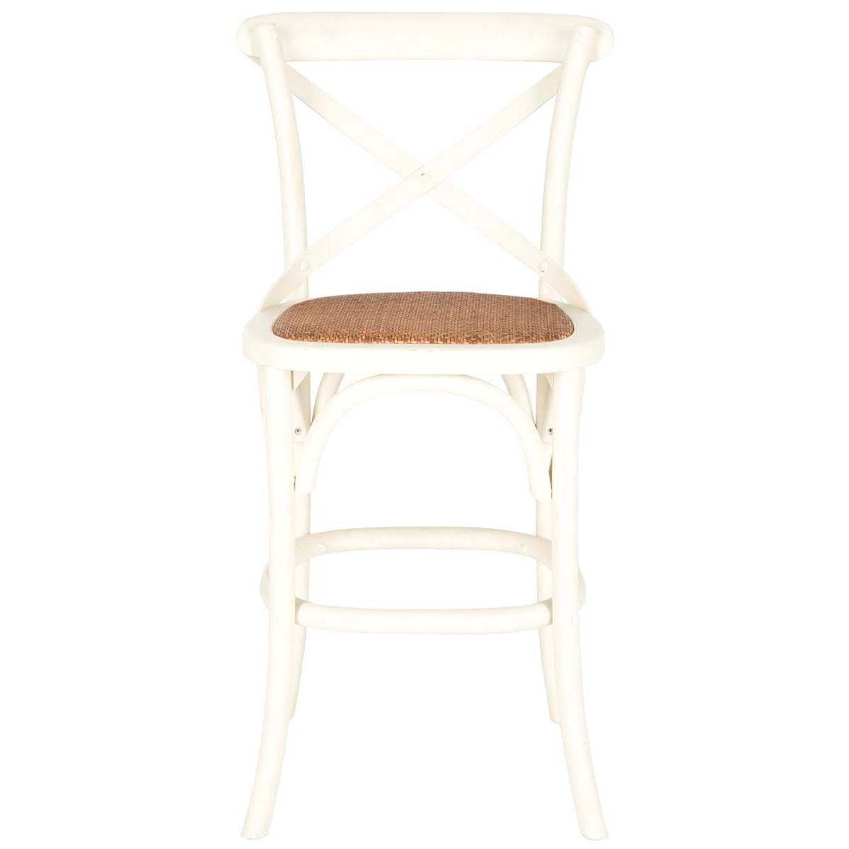 With its willowy frame and iconic cross back inspired by Michael Thonet?? classic bistro chair, the Franklin counter stool by Safavieh is ideal in kitchen or great room. Crafted of solid American oak, including the X arch brace, this casual counter stool is finished in distressed ivory with a seat of rattan caning.