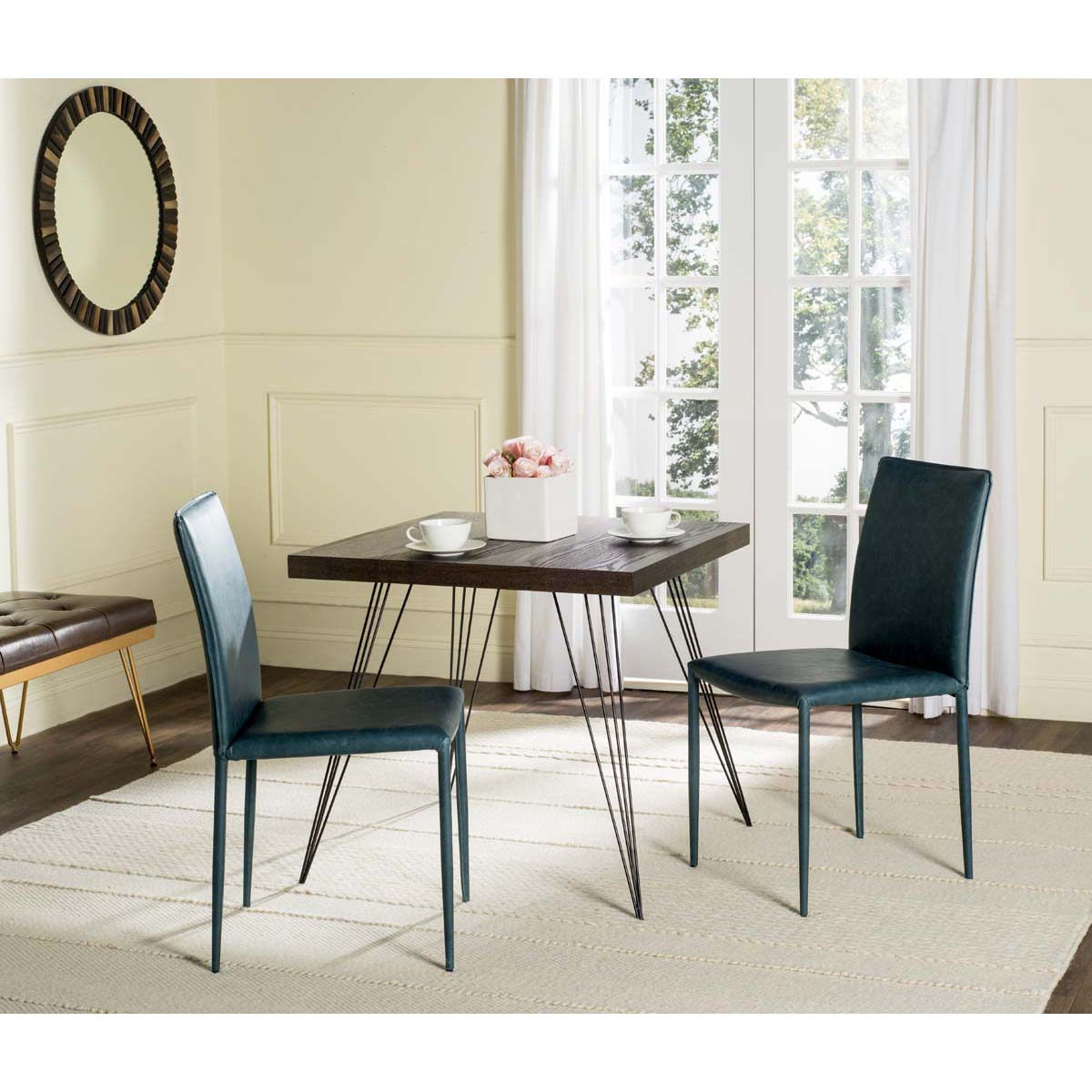 The minimalist aesthetic of the Karna Dining Chair (sold in sets of two) suits decorating tastes both transitional and contemporary. Upholstered with antique teal bonded leather, Karna is made to withstand wear and tear while still exuding effortless Euro chic style.