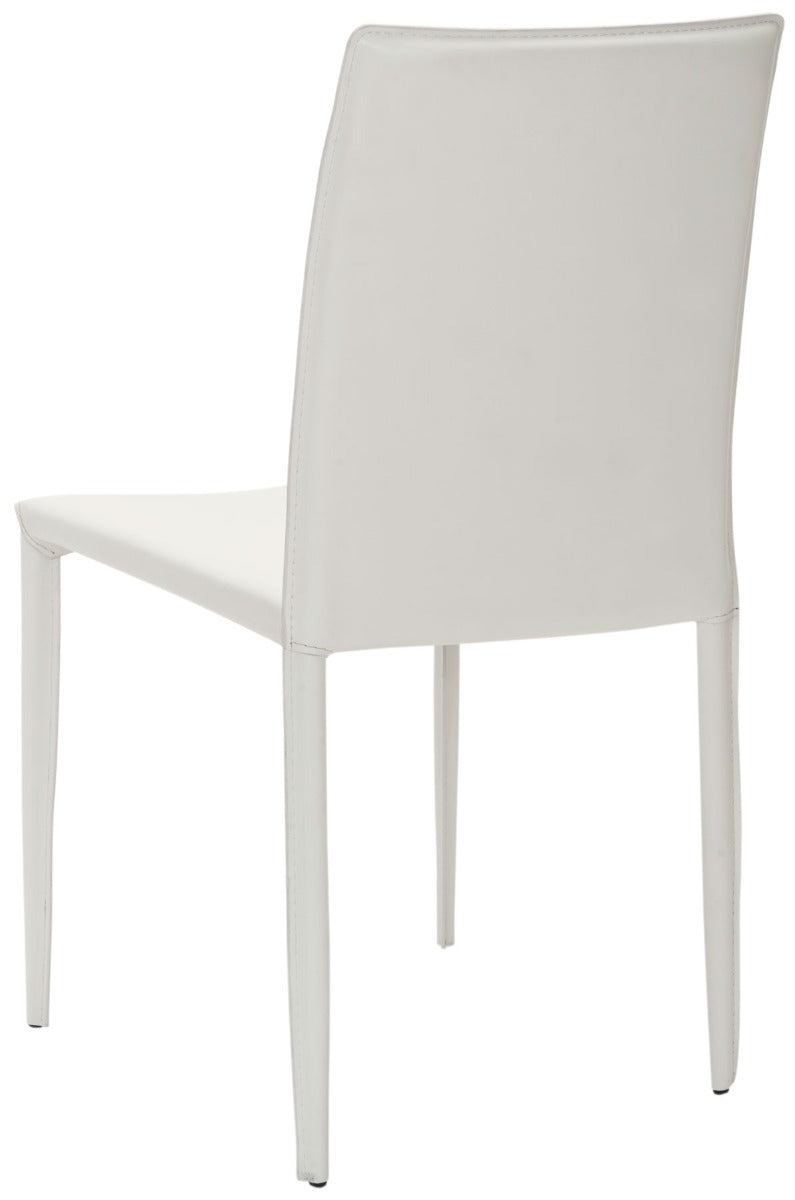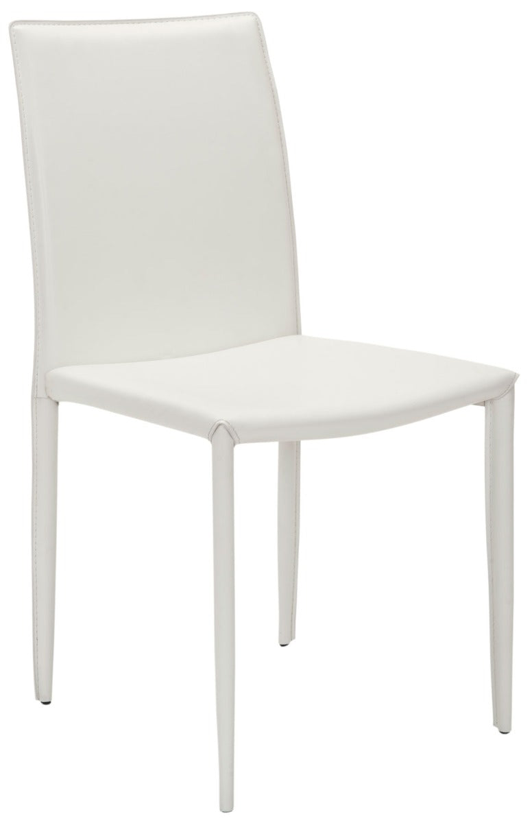 The minimalist aesthetic of the Karna Dining Chair (sold in sets of two) suits decorating tastes both transitional and contemporary. Upholstered with easy care white bonded leather, Karna is made to withstand wear and tear while still exuding effortless Euro chic style.