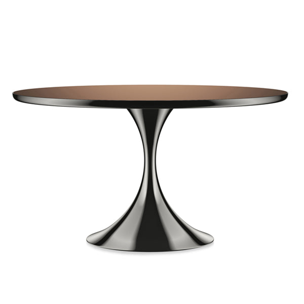 Our reinterpretation of the mid-century modern tulip table makes an eye-catching statement in a dining room, kitchen or sunroomwindow. Originally designed to remove the clutter of legs under a dining table, this piece boasts a curved, stem-like metal base inDeep Bronze. This version has a round, Bronze mirror top that is encapsulated in the metal base. Also available in Whisper of Goldmetal with a Silver-tinted mirrored top.