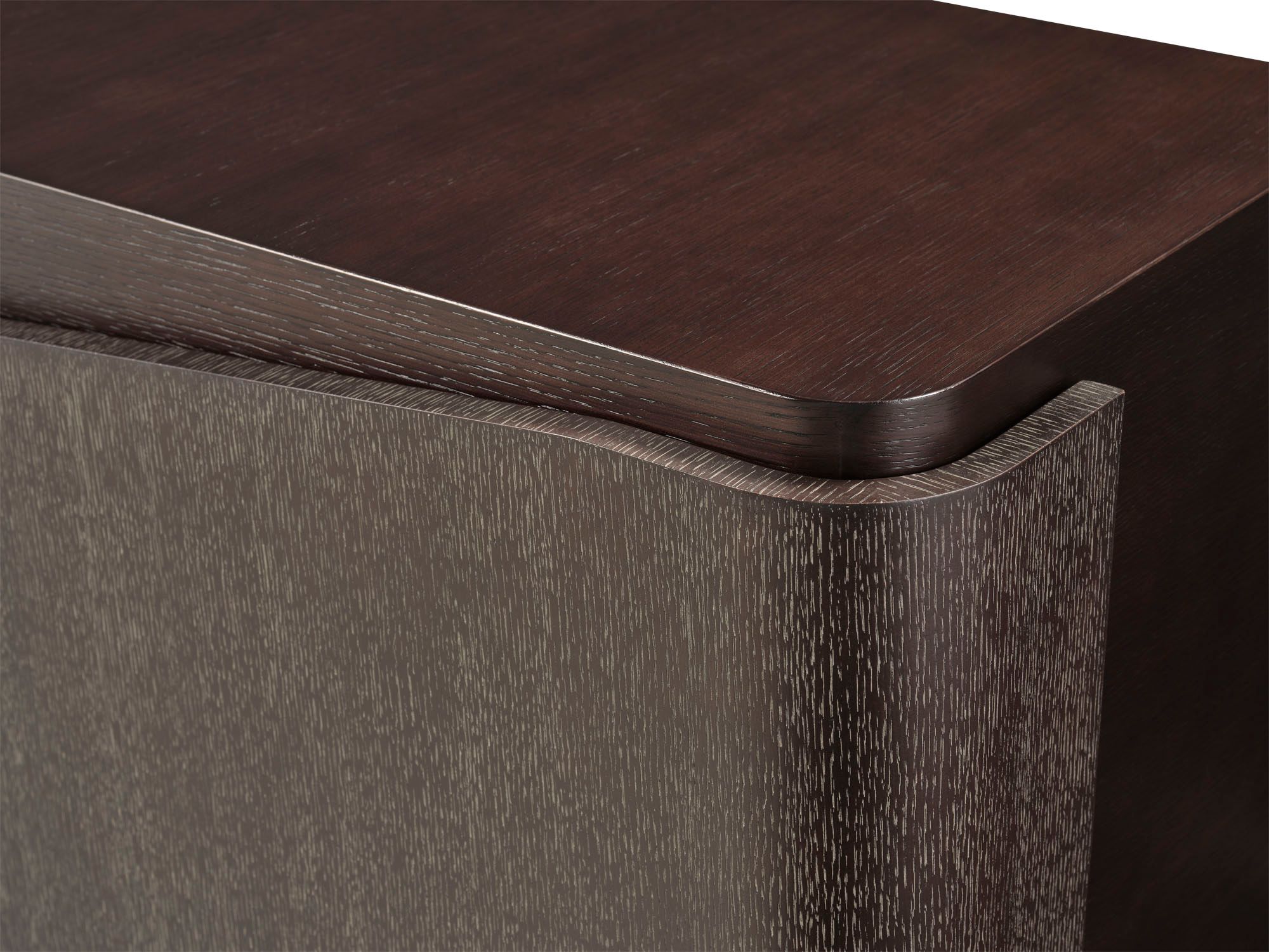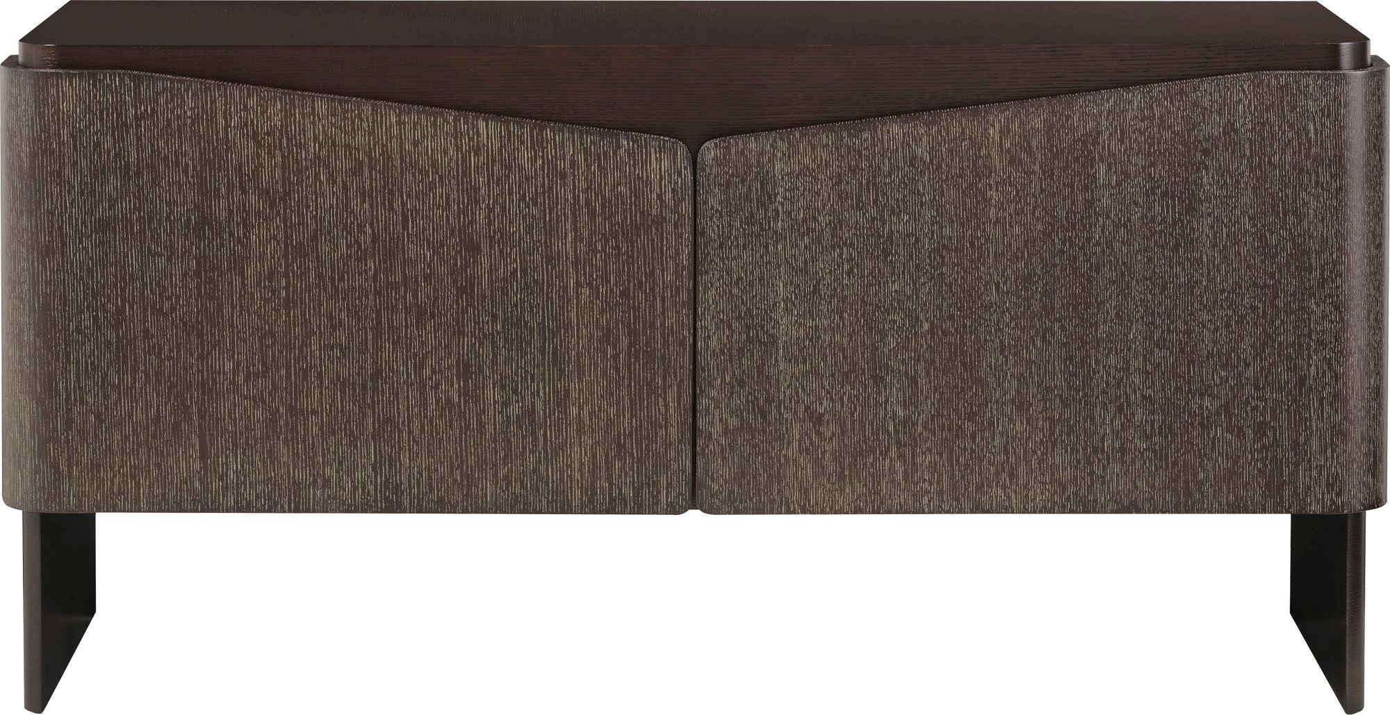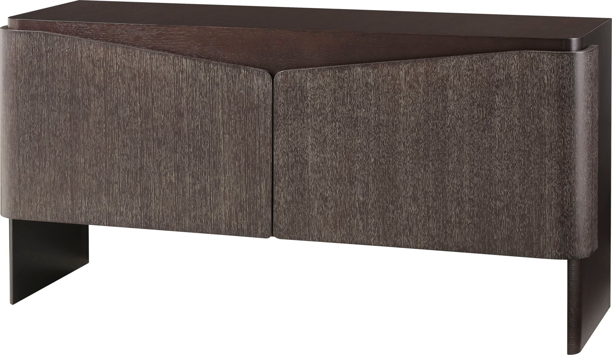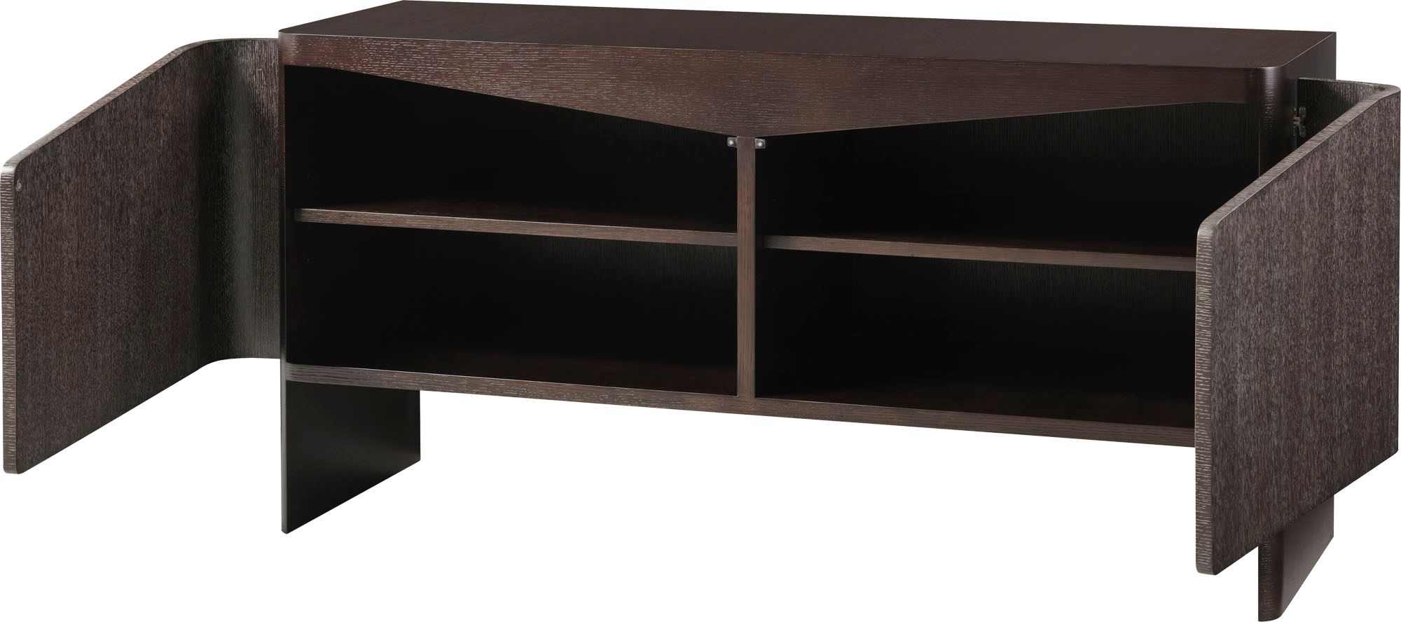 Contrasting veneers and gently sloping doors adorn the Tamara Credenza, which appears to be wrapped in an envelope. The credenza offers one adjustable shelf behind each door, with quartered oak veneer on the entirety of the piece.