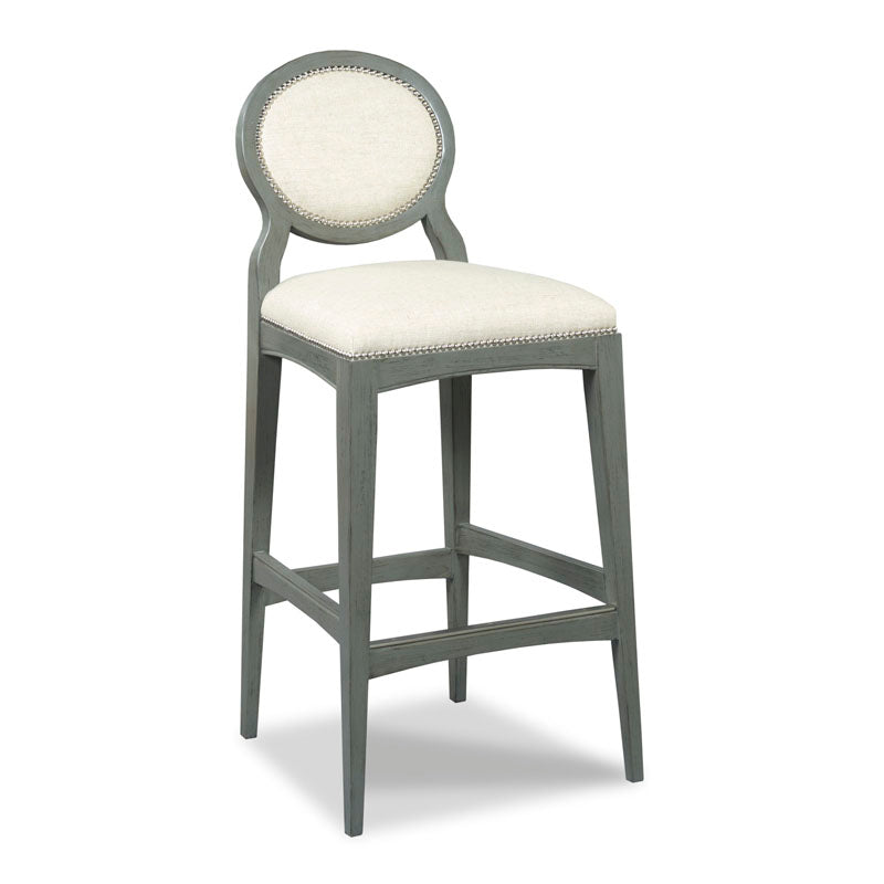A sleek design with graceful tapered legs that are joined by low stretchers and curved apron rails. The stool features an upholstered seat and back and is finished with nail head trim.