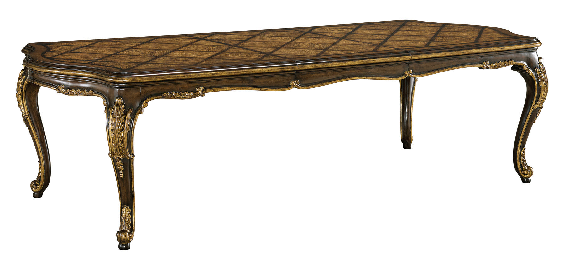 Solid Mahogany Wood table features an elegantly-woven parquet inlay top formed from Ash Burl, White Ash, and Walnut Veneers. Finished in Aria, this elaborate dining table boasts handmade carvings on the legs and rails, trimmed in gilded Aged Gold. Overall measurements include removable 25 table leaf.