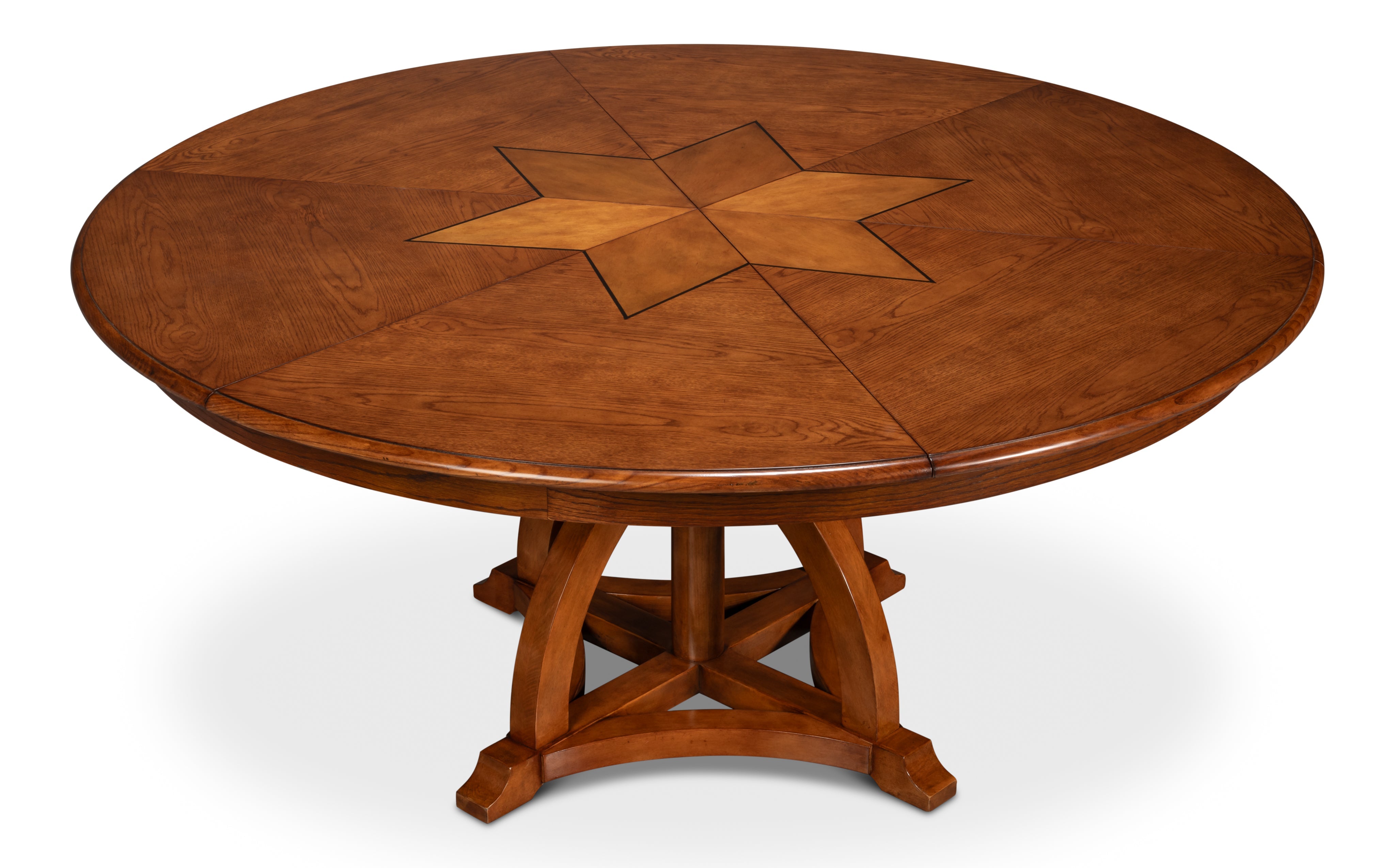The Austin Jupe Table has an exquisite pedestal base that was inspired by timber frame architecture. The top has a unique inlaid star pattern that expands as you open the leaves. Sarreid"s newly reengineered Jupe Dining Tables bring a timeless 19th-century innovation into the modern age. Featuring a self-storing expandsion mechanism crafted from extruded aluminum, these tables expand effortlessly, providing both smooth operation and simplified assembly.