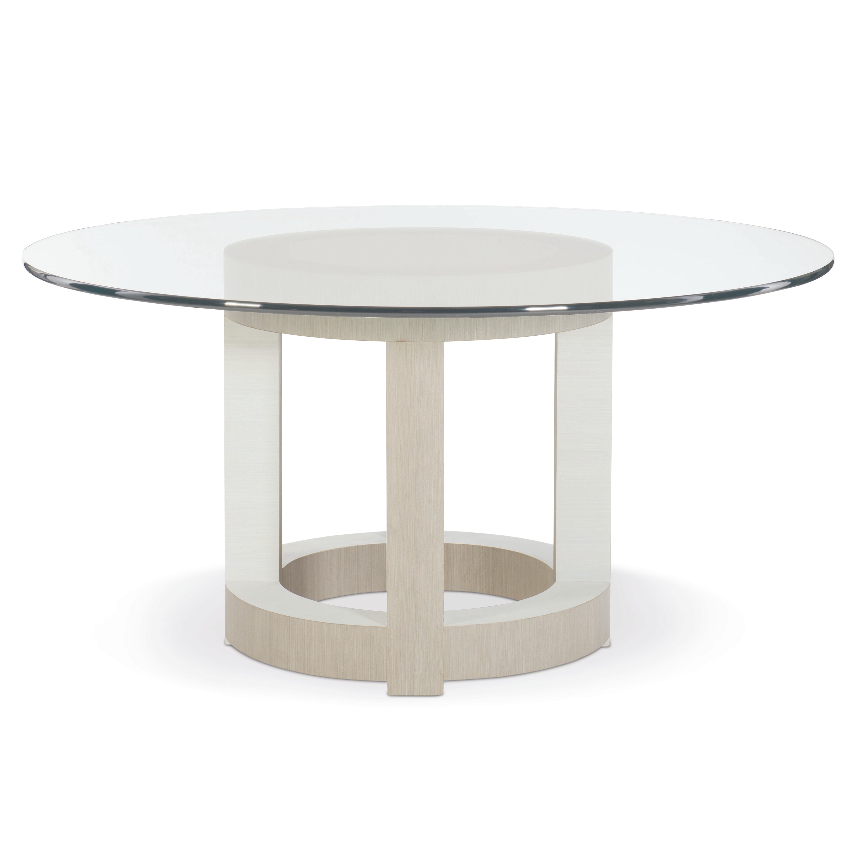 With a clean, modern form and combination of finishes, the Axiom round dining table offers glamorous transitional style and unique visual appeal. In this sleek, geometric design, a round glass top with an eased edge rests on an open circular base with four leg posts. On the base, engineered faux anigre veneers are presented in two silky, low-sheen finishes that work together to create texture and depth. The result of fine craftsmanship, this piece delivers contemporary elegance with a warm and inviting feel.
