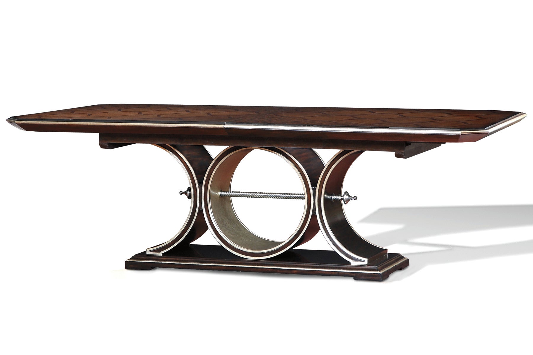 Solid Malay Beech Wood. Table top showcases a starburst White Ash base, inlaid with ogee tile pattern in Walnut. Curved Walnut Veneer base features hand carved and gilded trim in Deco Silver, with twisted metal stretcher bar. Finished in a combination of Contemporary Havana and Bombay. Overall measurements include 31 leaf extension.