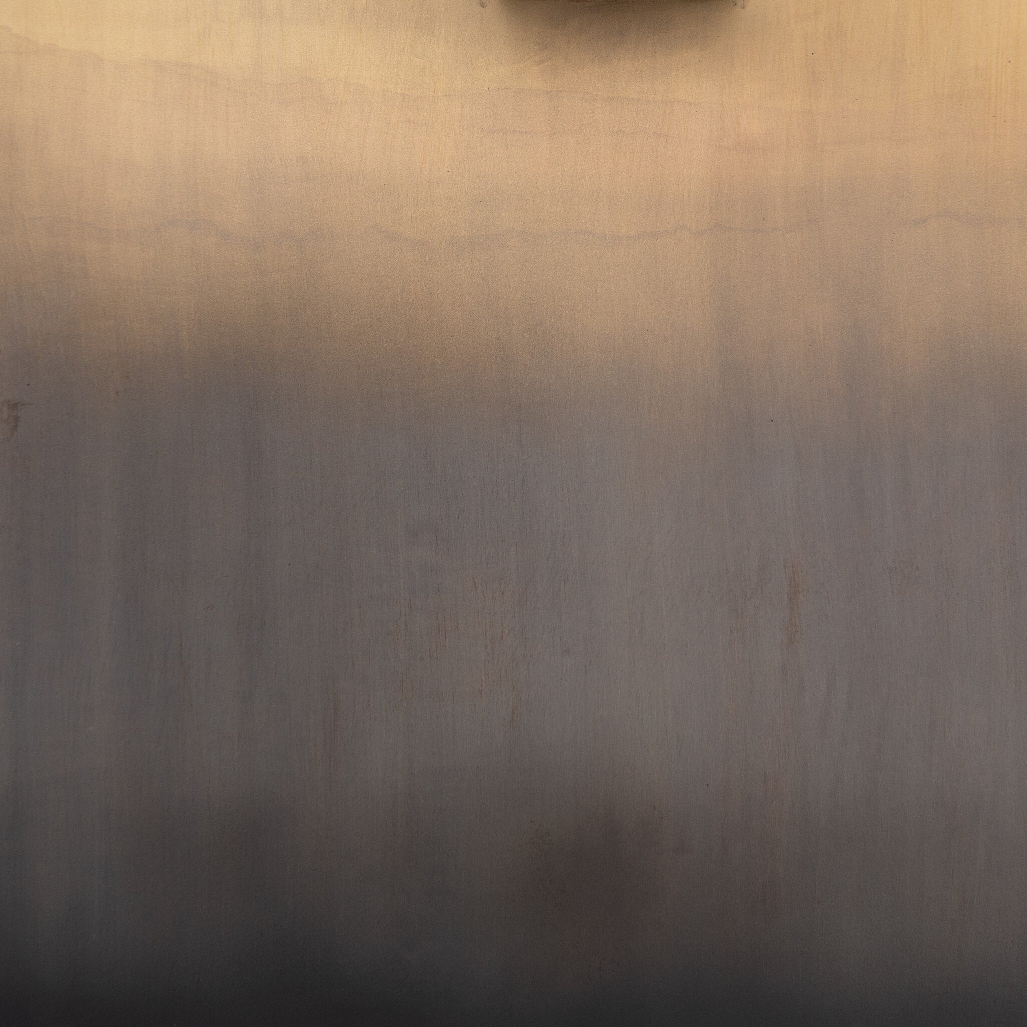 Wide, plank-style legs of brass-finished stainless steel feature an ombre pattern for eye-catching effect, with an intersecting beam adding intrigue. A rectangular black oak tabletop flaunts its materials' natural graining, for a richly organic takeaway.