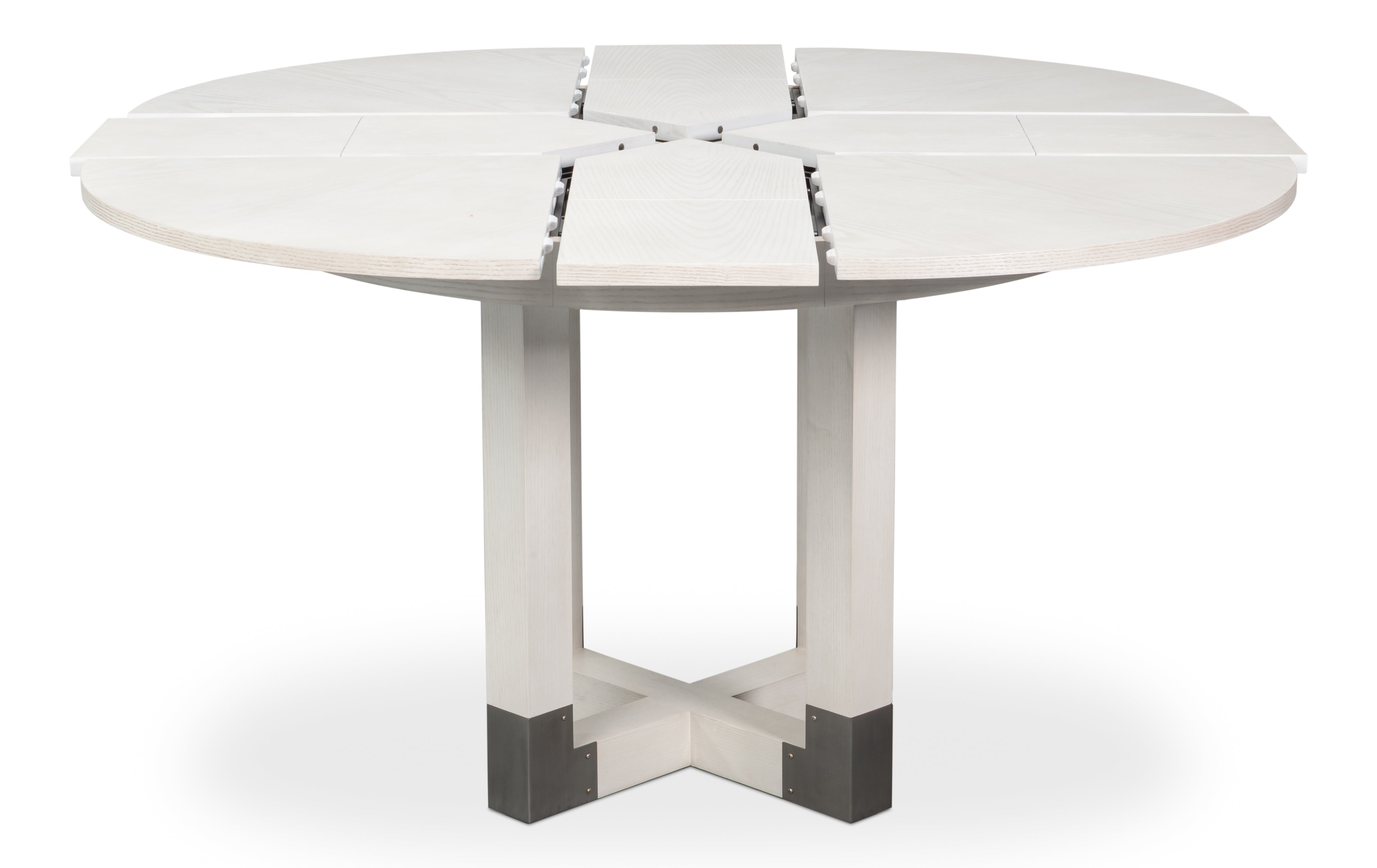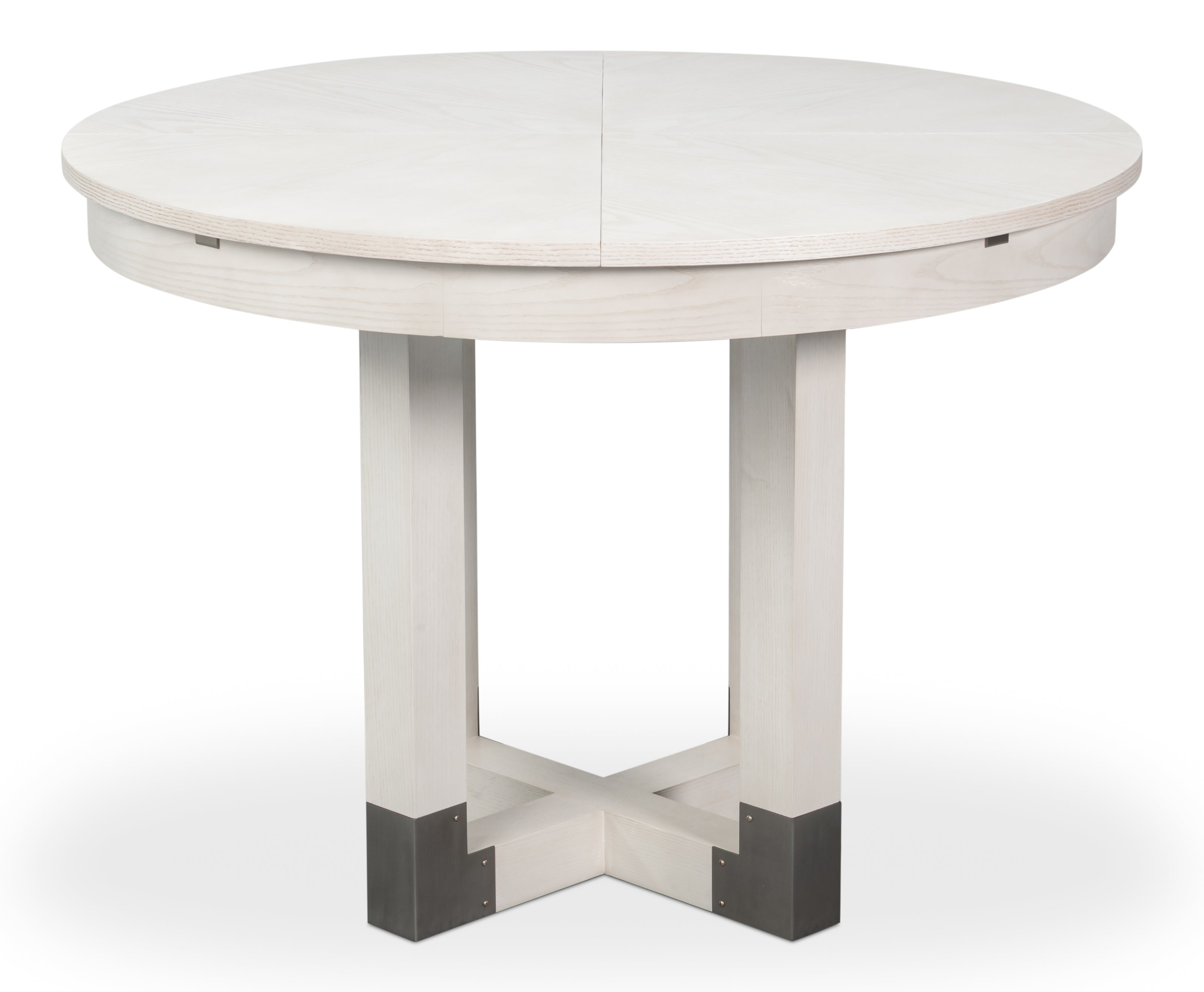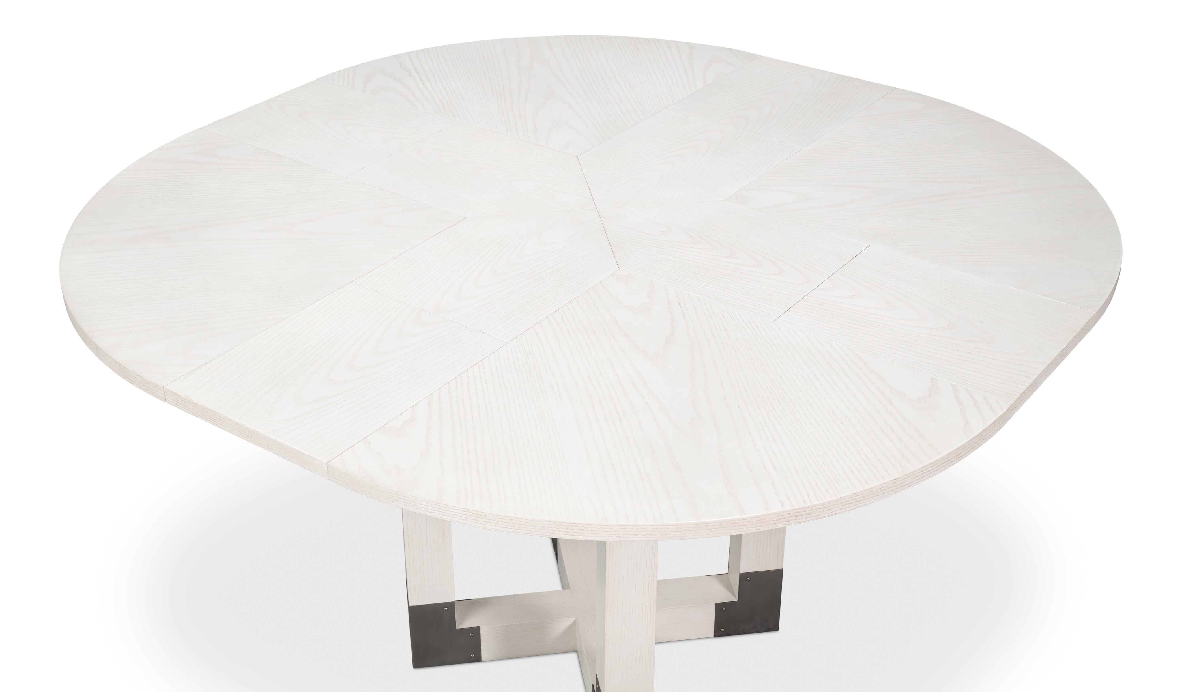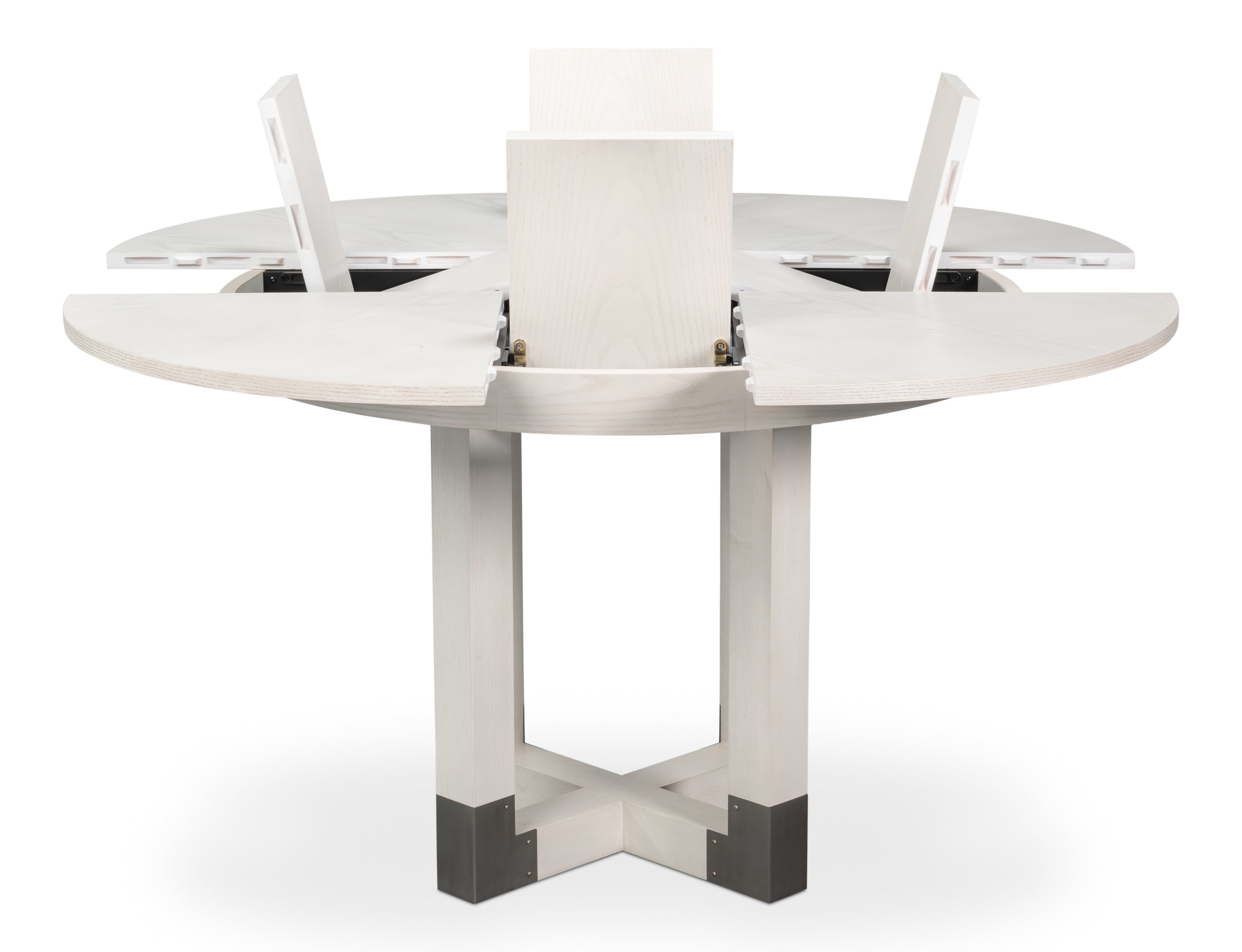 The Brooklyn Round Jupe Table introduces modern style and elegance to smaller dining spaces. Finished in Working White on Ash veneer,the top is anchored by a sleek four post column base connected at the foot and accented in brushed staineless steel. The self-storing expansion mechanism crafted form extruded aluminum requires effortless operation, and when fully extended will accomodate six people.