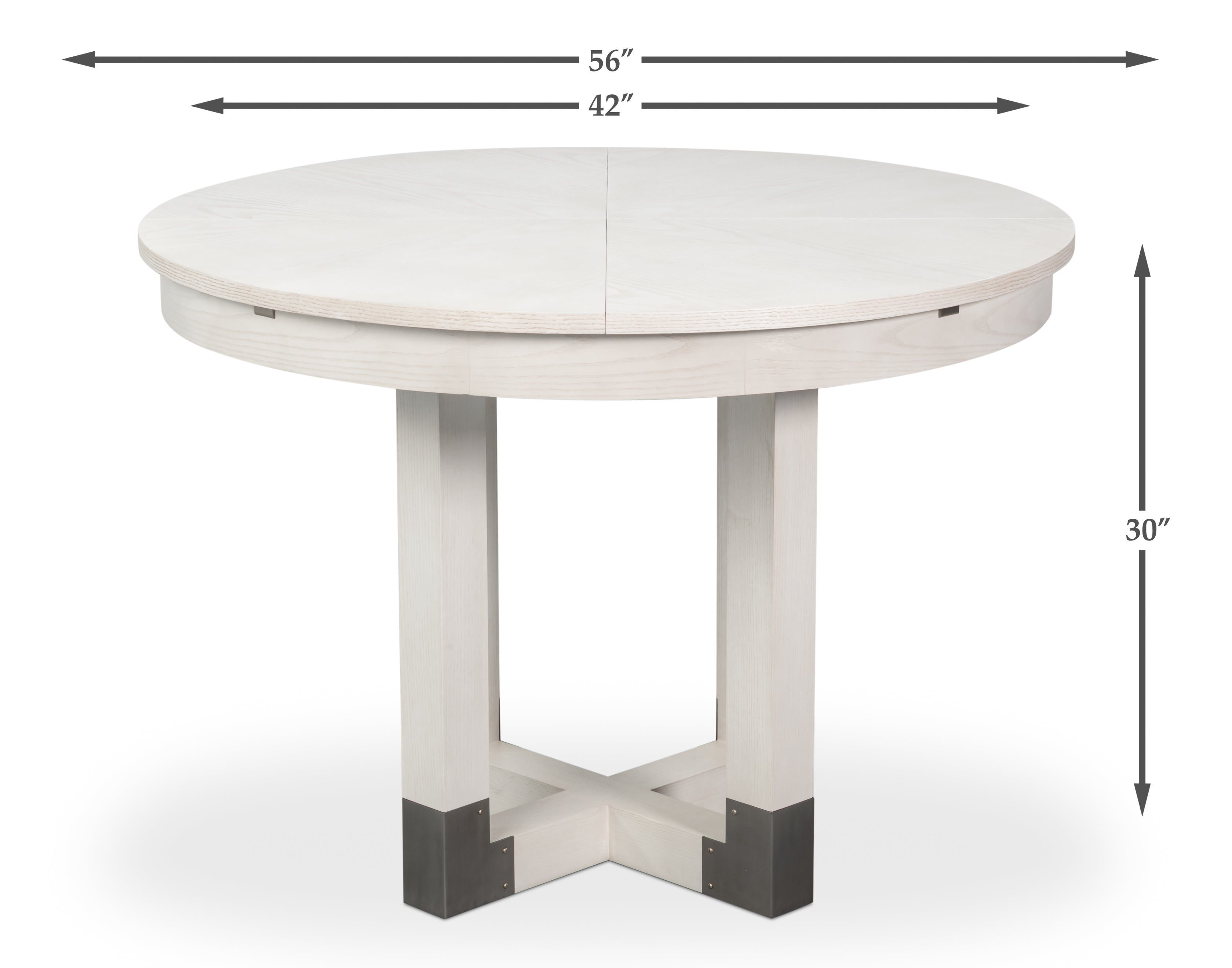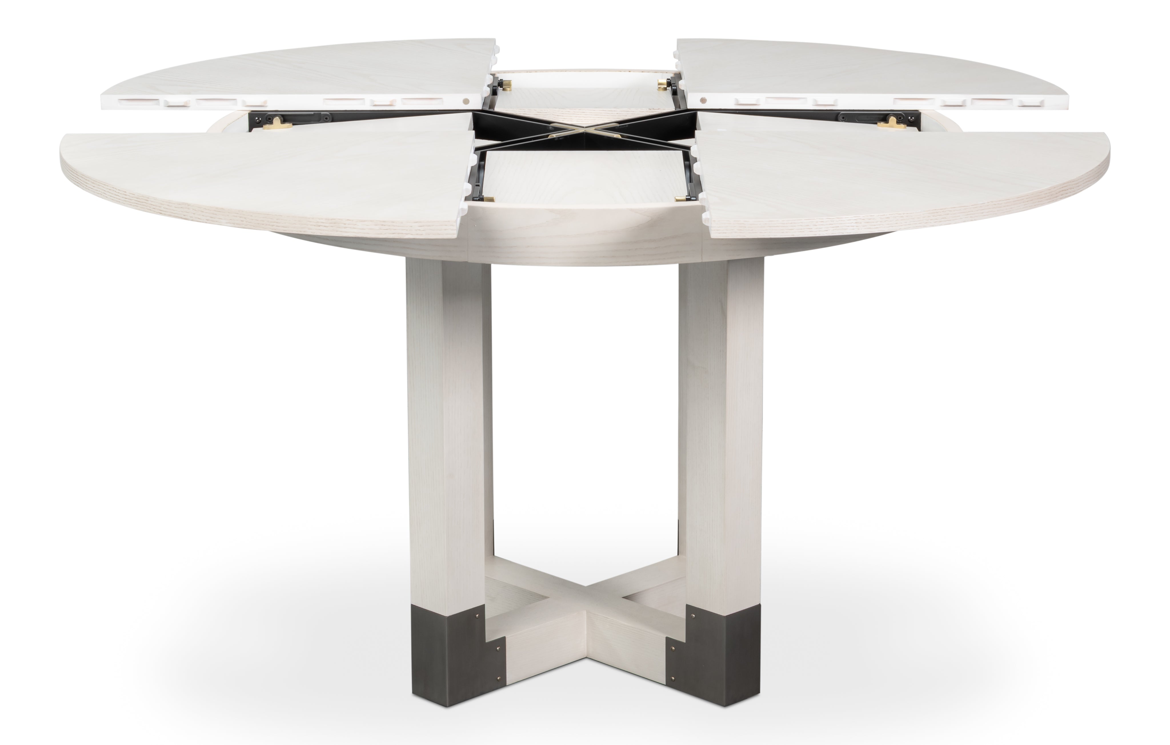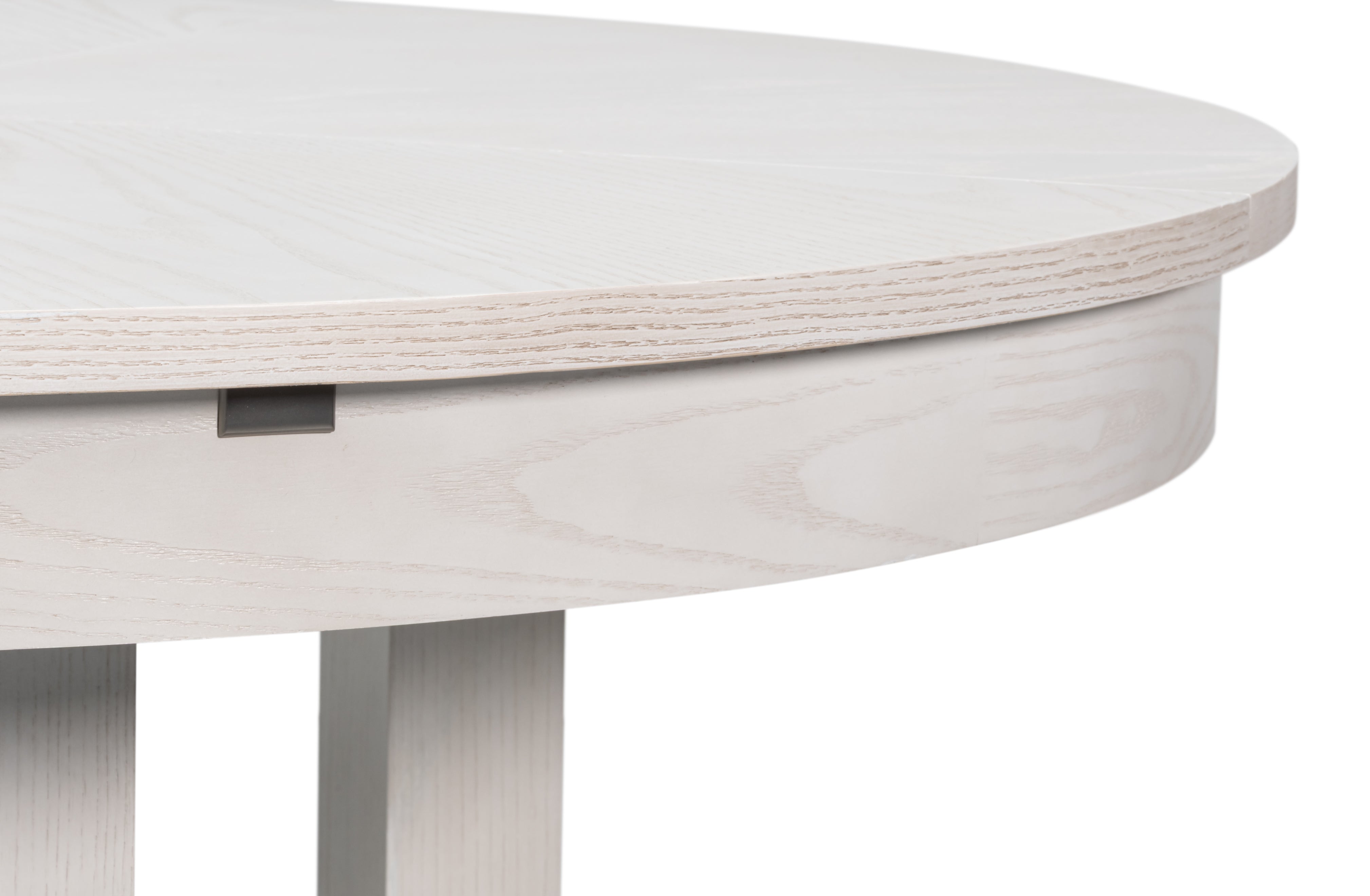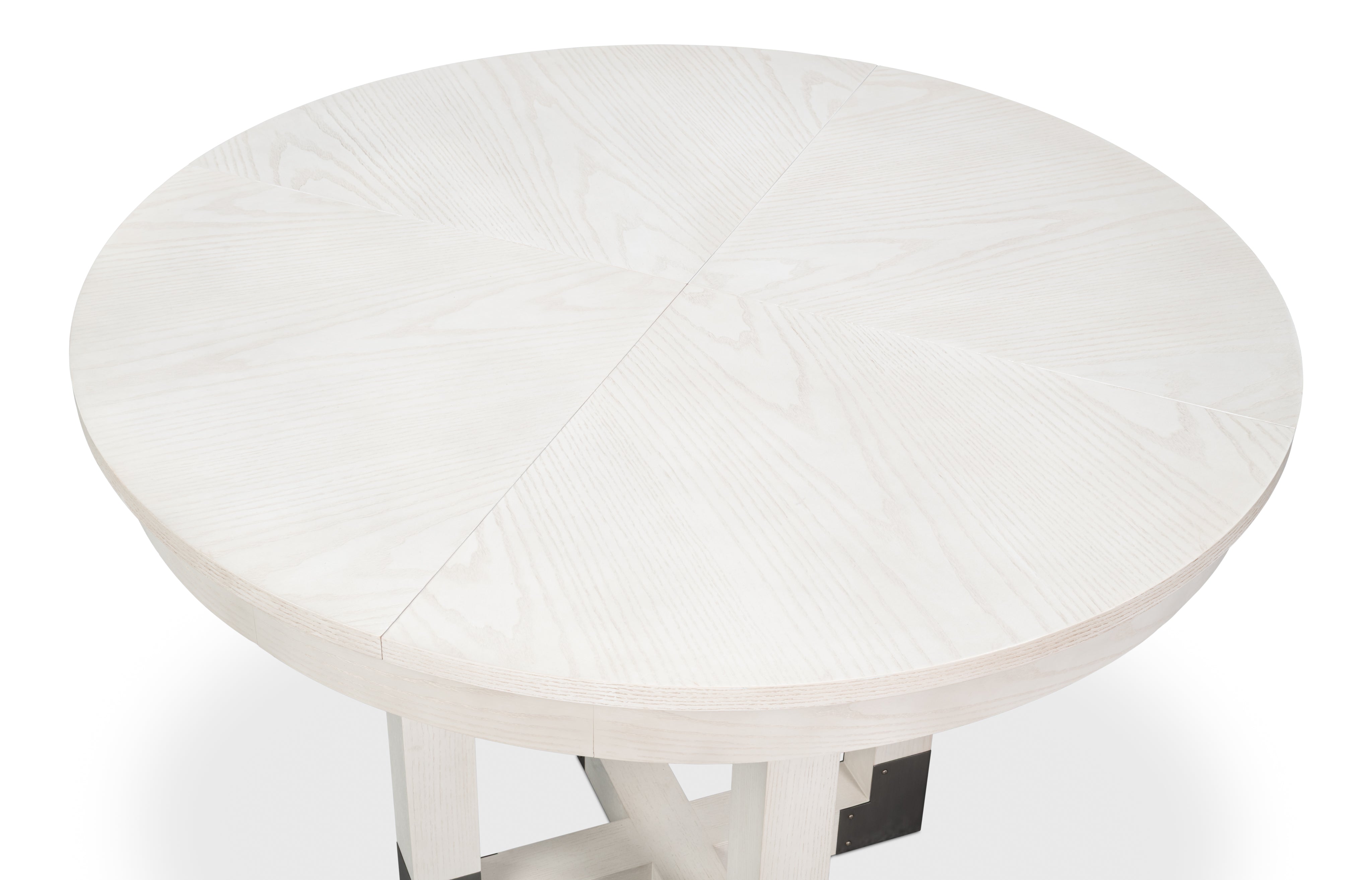The Brooklyn Round Jupe Table introduces modern style and elegance to smaller dining spaces. Finished in Working White on Ash veneer,the top is anchored by a sleek four post column base connected at the foot and accented in brushed staineless steel. The self-storing expansion mechanism crafted form extruded aluminum requires effortless operation, and when fully extended will accomodate six people.
