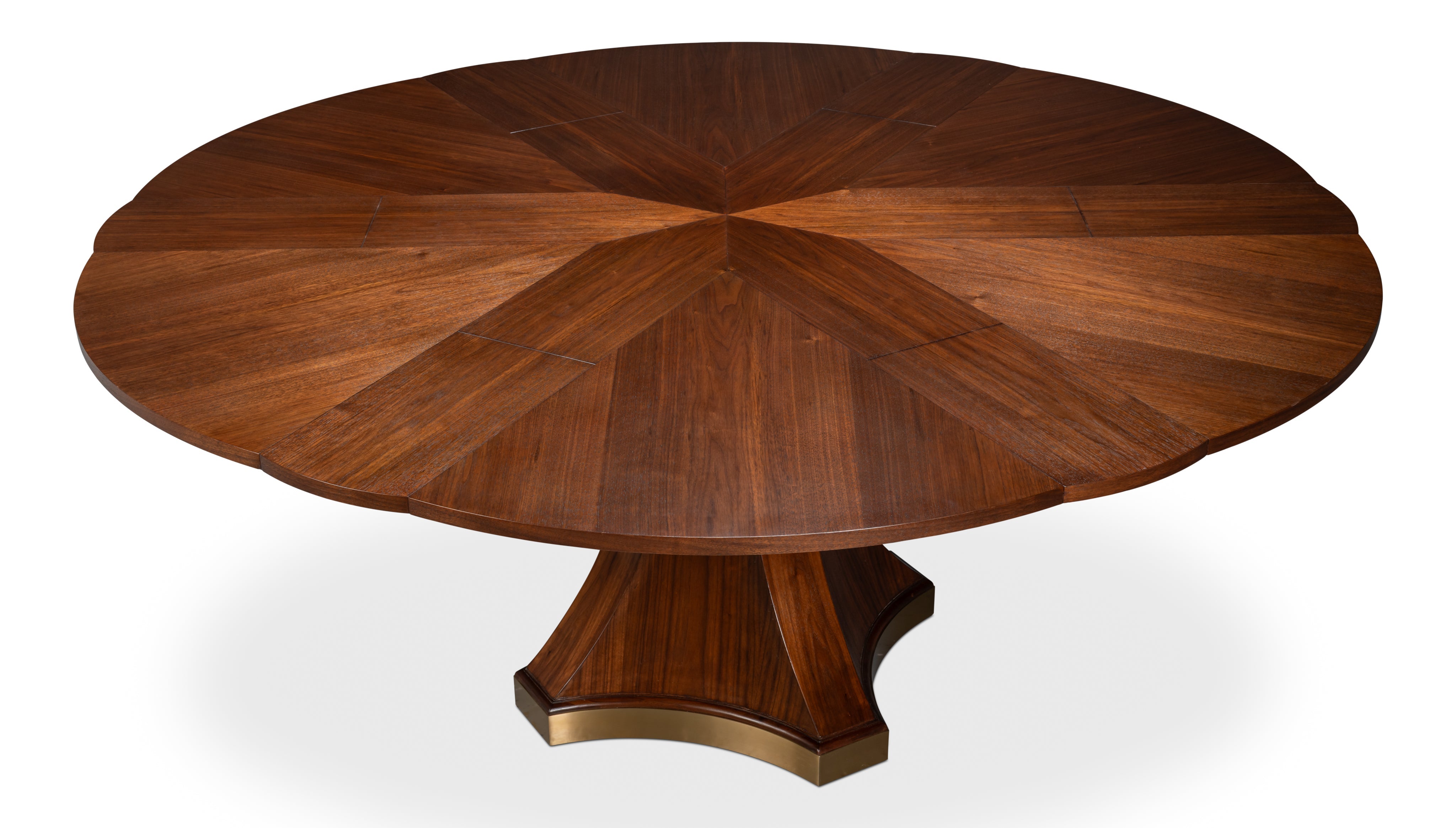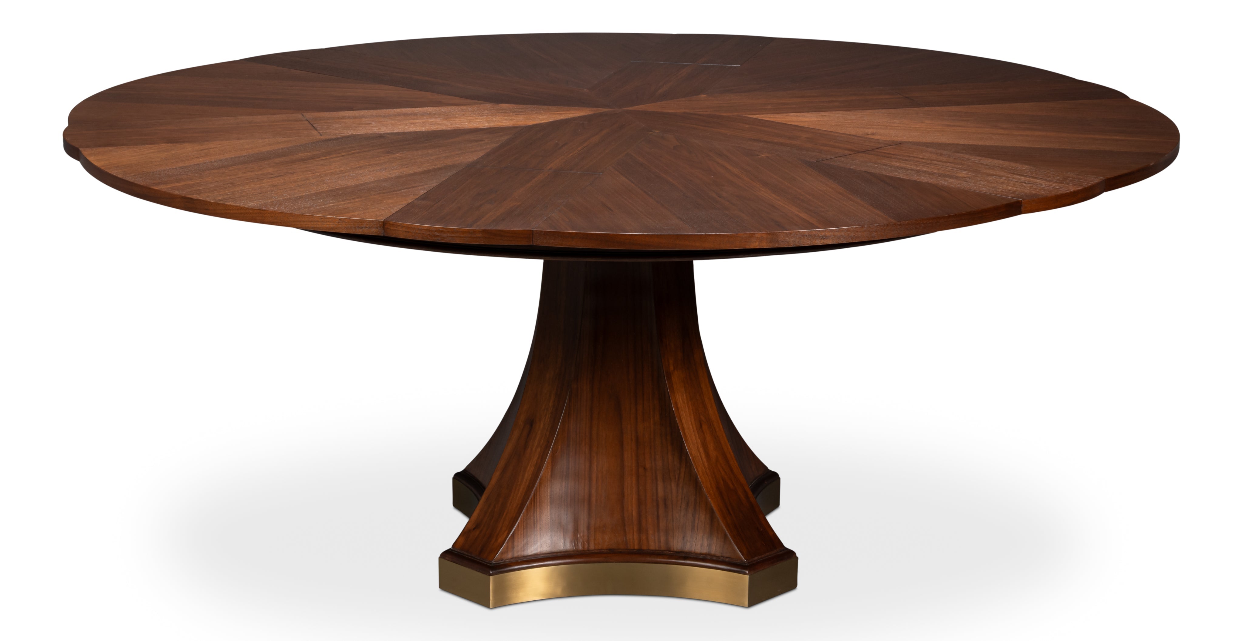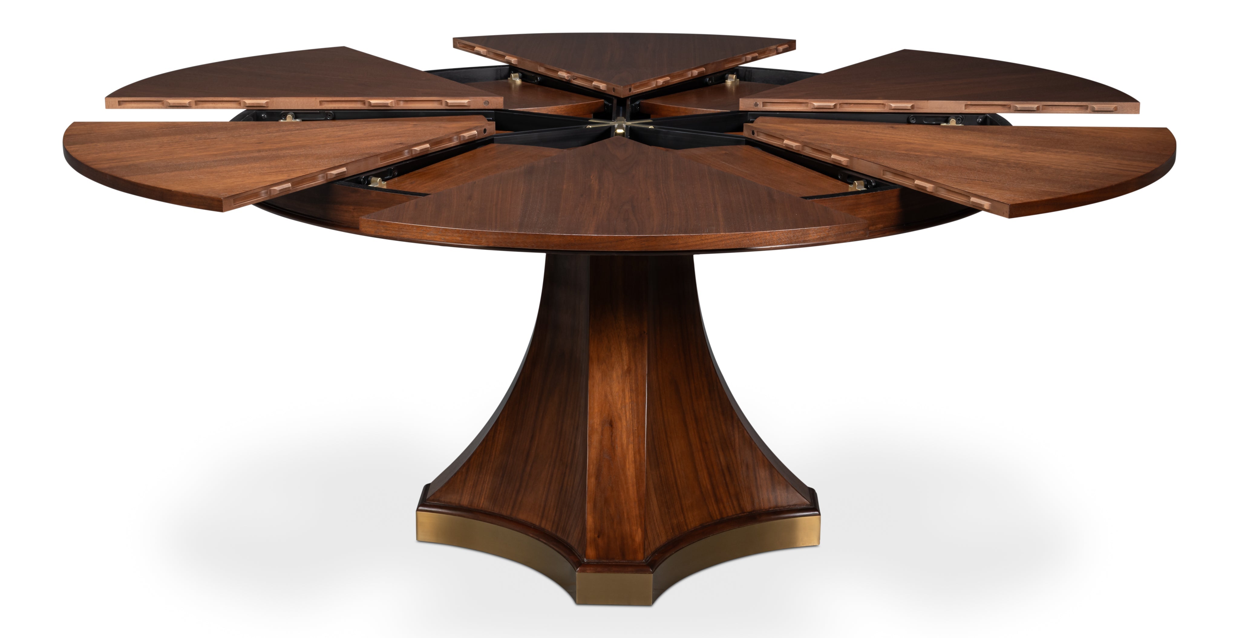 The Chelsea Jupe dining table featuring a dramatic faceted multi-panel base design introduces movement and sophistication, while the brass- capped foot adds a sleek, elevated finish. Paired with the sunburst veneered top, the table balances timeless craftsmanship with a distinctly contemporary presence. The self-storing expansion mechanism crafted from extruded aluminum requires effortless operation and will accomodate six people when fully extended.