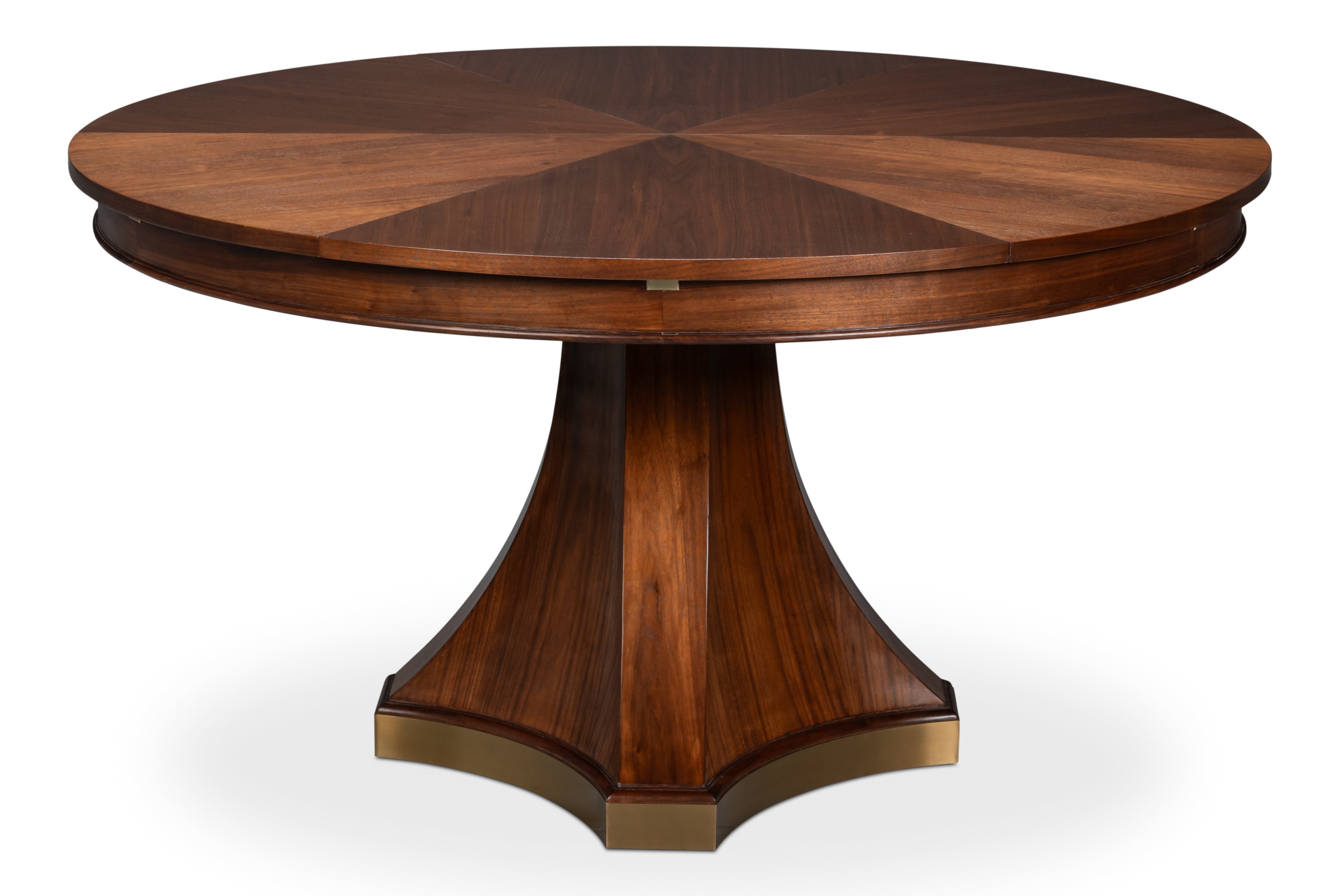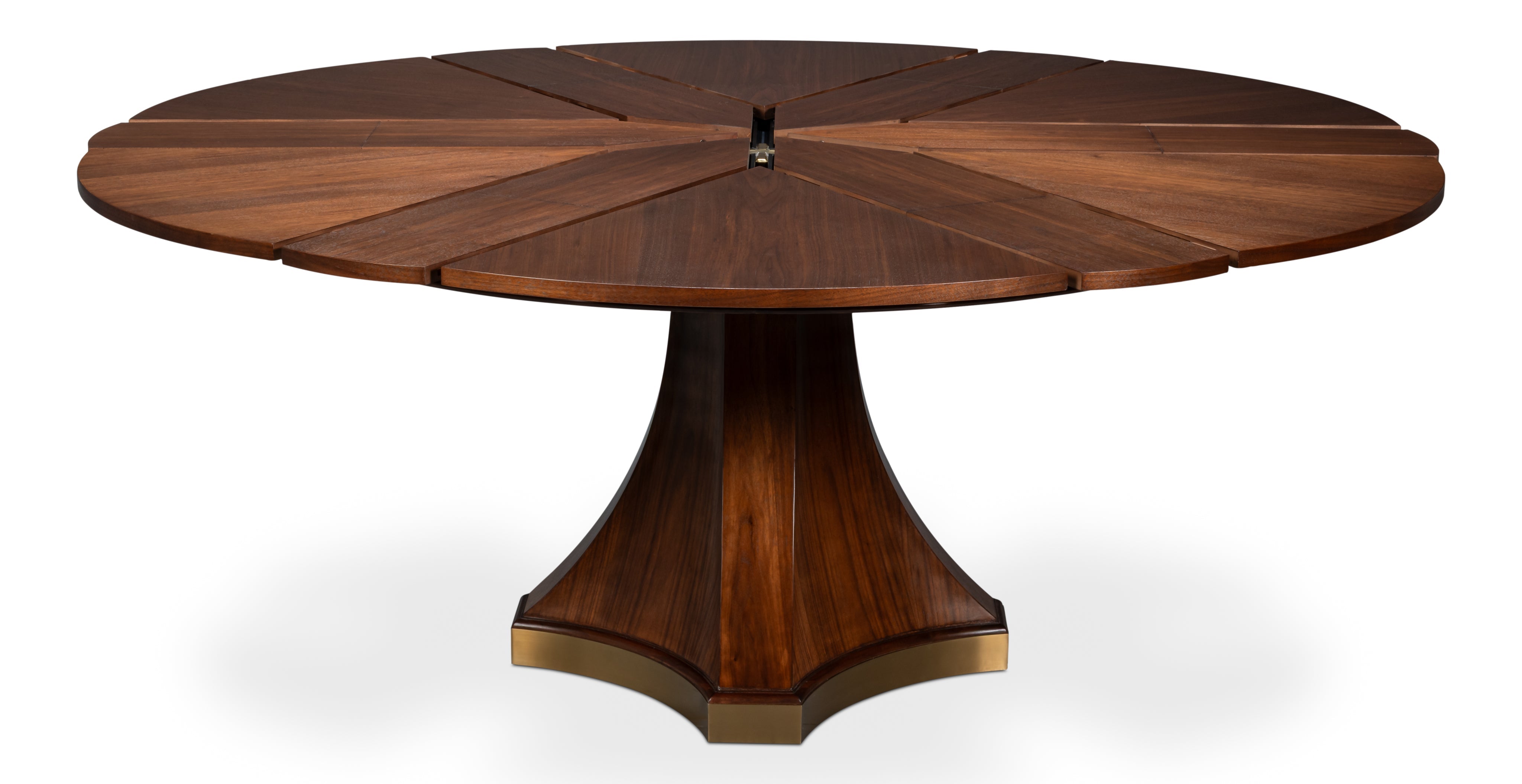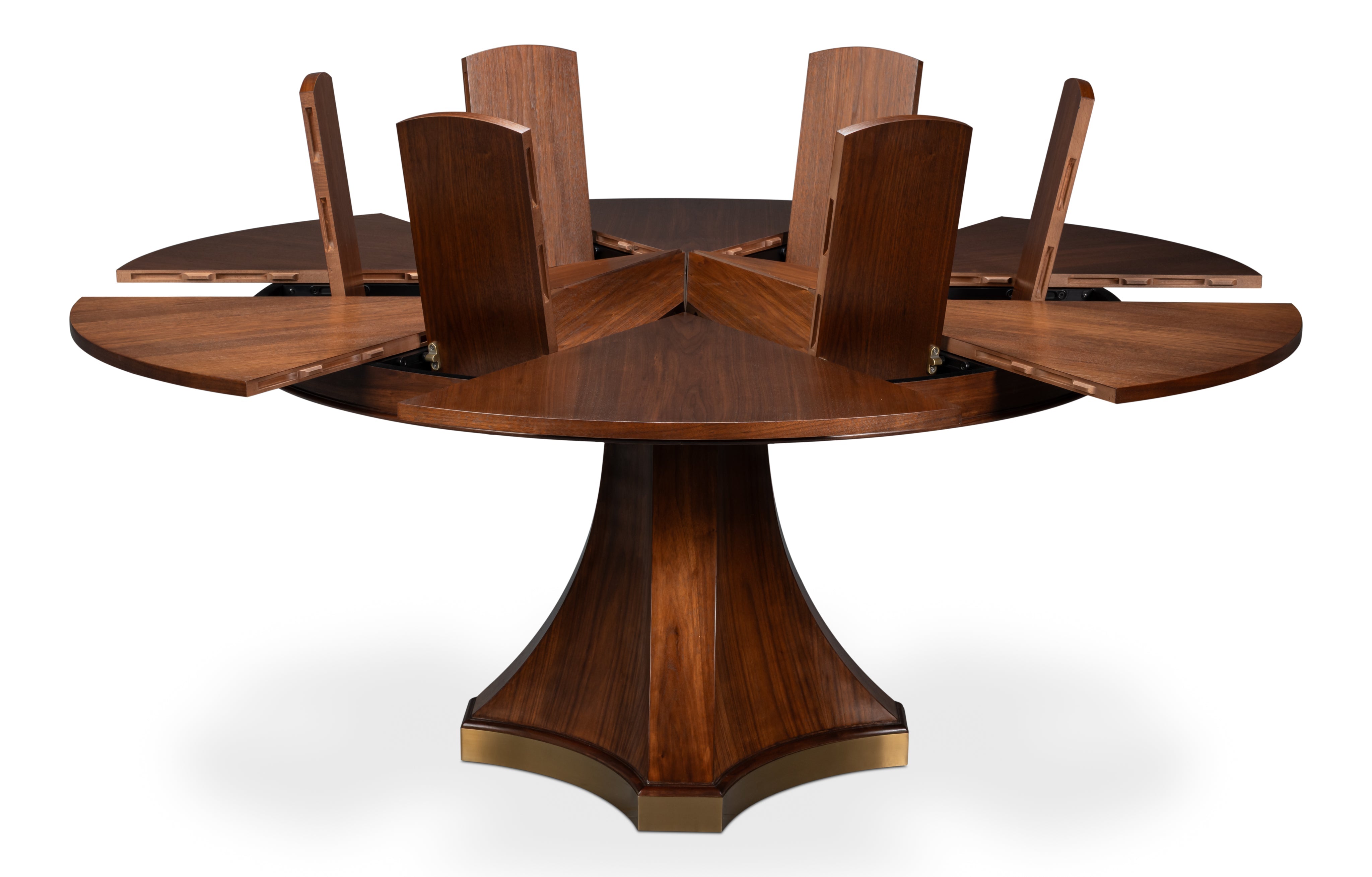 The Chelsea Jupe dining table featuring a dramatic faceted multi-panel base design introduces movement and sophistication, while the brass- capped foot adds a sleek, elevated finish. Paired with the sunburst veneered top, the table balances timeless craftsmanship with a distinctly contemporary presence. The self-storing expansion mechanism crafted from extruded aluminum requires effortless operation and will accomodate six people when fully extended.