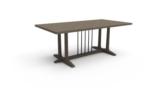 Formal, yet familiar, this expansive dining table is made for everyday moments and gatherings with extended family. Its expert craftsmanship mixes casual finishes and textures with classic design elements for a timeless style to last through generations. Inspired by an antique parquet floor, its diamond tabletop features a wire-brushed finish in Ash Driftwood. Candlestick metal legs at the center lend a traditional element in a rich Chocolate Bronze finish. Table extends to 114.5 inches with two leaves, featuring equalizing slides for added stability.
