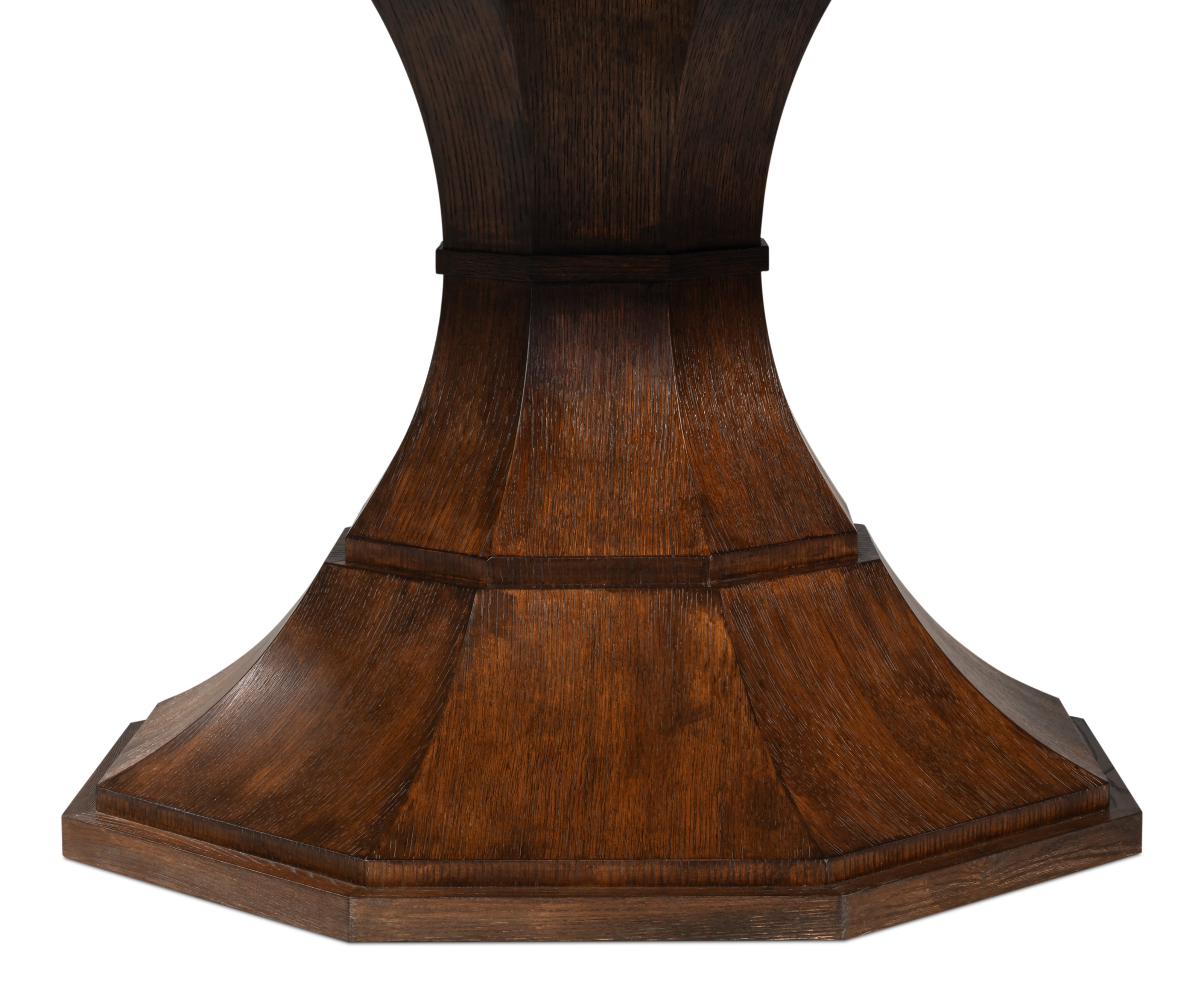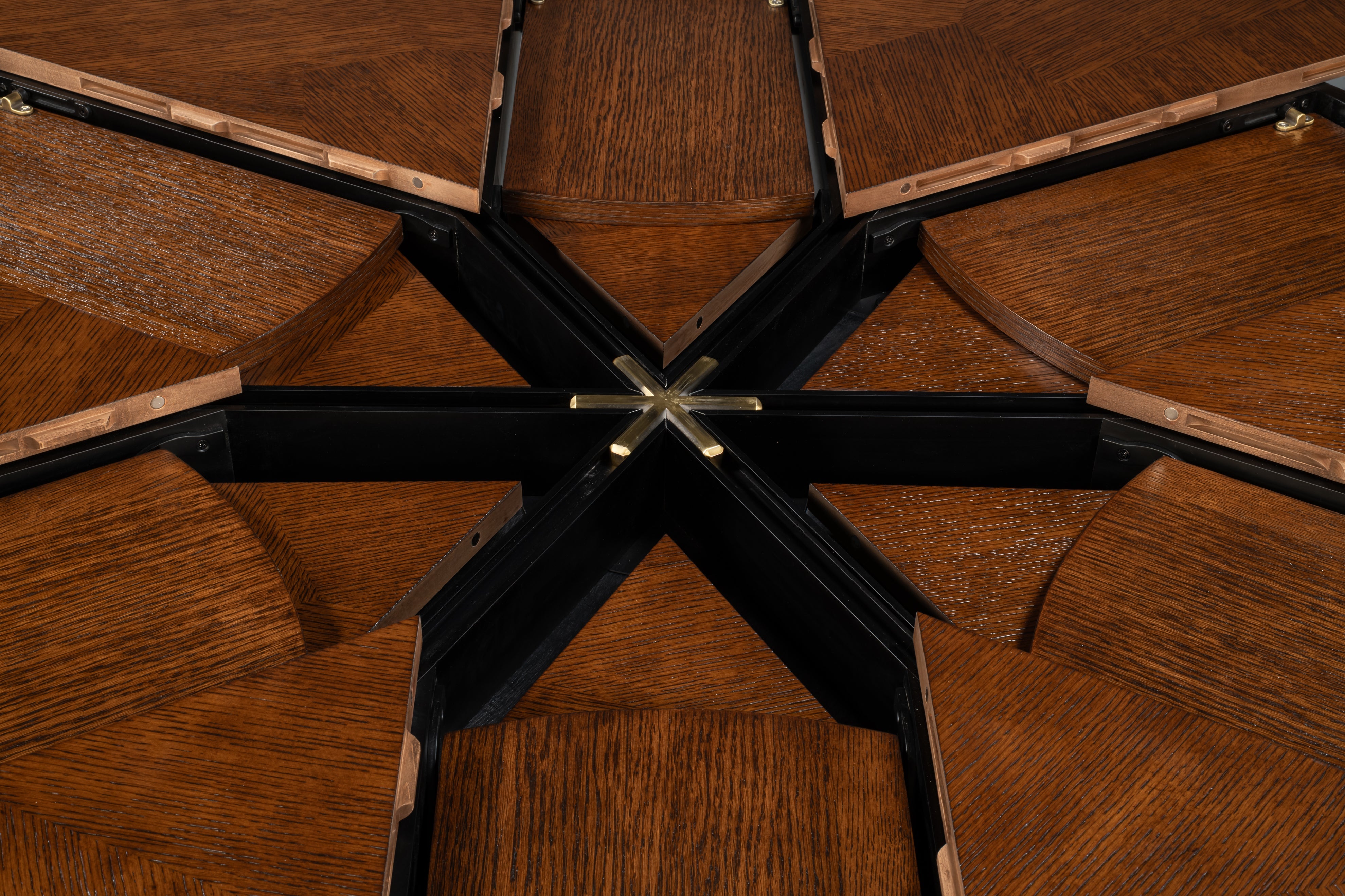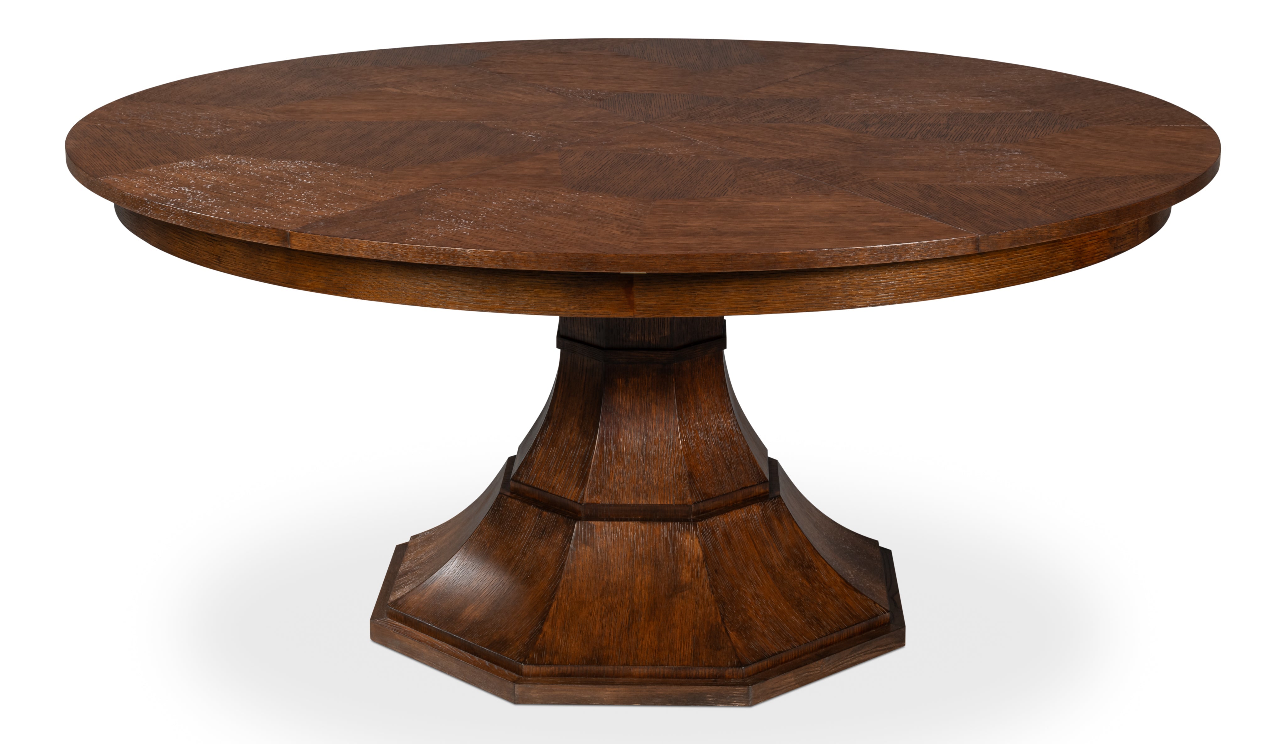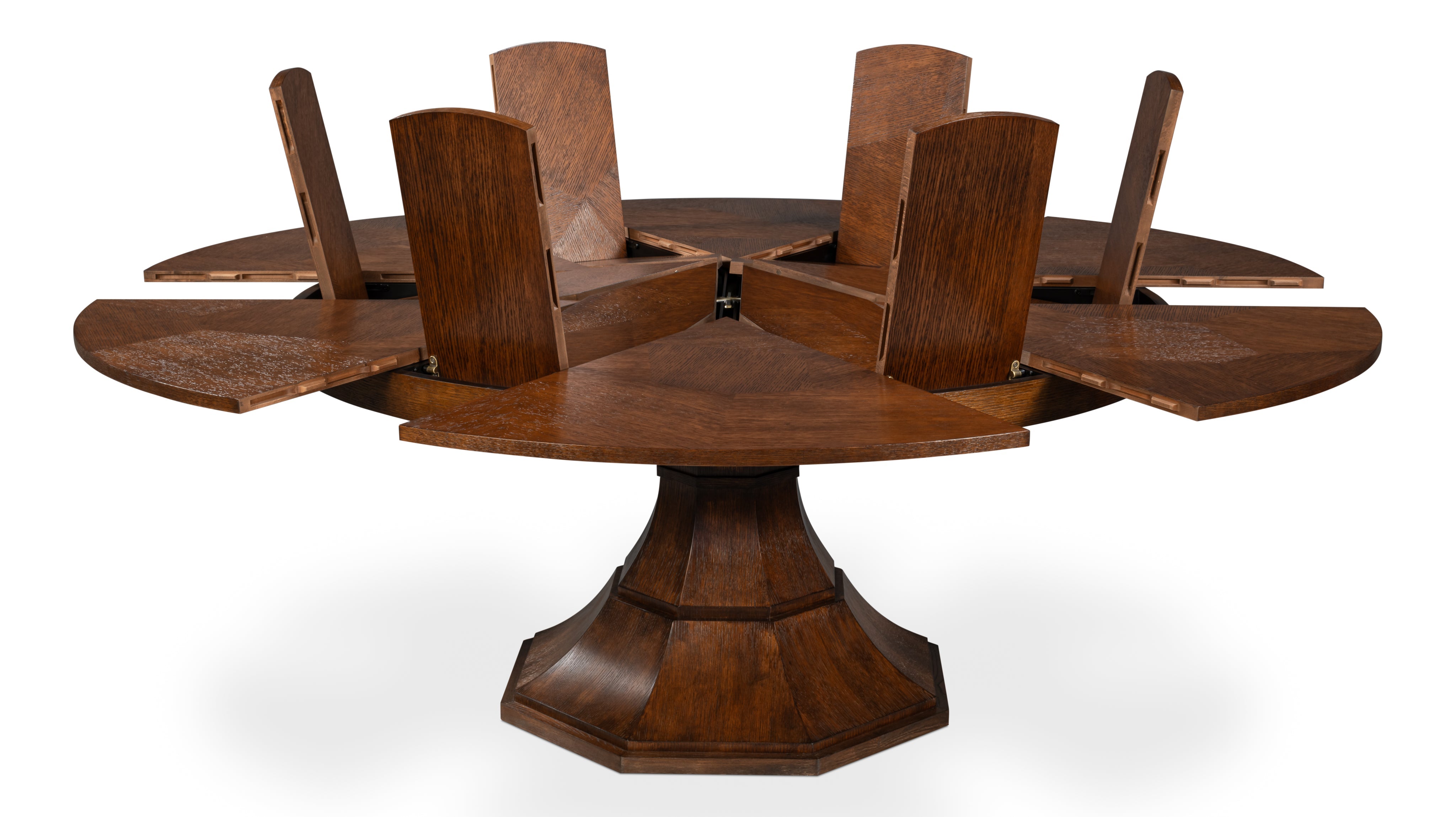 The Giselle Jupe Table exemplifies transtional style. The herringbone marquetry on the top and curved facets of the octagonal base make it a beautiful and fuctional addition to any dining space. Sarreid"s newly reengineered Jupe Dining Tables bring a timeless 19th-century innovation into the modern age. Featuring a self-storing expansion mechanism crafted from extruded aluminum , these tables expand effortlessly, providing both smooth operation and simplified assembly.