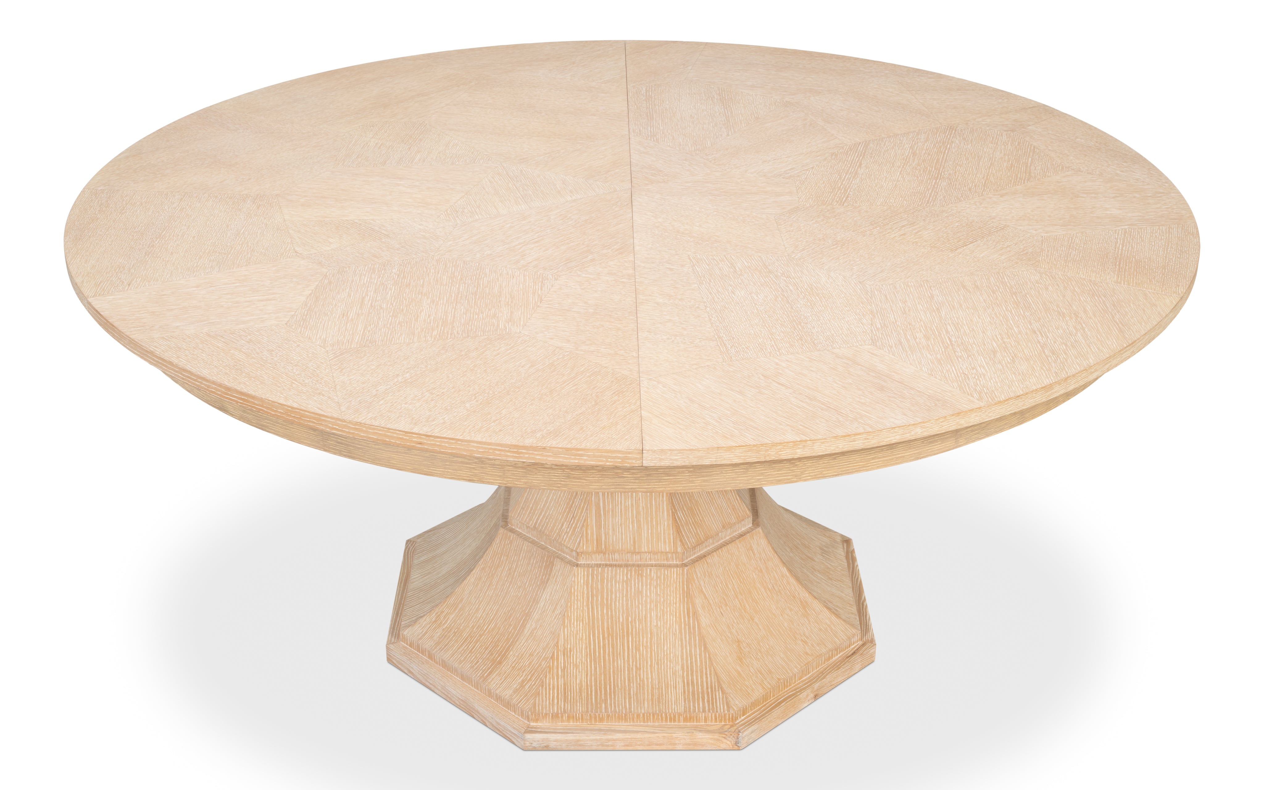 The Giselle Jupe Table exemplifies transitional style. The herringbone marquetry on the top and curved facets of the octagonal base make it a beautiful and functional addition to any dining space. Sarreid"s newly reengineered Jupe Dining Tables bring a timeless 19th-century innovation into the modern age. Featuring a self-storing expansion mechanism crafted from extruded aluminum , these tables expand effortlessly, providing both smooth operation and simplified assembly.