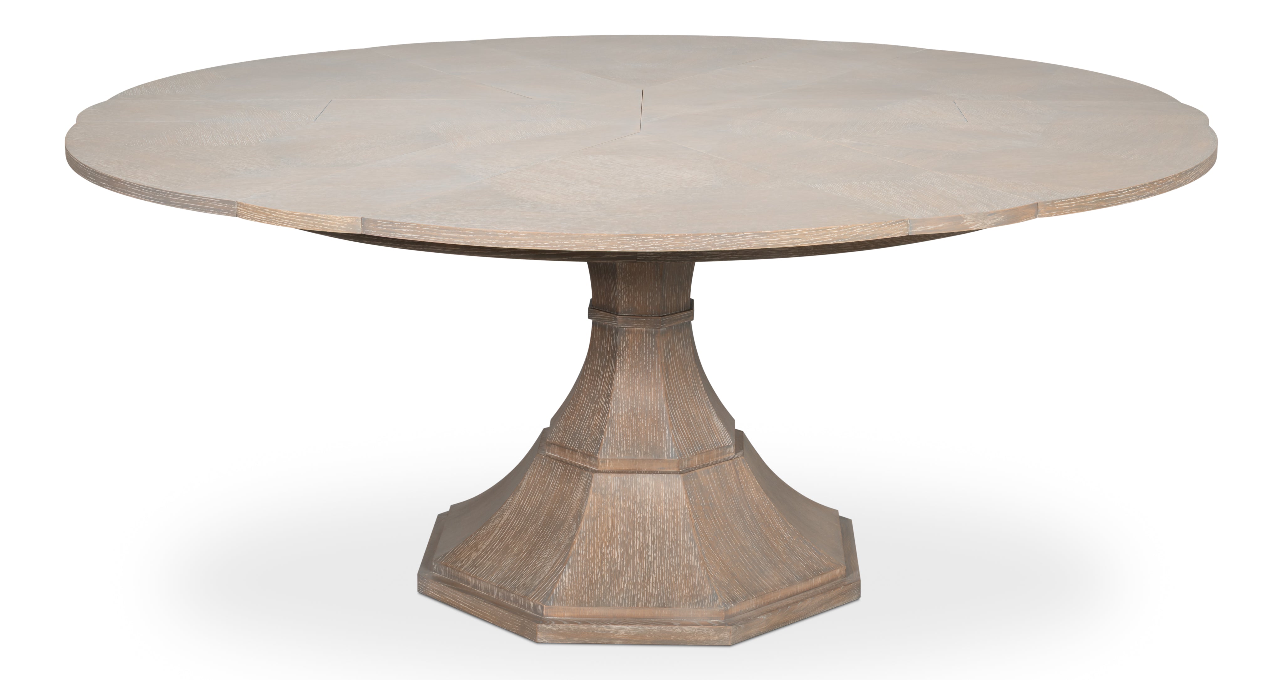 The Giselle Jupe Table exemplifies transitional style. The herringbone marquetry on the top and curved facets of the octagonal base make it a beautiful and functional addition to any dining space. Sarreid"s newly reengineered Jupe Dining Tables bring a timeless 19th-century innovation into the modern age. Featuring a self-storing expansion mechanism crafted from extruded aluminum , these tables expand effortlessly, providing both smooth operation and simplified assembly.