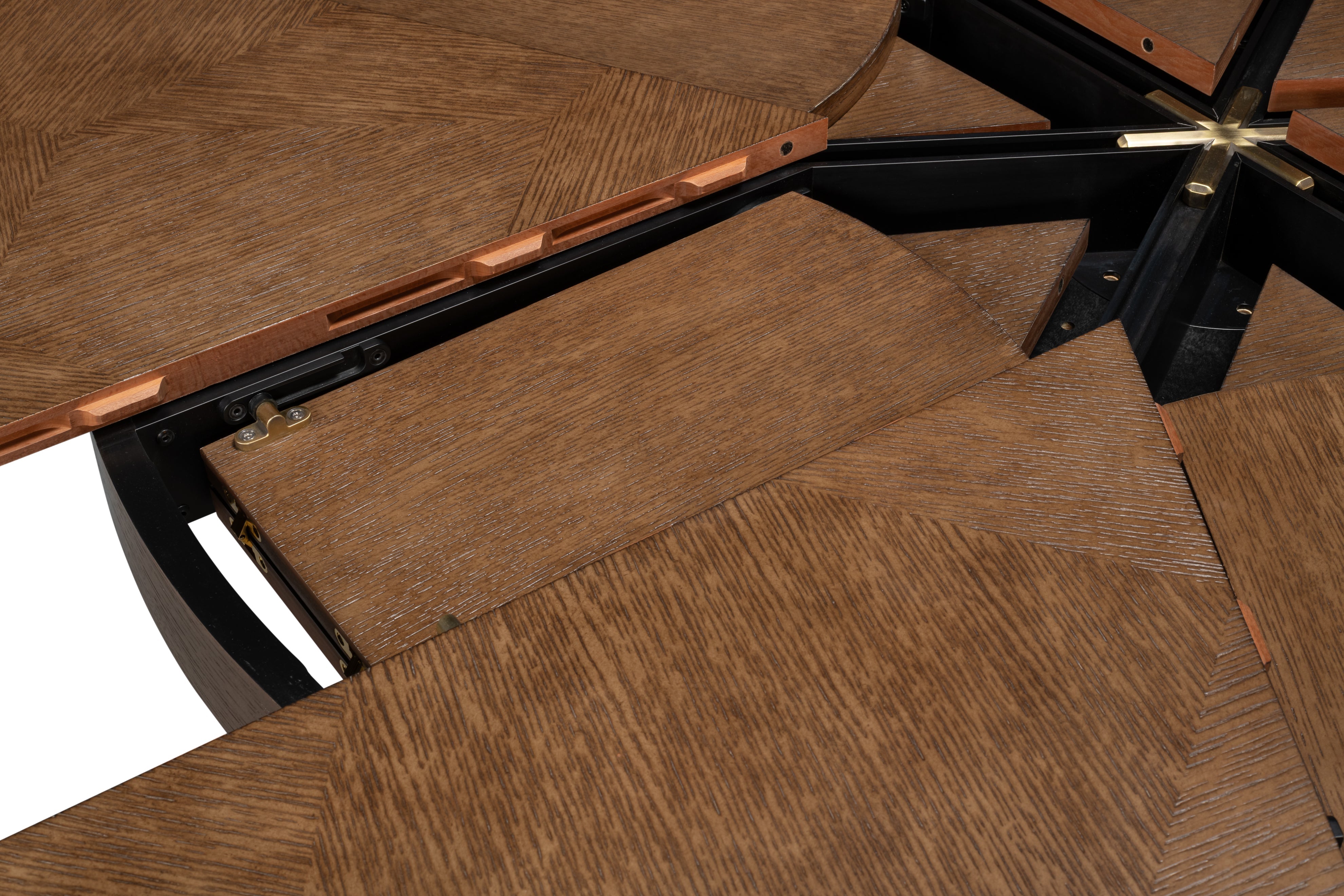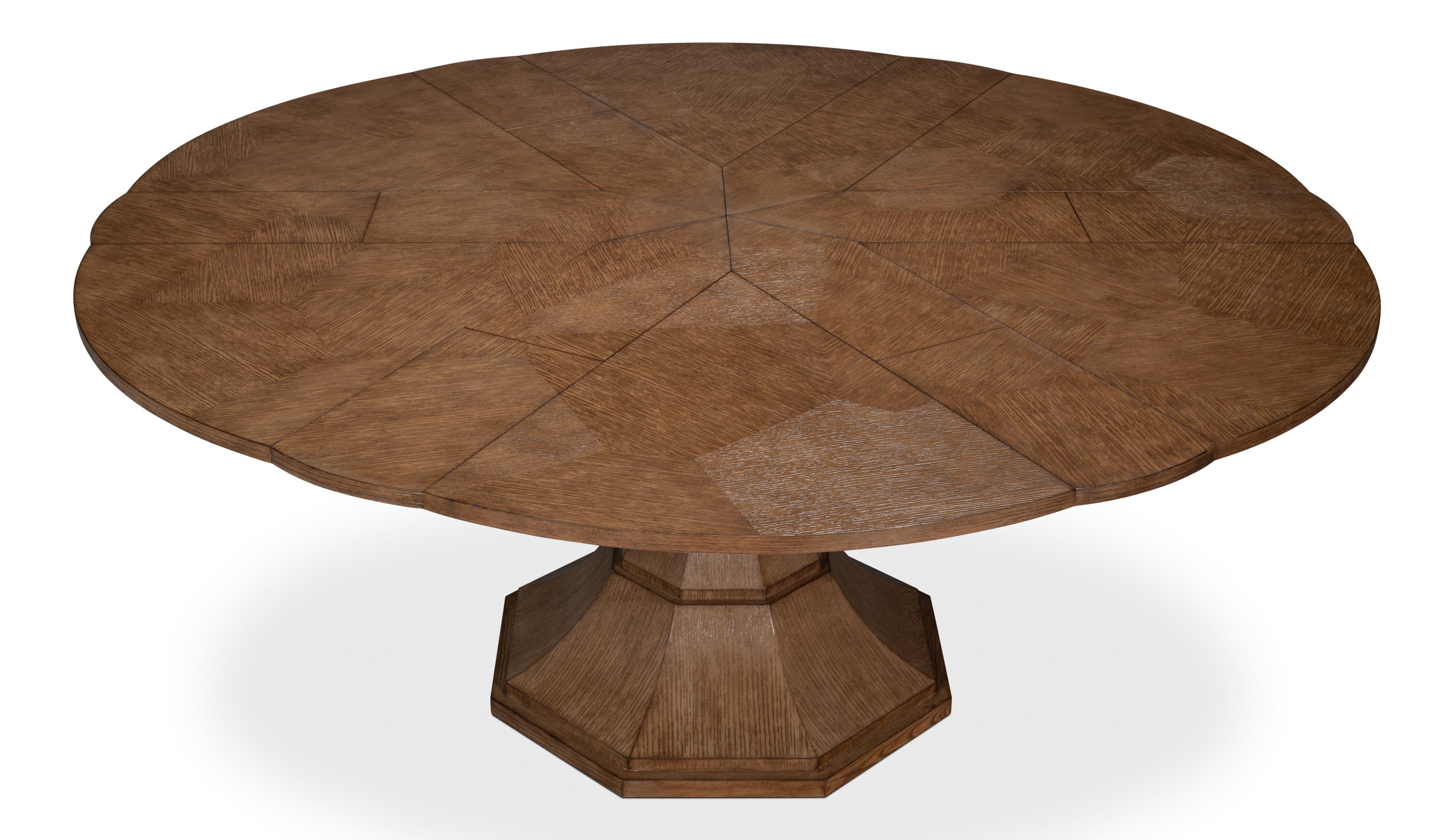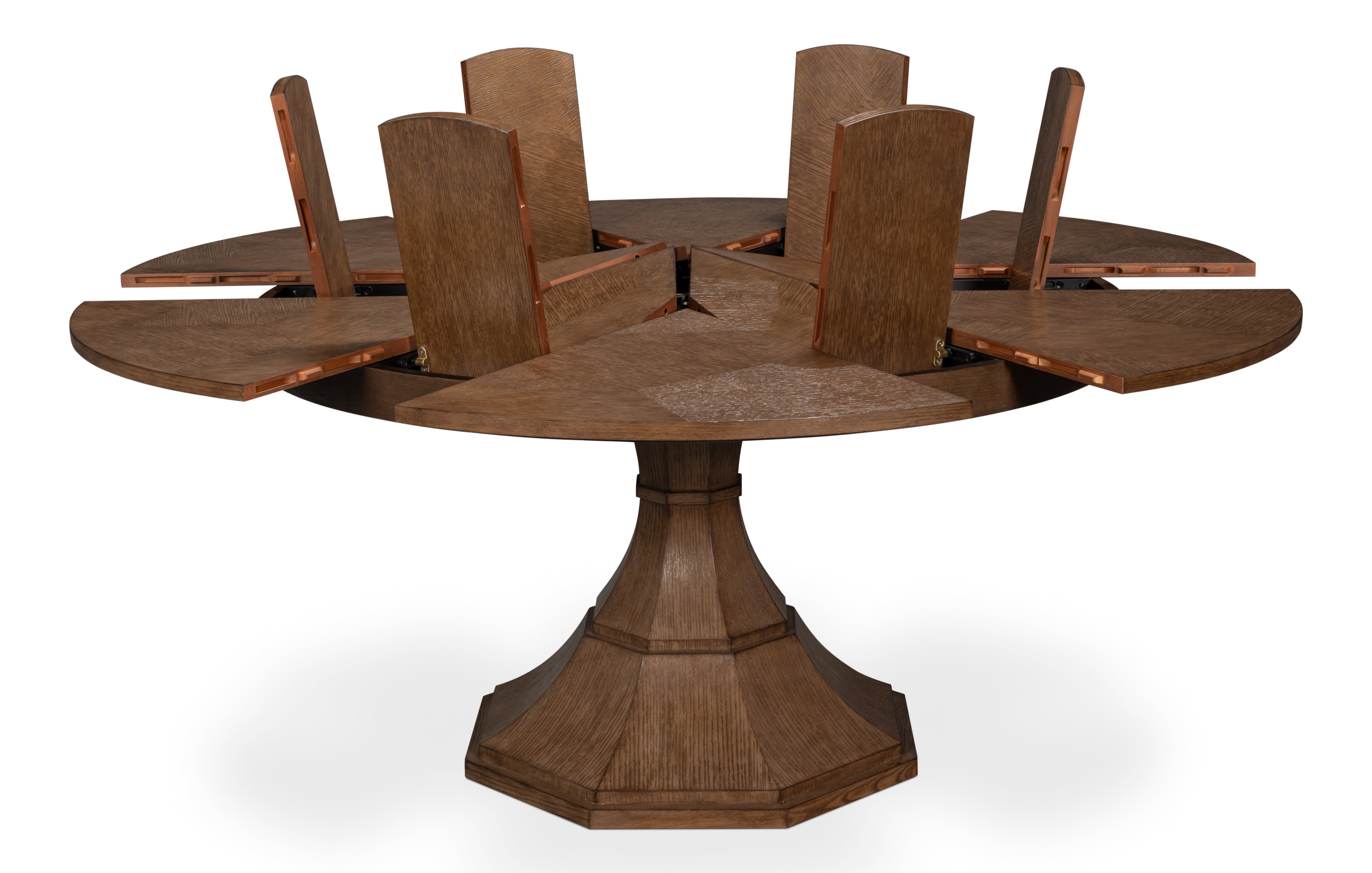 The Giselle Jupe Table exemplifies transitional style. The herringbone marquetry on the top and curved facets of the octagonal base make it a beautiful and functional addition to any dining space. Sarreid"s newly reengineered Jupe Dining Tables bring a timeless 19th-century innovation into the modern age. Featuring a self-storing expansion mechanism crafted from extruded aluminum , these tables expand effortlessly, providing both smooth operation and simplified assembly.