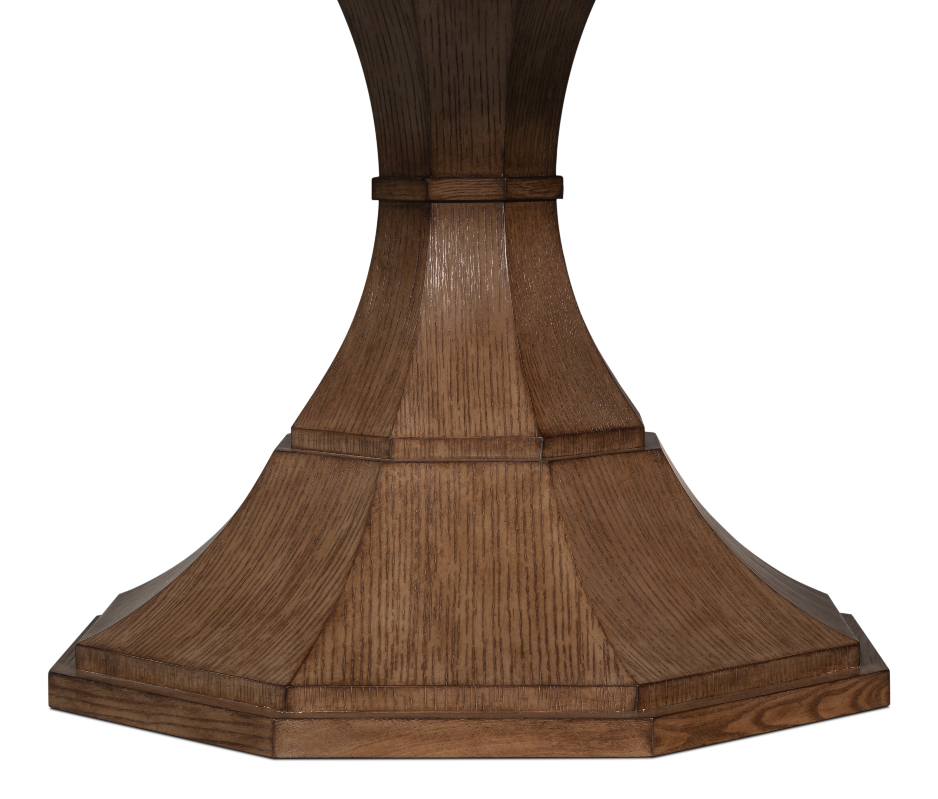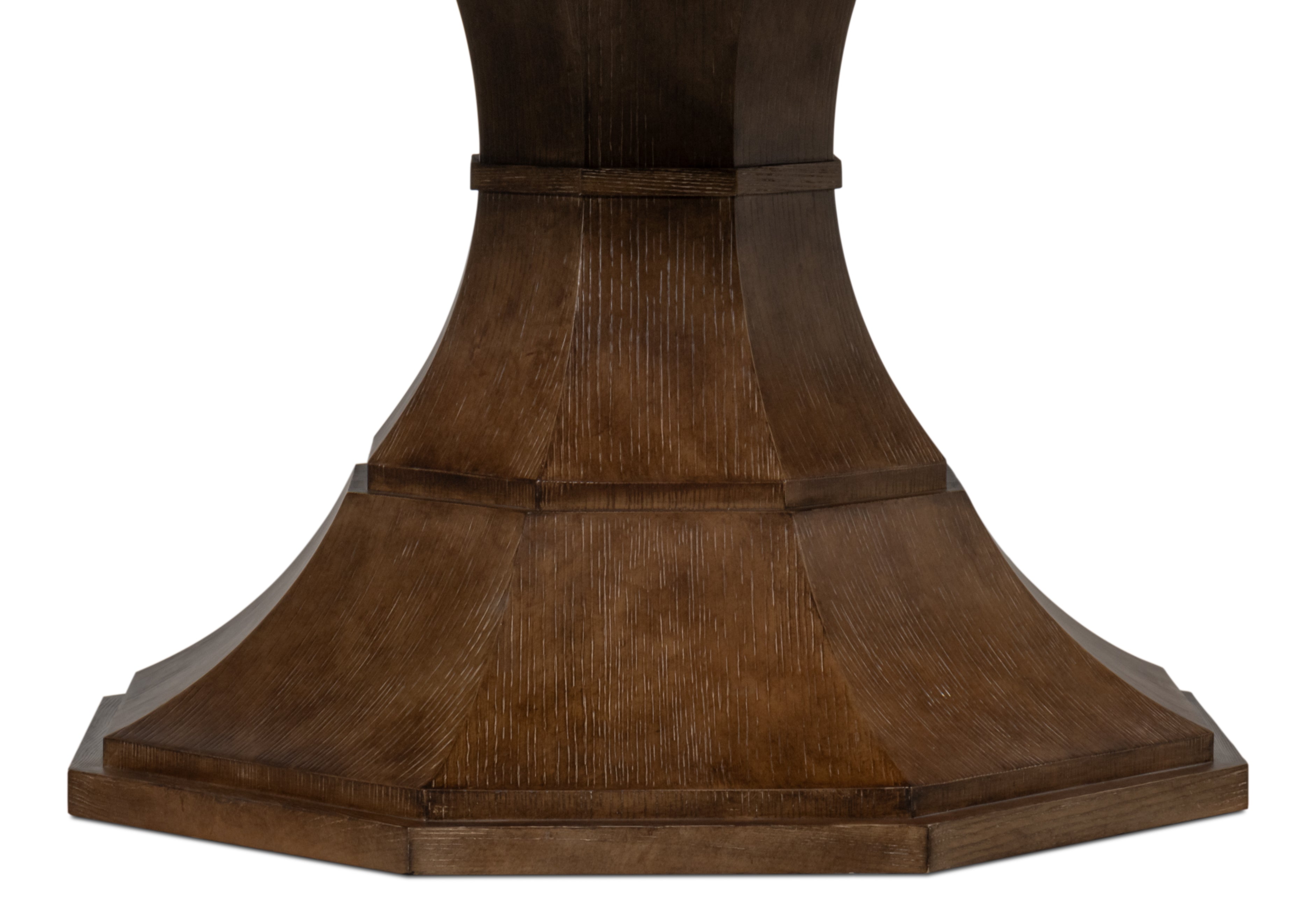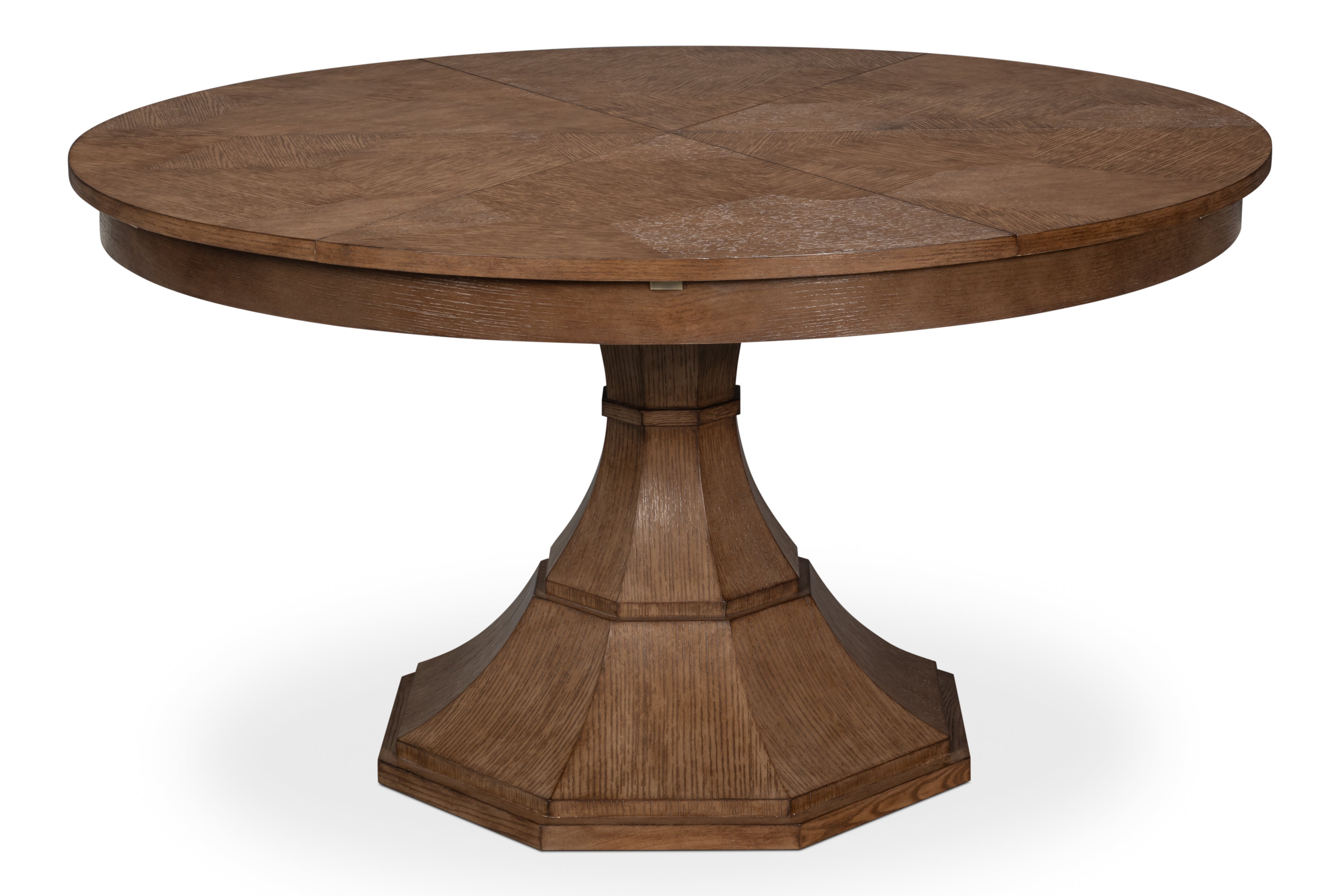 The Giselle Jupe Table exemplifies transitional style. The herringbone marquetry on the top and curved facets of the octagonal base make it a beautiful and functional addition to any dining space. Sarreid"s newly reengineered Jupe Dining Tables bring a timeless 19th-century innovation into the modern age. Featuring a self-storing expansion mechanism crafted from extruded aluminum , these tables expand effortlessly, providing both smooth operation and simplified assembly.