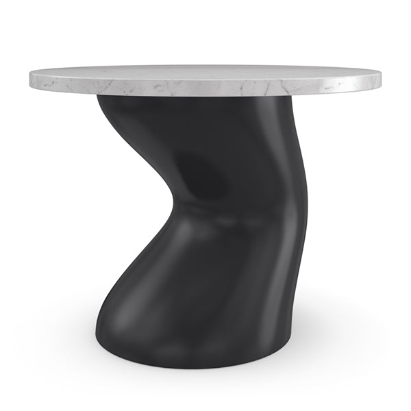 A captivating centerpiece in any interior, this dining table introduces timeless elegance with a modern aesthetic. Features a luxurious stone tabletop, beautifully balanced on a curvy, matte black base for striking contrast and visual appeal. Perfectly scaled for urban spaces and more intimate dining experiences.