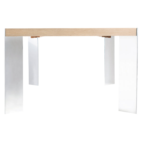 The Modulum dining table offers an elegantly modern design with polished stainless steel planes supporting a beautiful wood top. The legs, set at a 45-degree angle, pierce the wood top to create a stunning pattern when viewed from above. The sharply tailored look makes a chic statement.