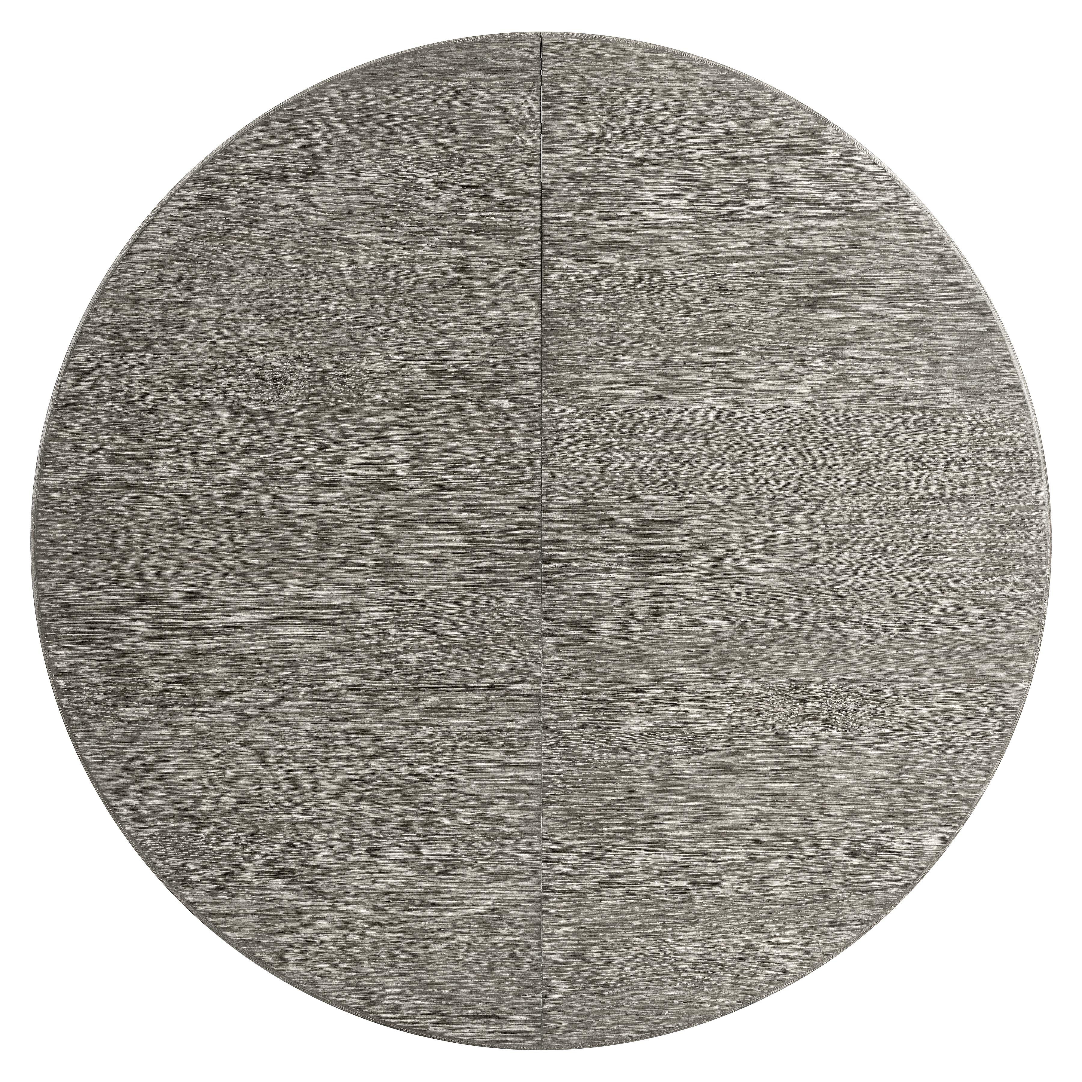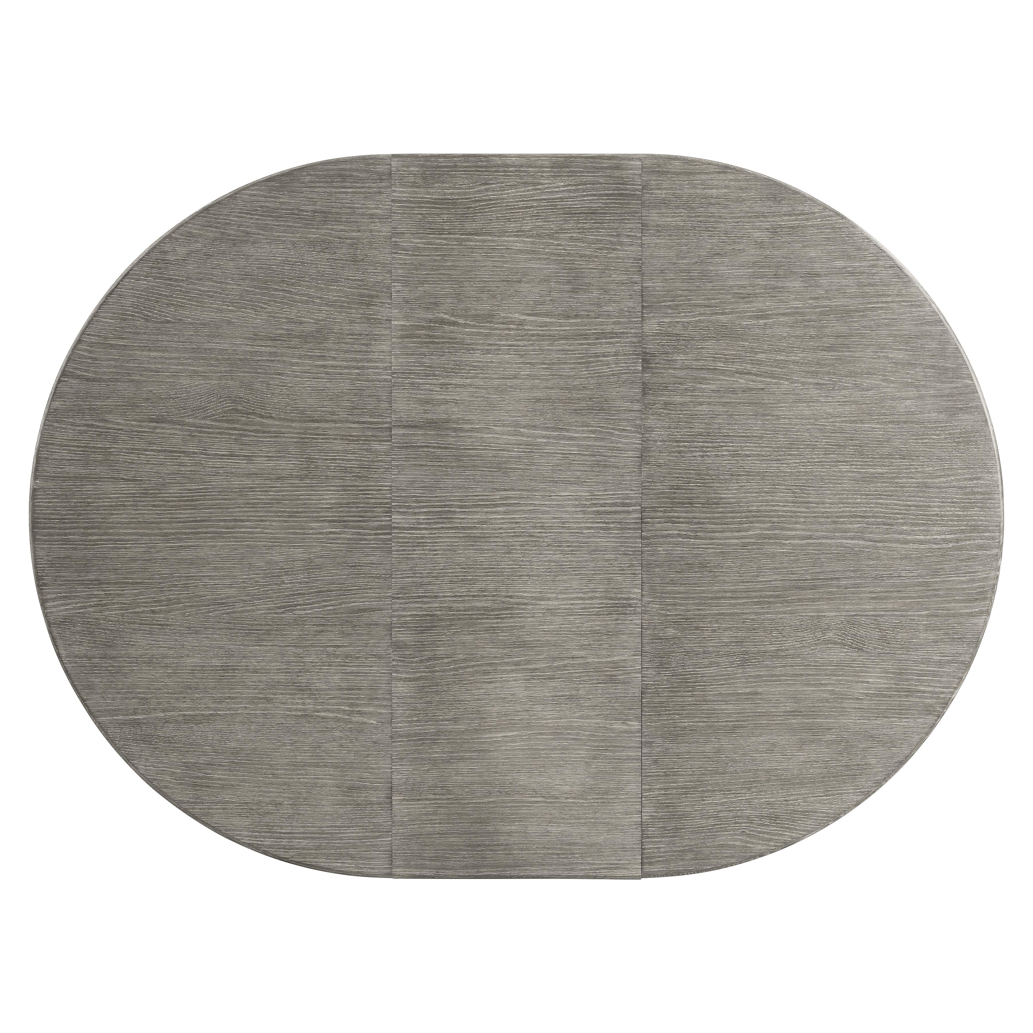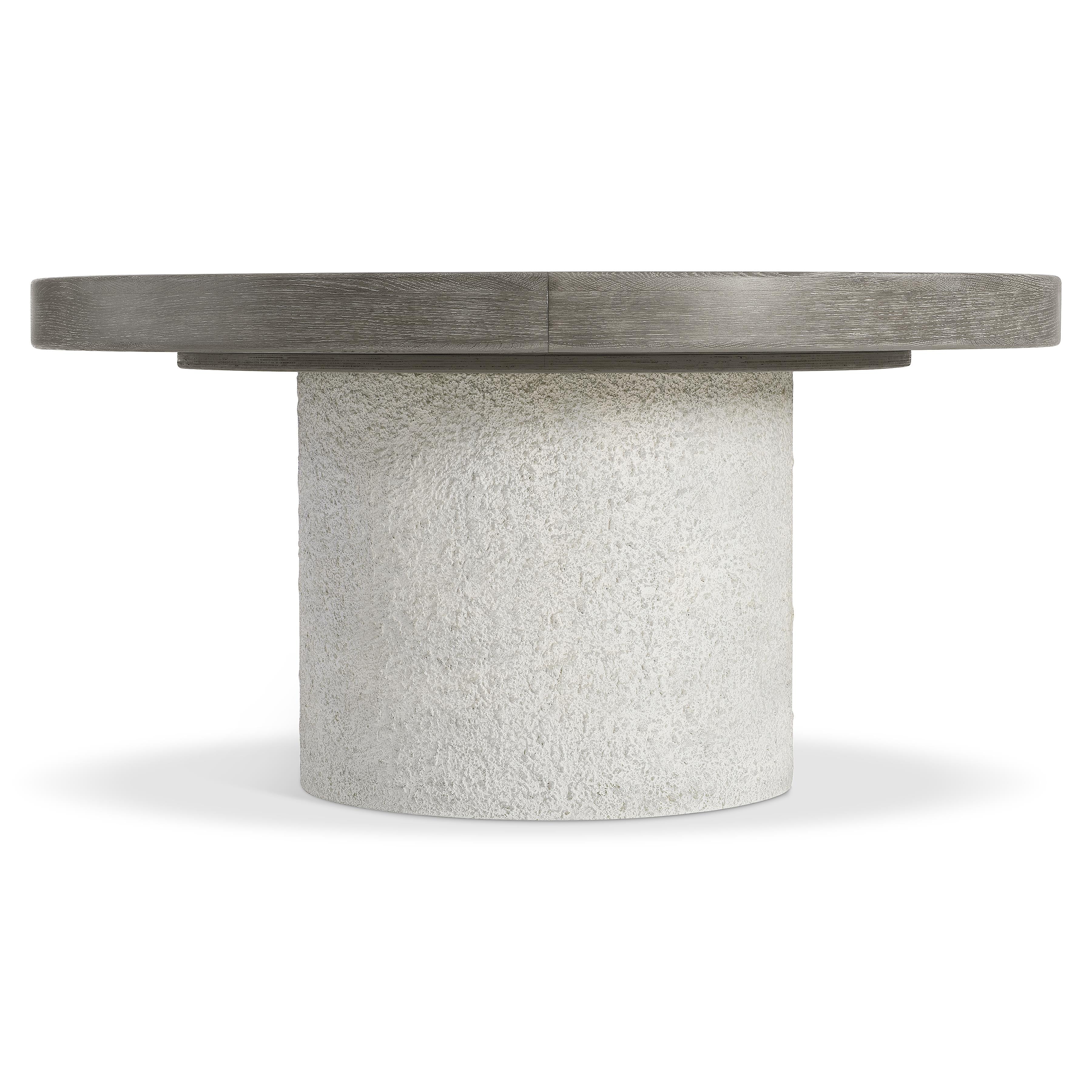 Simple forms are refashioned into an alluring design for the Monolith dining table. A circular faux stone pillar showcases beautiful texture in the Millstone finish. A round top in Puma-finished wood can be expanded to an oval shape with the addition of one leaf.