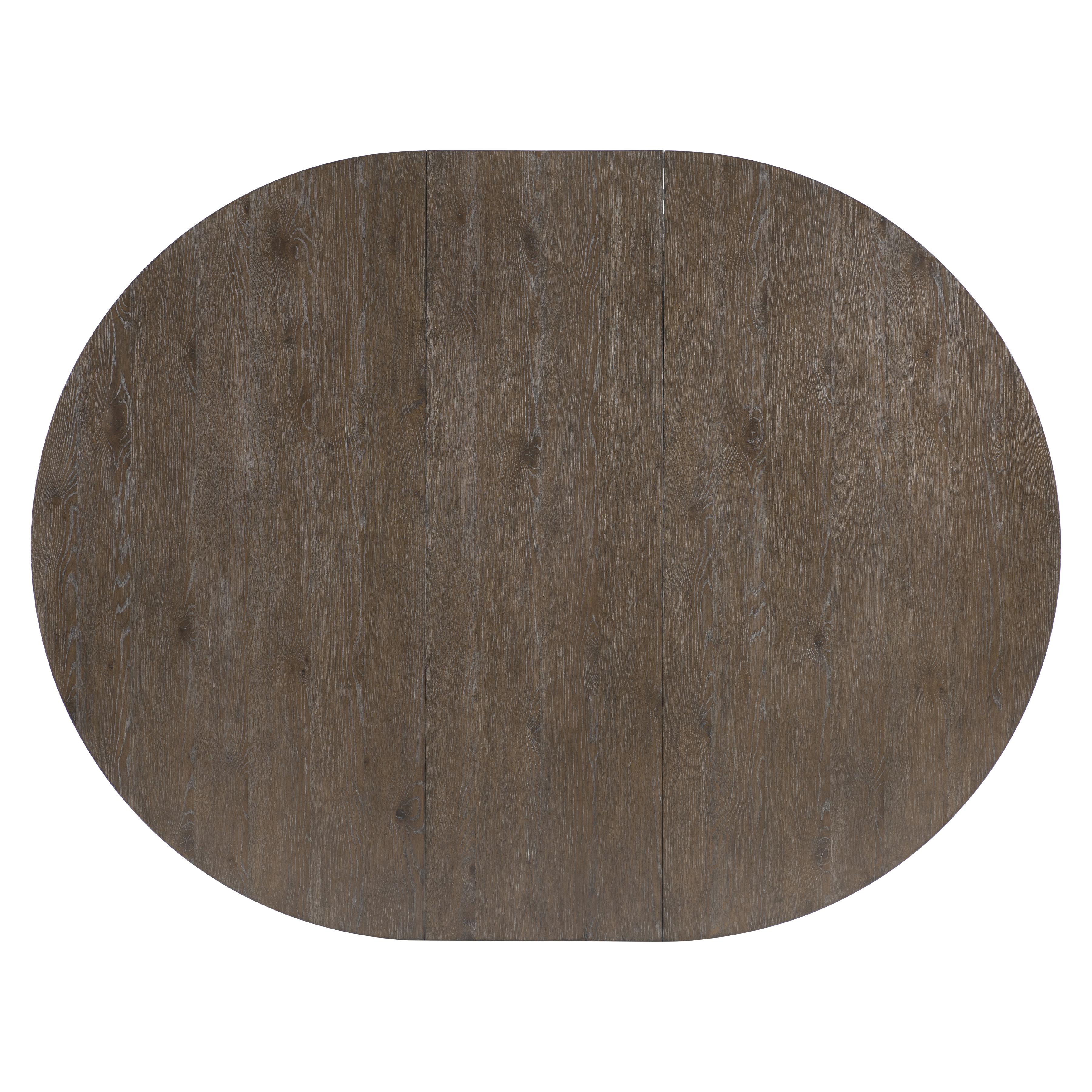 Inspired by the architectural style of Frank Lloyd Wright, the Outline dining table highlights the bold forms and simple lines of the Arts and Crafts movement. Deeply textured wood finished in Cassel is fashioned into geometric shapes that showcase craftsmanship. Rectilinear panels bisect for the base, supporting a bold round top.