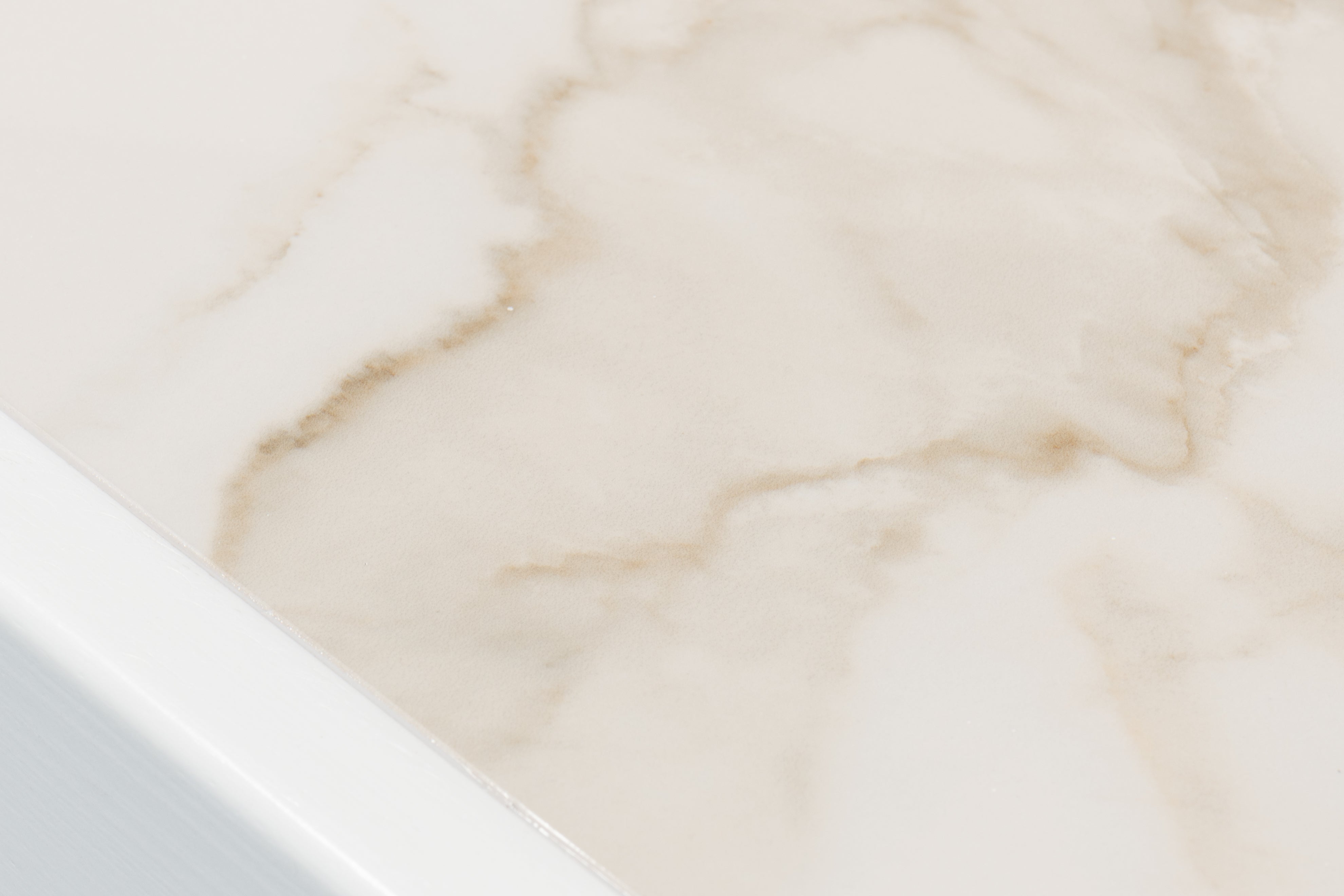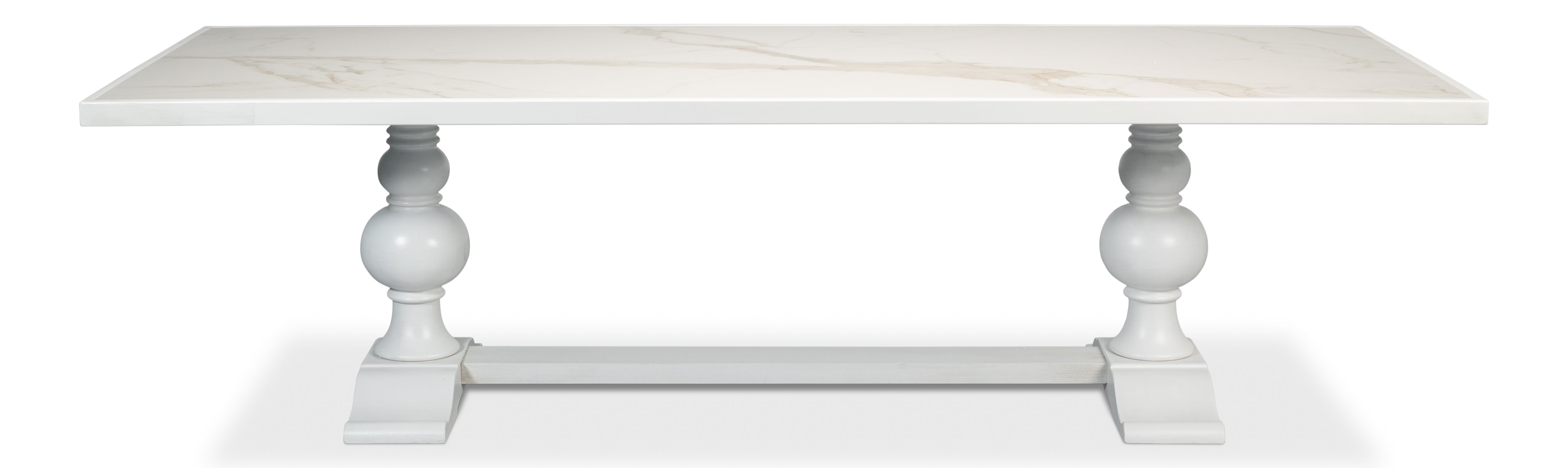 The beautiful trestle base in Cortina White finish supports an unexpected porcelain top fashioned to resemble marble.