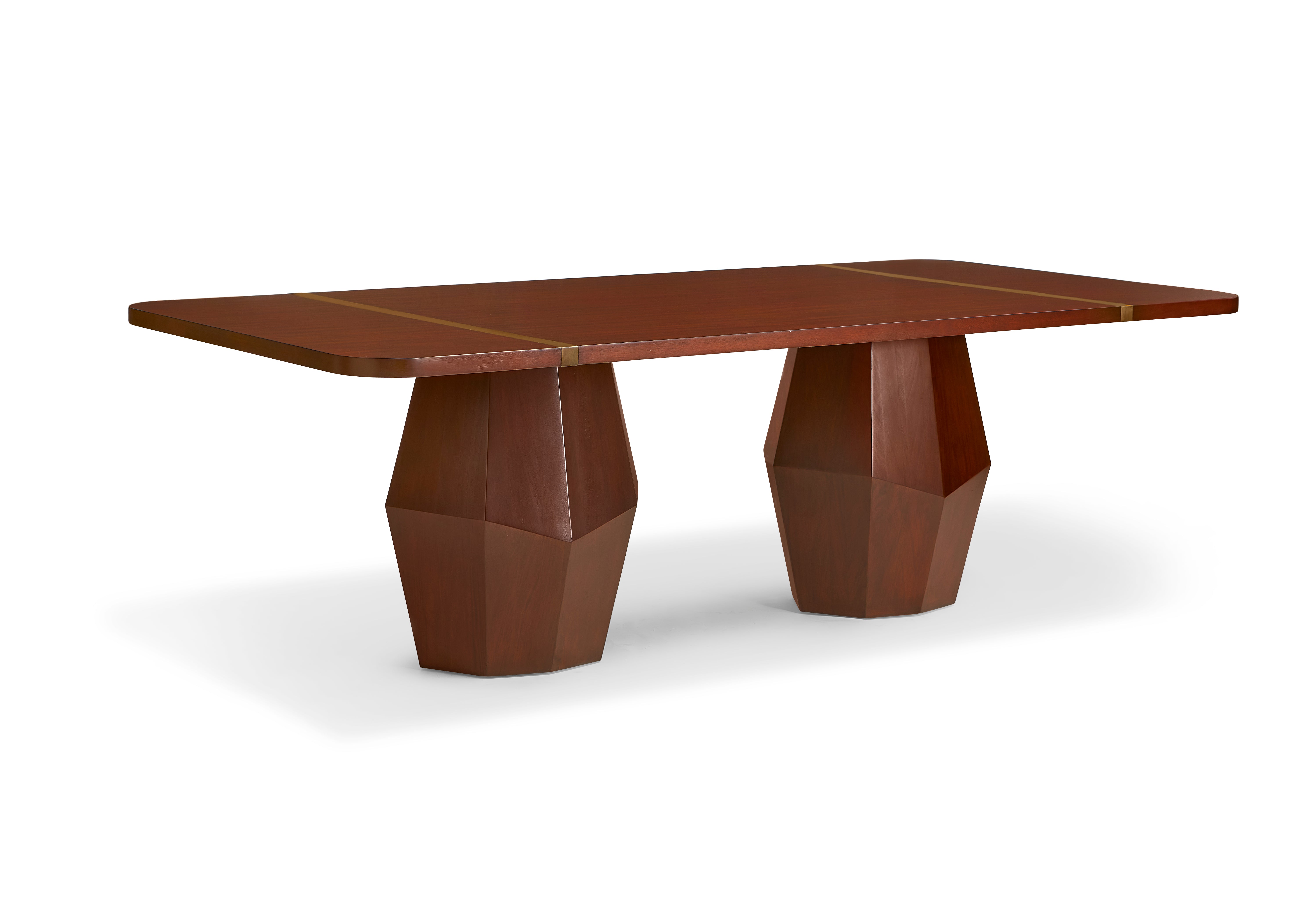 Contemporary mahogany dining table with geometric bases, finished in rich mahogany finish. Antique brass finished band inlay. Corey Damen Jenkins Collection.