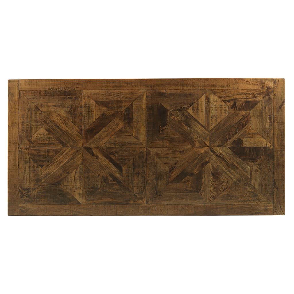 An intricately crafted collection of dining pieces, St. Florian silhouettes showcase hand-applied inlaid designs of various woods on the tabletops and drawer fronts. Finished in a Charred Ecru, the vivid marquetry design elements are complimented by natural brass details.