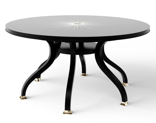 If you’re ready to make a style statement, this is the dining table for you. Its handsome presence is illuminated with a Satin Ebony finish highlighted with a silkscreened starburst pattern in Caramel, Sterling Silver, and Harvest Bronze. This spectacular tri-colored star design was inspired by the effect of a total solar eclipse with beams of light radiating outward. At its base, six shapely legs are capped with metal ferrules in Whisper of Gold—adding another layer of luxury.