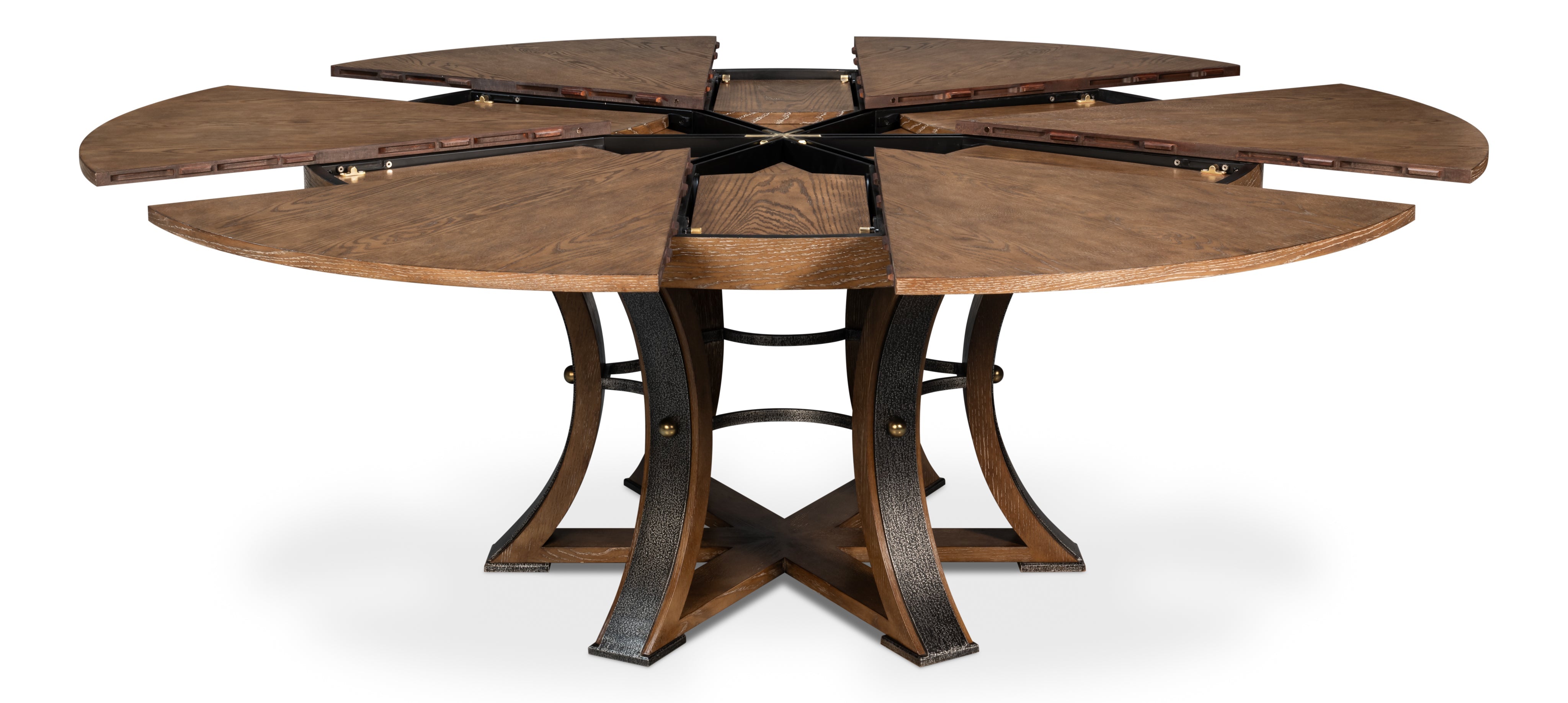 The Tower Jupe Table is a standout with handcrafted metal bands to strenghten the horizontal and vertical support. The understated geometric base makes it versatile eoungh to fit any design style. Featuring a self-storing expansion mechanism crafted from extruded aluminum Jupe tables expand effortlessly, providing both smooth operation and simplified assembly.