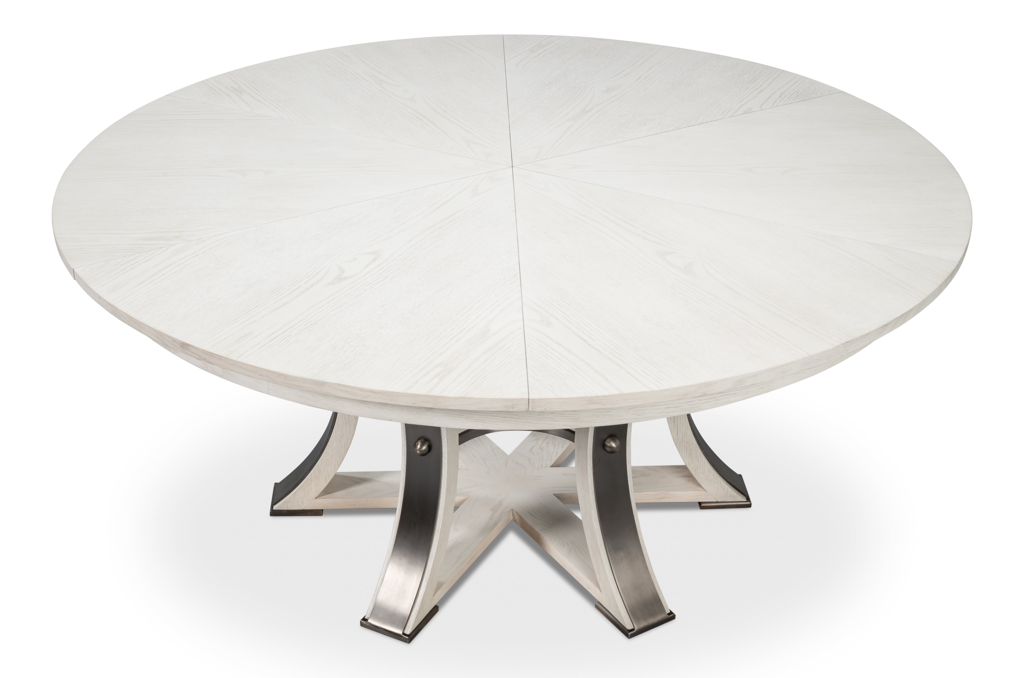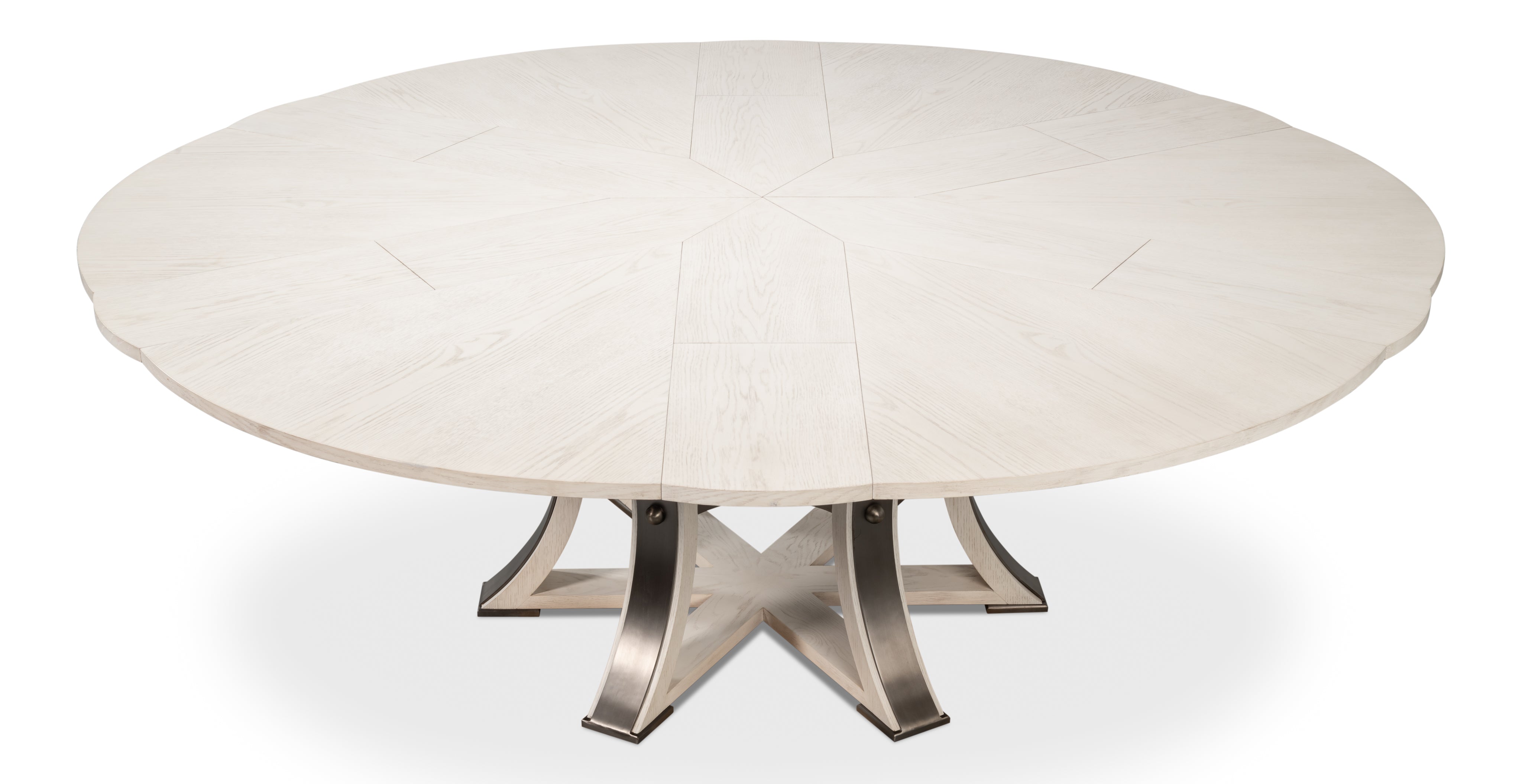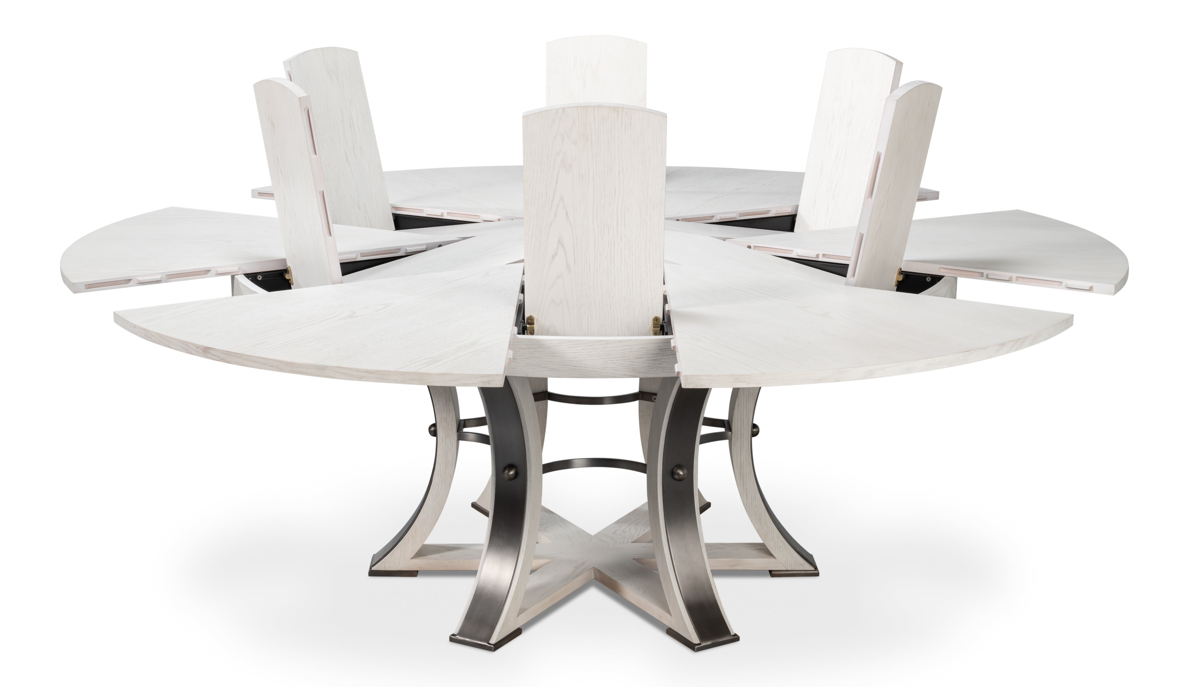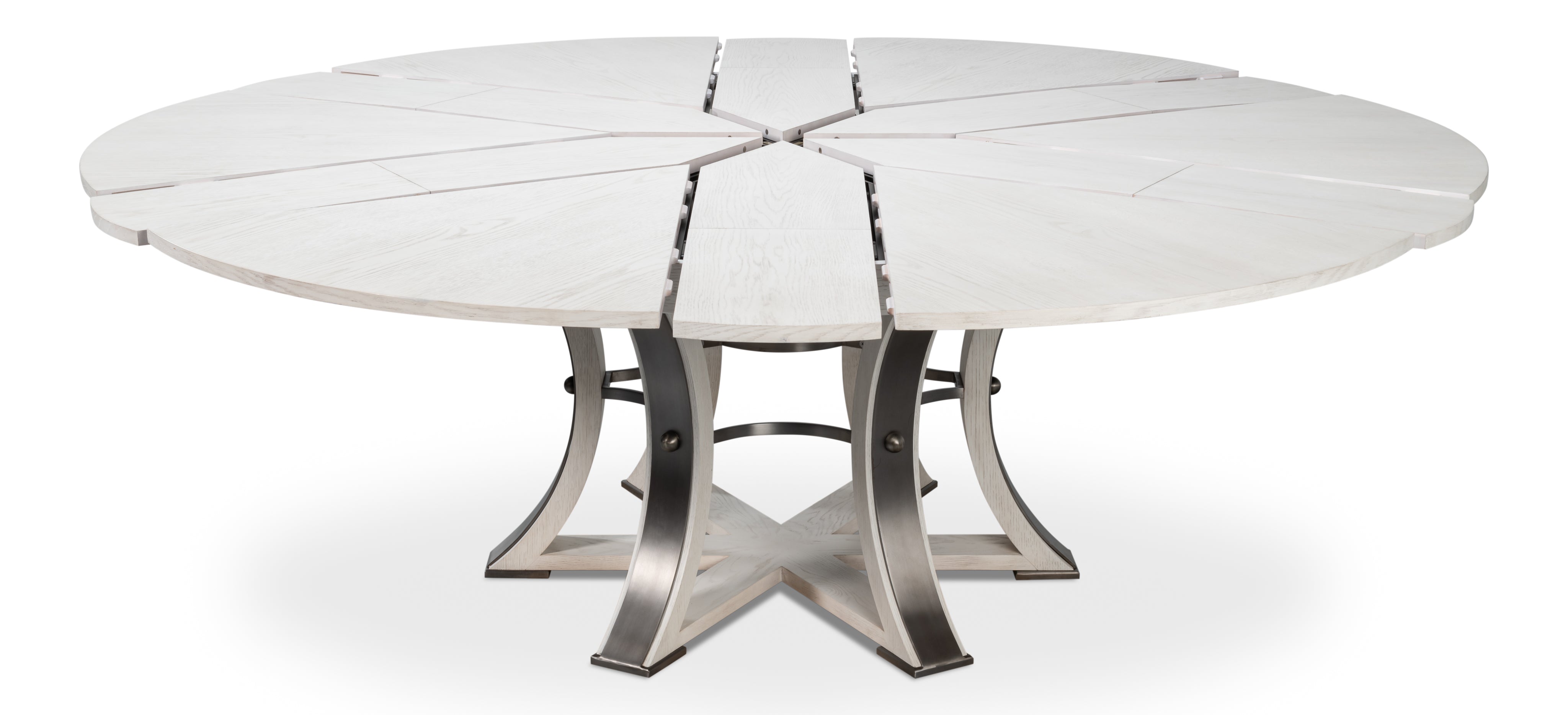 The Tower Jupe Table is a standout with handcrafted metal bands to strengthen the horizontal and vertical support. The understated geometric base makes it versatile enough to fit any design style. Featuring a self-storing expansion mechanism crafted from extruded aluminum Jupe tables expand effortlessly, providing both smooth operation and simplified assembly.