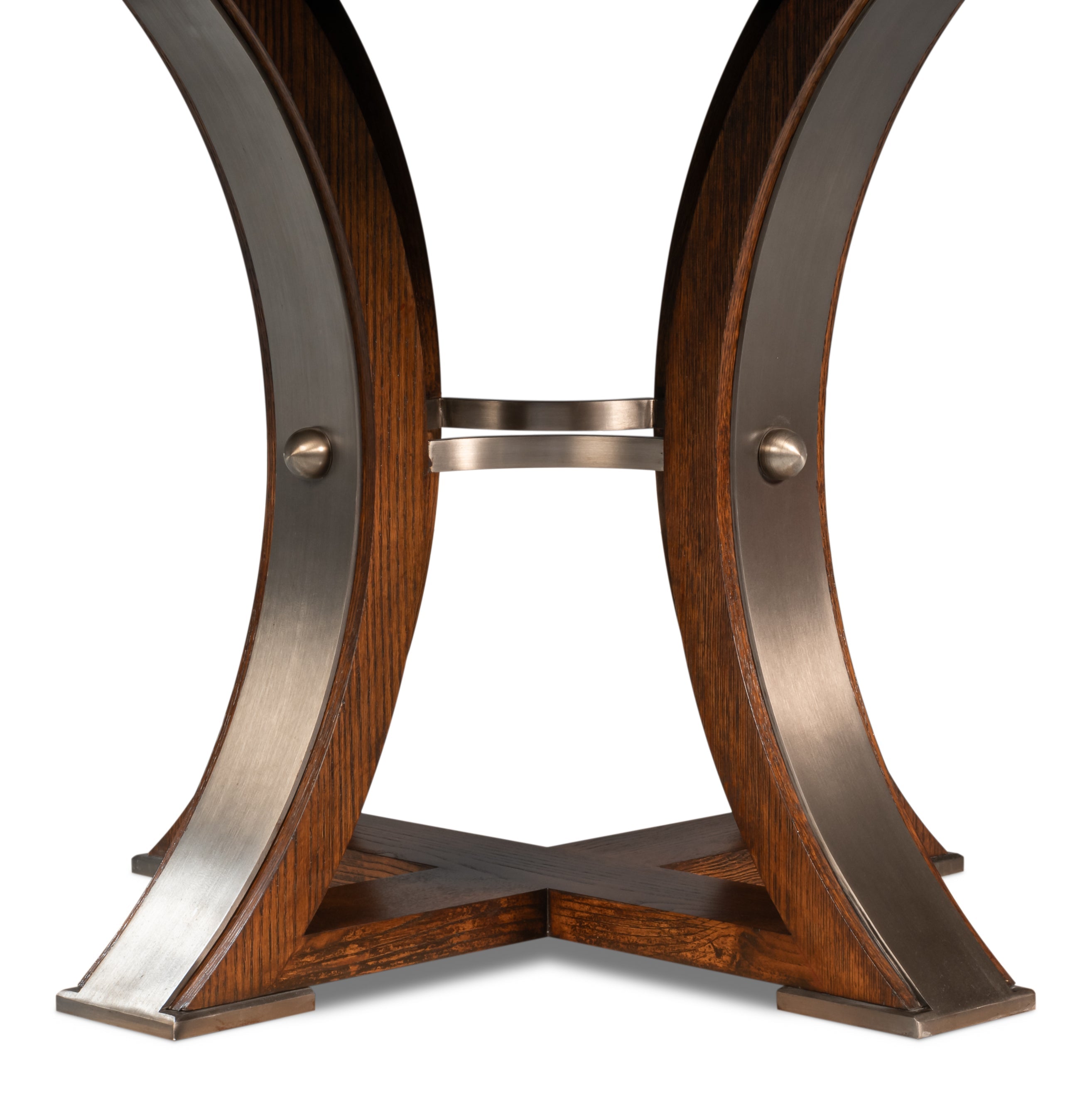 The Tower Jupe Table is a standout with handcrafted metal bands to srengthen the hoizontal and vertical support.The understated geometric base make it versatile enough to fit any design style. Featuring a self-storing expansion mechanism crafted from extruded aluminum Jupe tables expand effortlessly, providing both smooth operation and simplified assembly.
