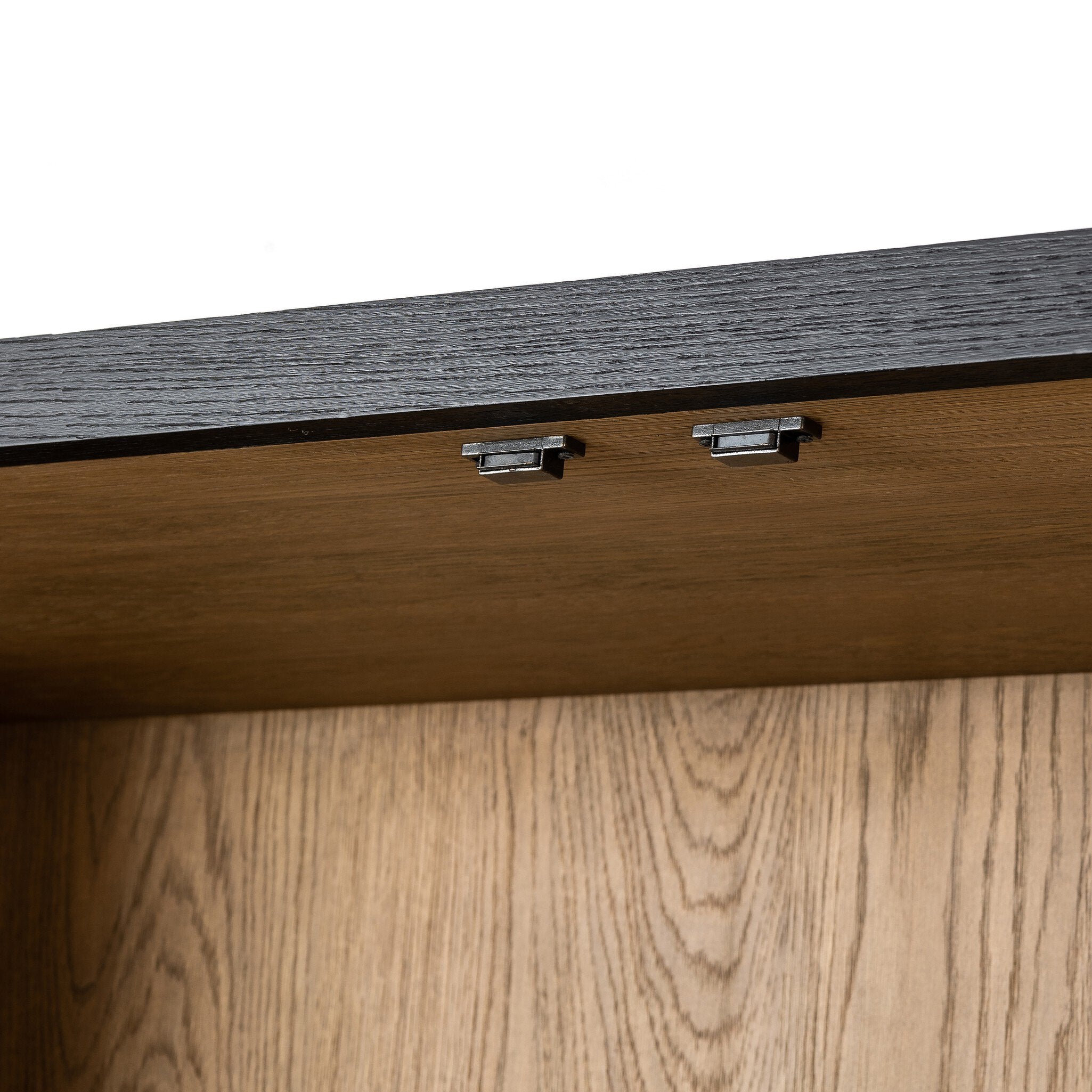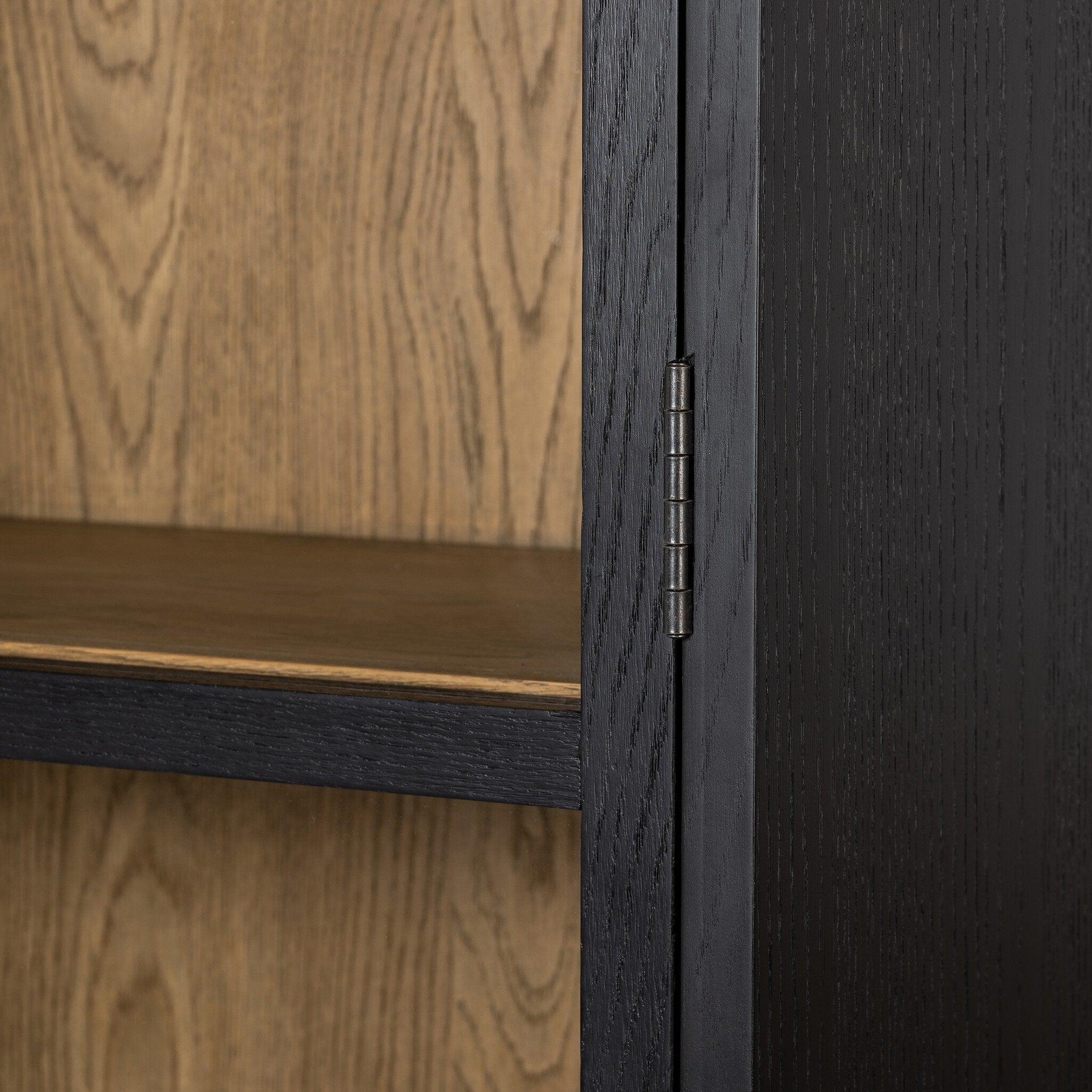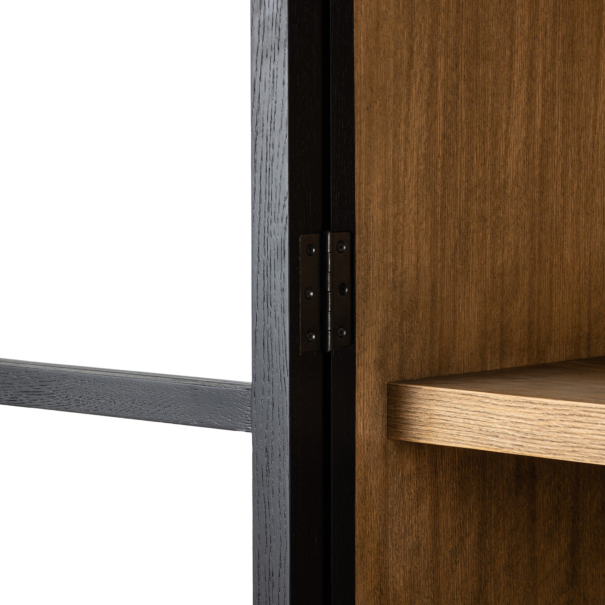 Matte black drifted oak frames lighter interior shelving for subtle but striking contrast. Glass doors allow for prized possessions to dazzle on full display while spacious cabinets add out-of-view storage.