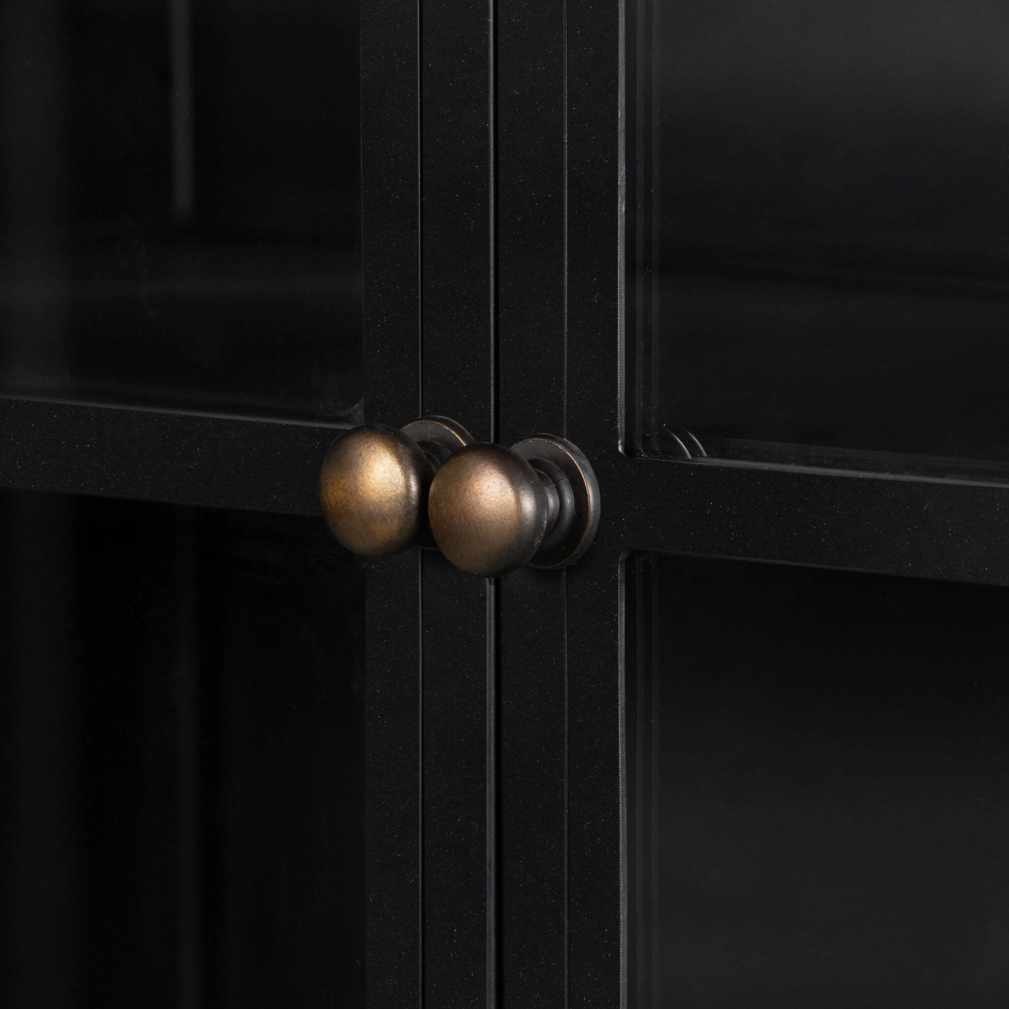 Display barware, books and other treasures in stately, streamlined cabinetry inspired by the traditional shadowbox. Solid iron sheeting is finished in a modern matte black with contrasting brass hardware, plus dual drawers for out-of-sight storage.